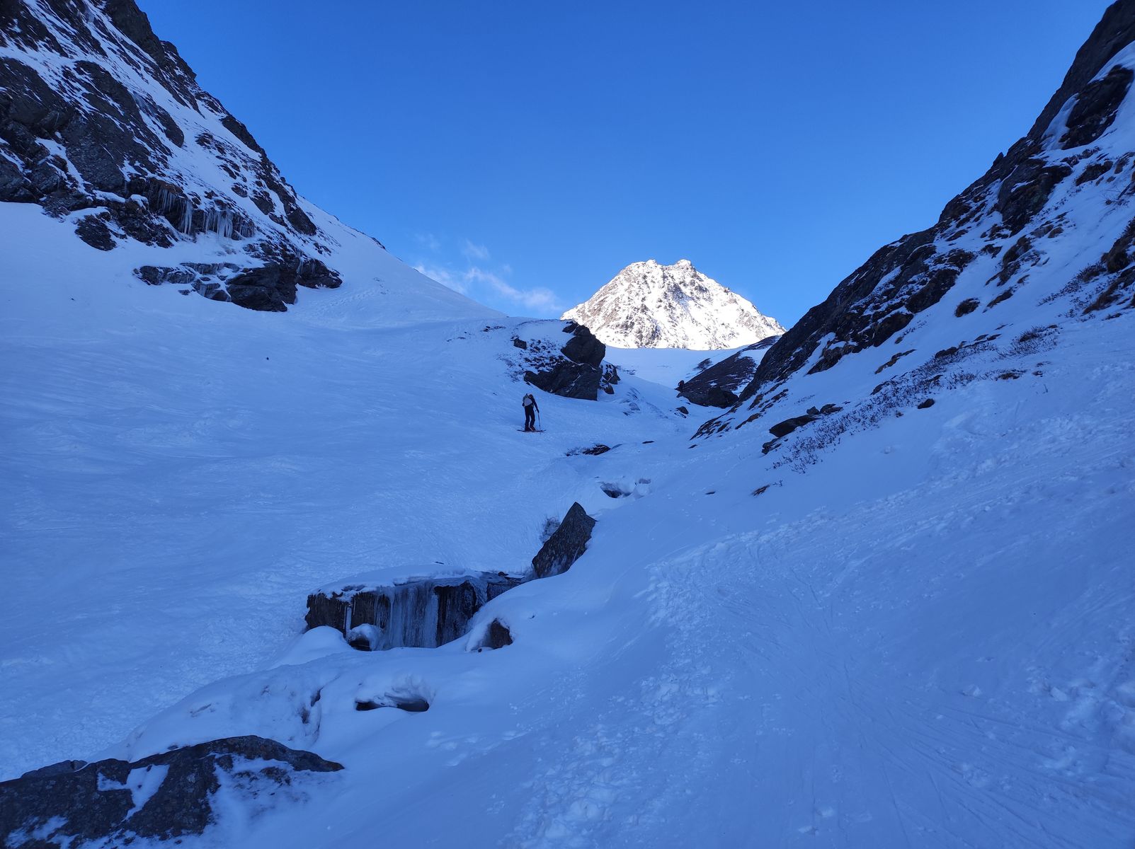 Nach gemütlichem Einlaufen ging es in der Unteren Zwing mehr zur Sache als ich gedacht hätte. Sehr hart, wenig Schnee, viel Bach, Harscheisen Pflicht. Da hab ich einen klassischen Fehler gemacht und nicht an einer geeigneten Stelle die Ski abgeschnallt, sondern knapp über dem Bach an einer eisigen Stelle... Ein Kollege mit Steigeisen hat mir dann geholfen, in dieser blöden Position die Ski an den Rucksack zu schnallen. Vielen Dank nochmal dafür!