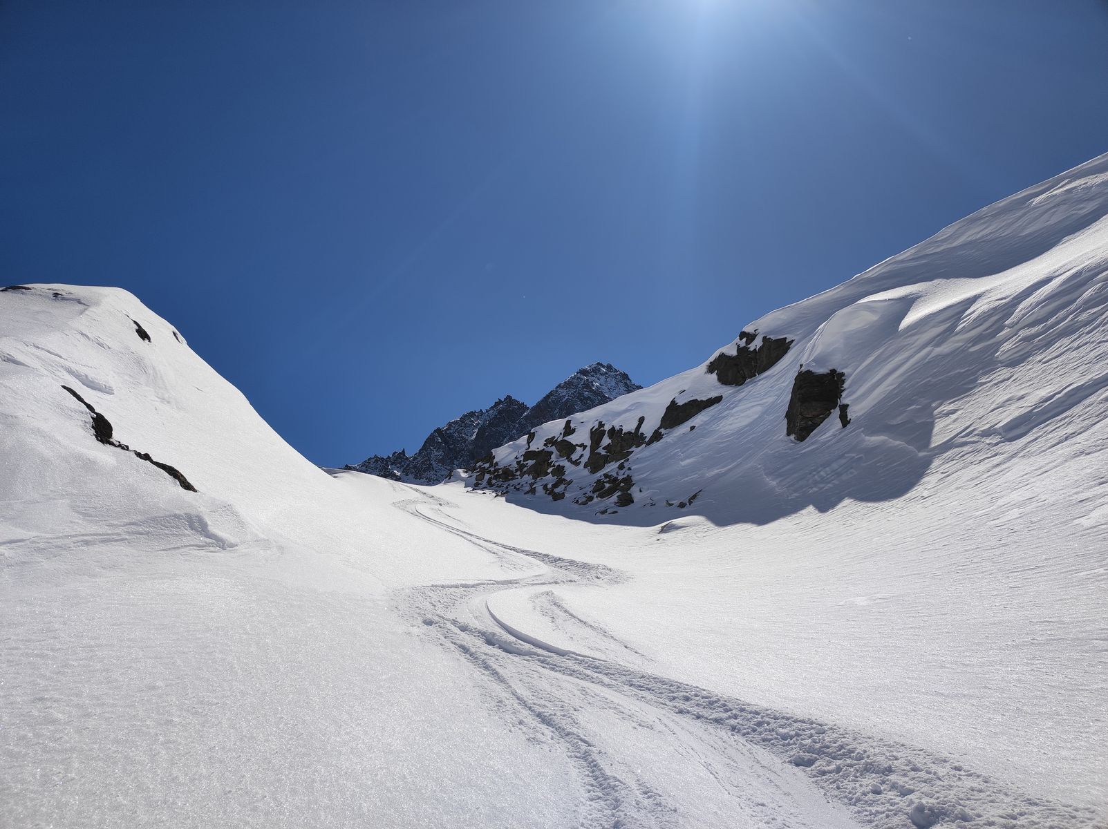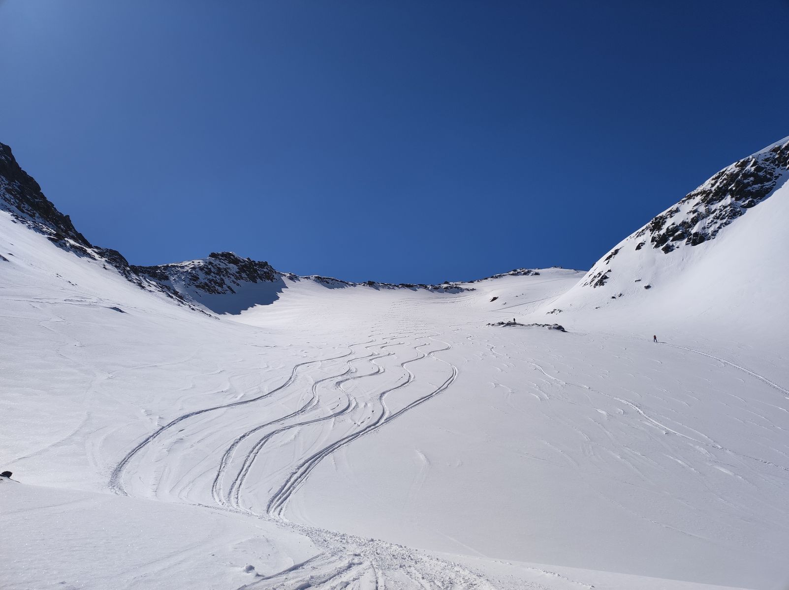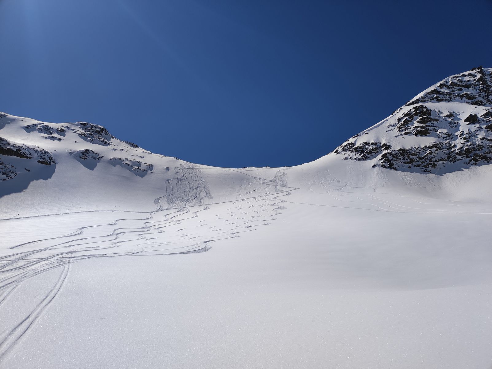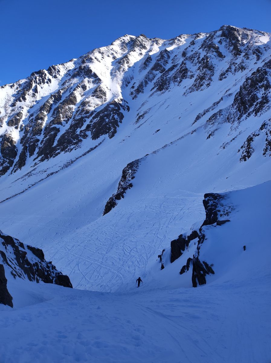Ansonsten aber sehr gute Verhältnisse! Man kann mit Ski auf den Gipfel. Zunächst bin ich auf der Anstiegsroute bis etwa 2650 Meter abgefahren (schöner Pulver, aber natürlich schon etwas verspurt) und anschließend noch auf die Weitkarspitze. Von dort spektakuläre Abfahrt über teils wirklich steile Hänge. Man trifft beim Flachstück oberhalb der Unteren Zwing wieder auf den Normalweg. Schnee: Wechsel zwischen Pulver und Firn.