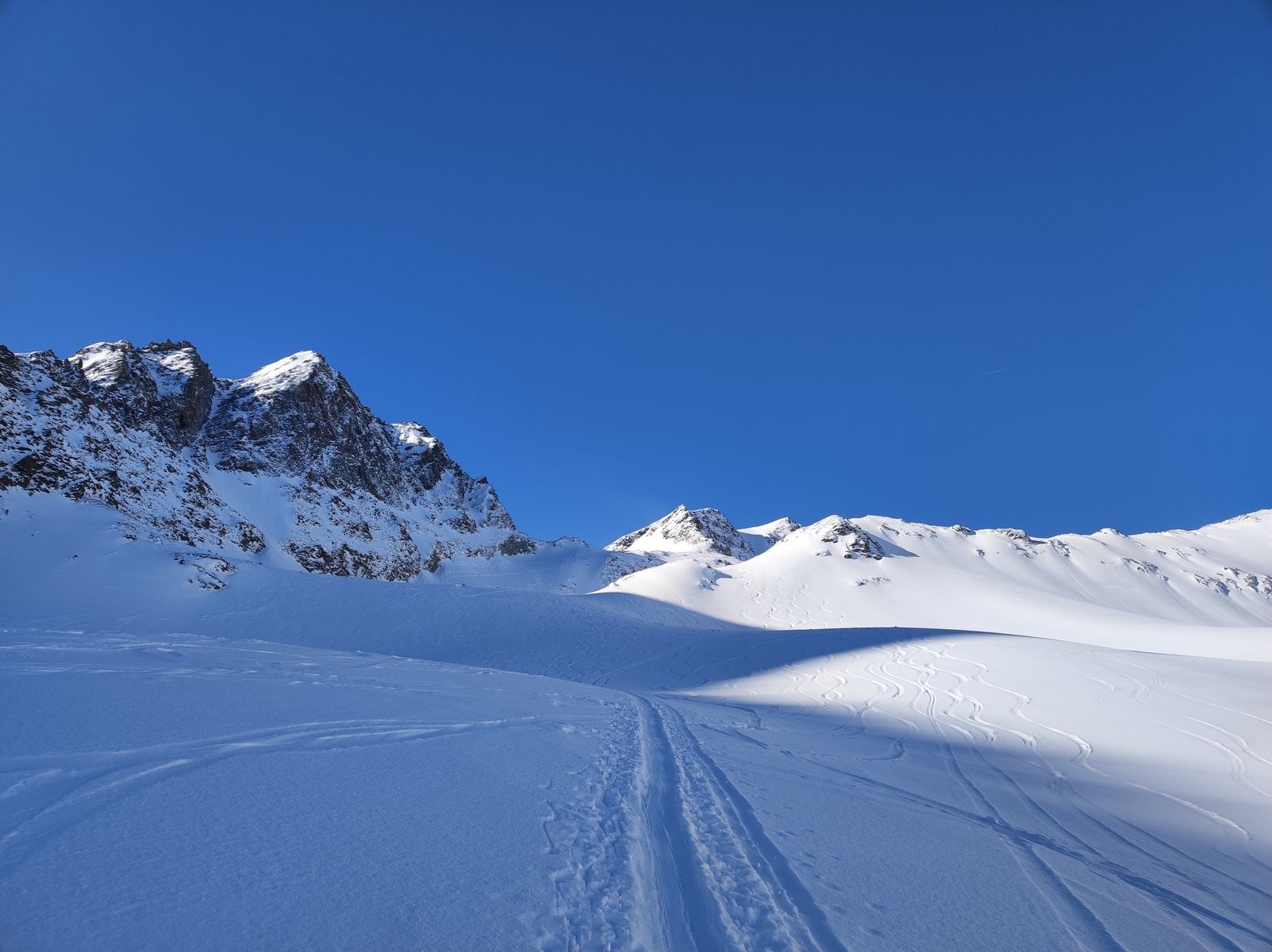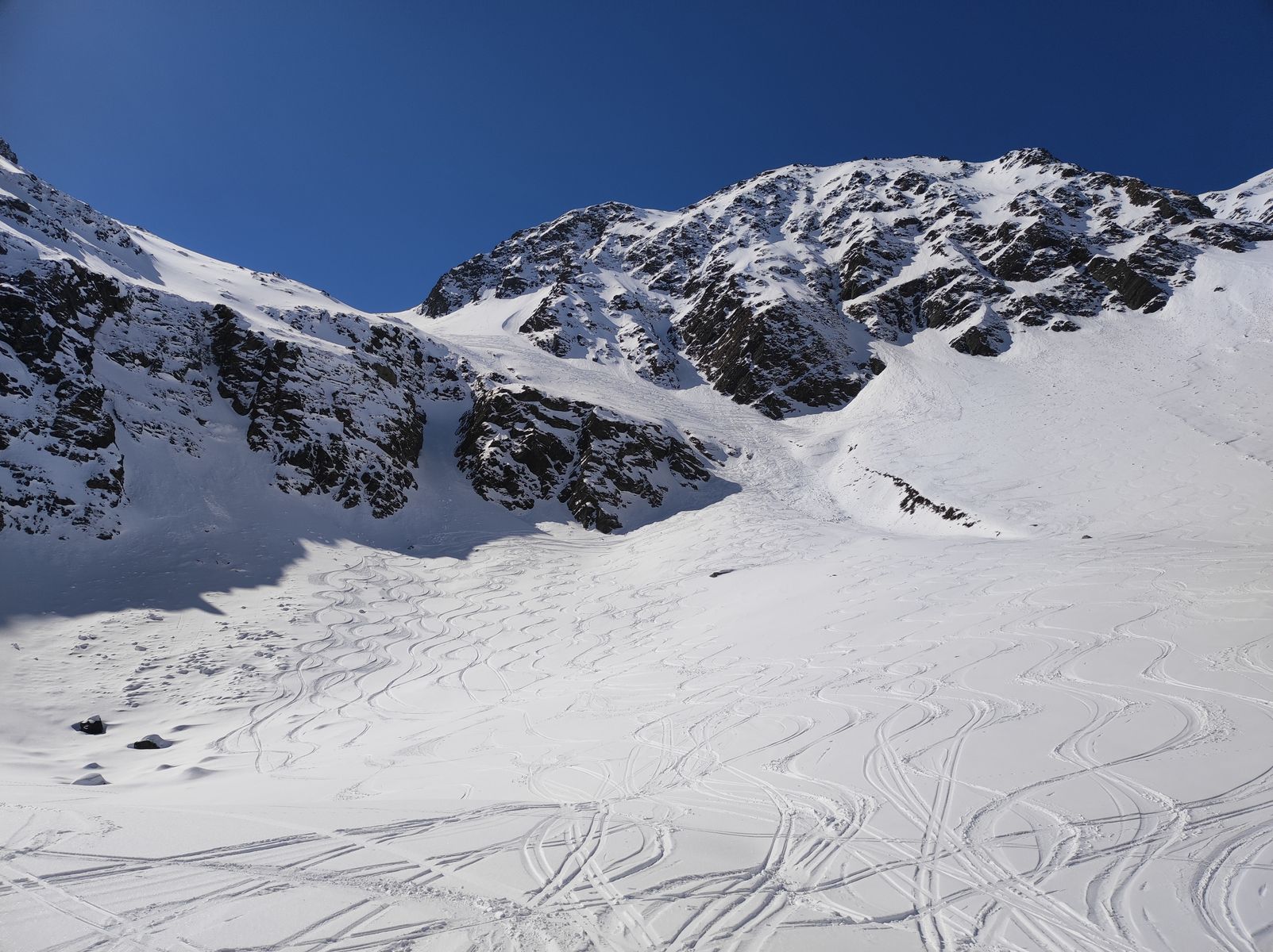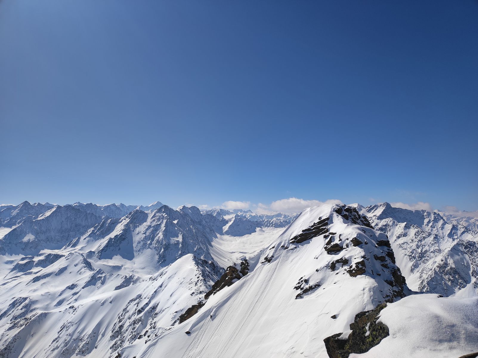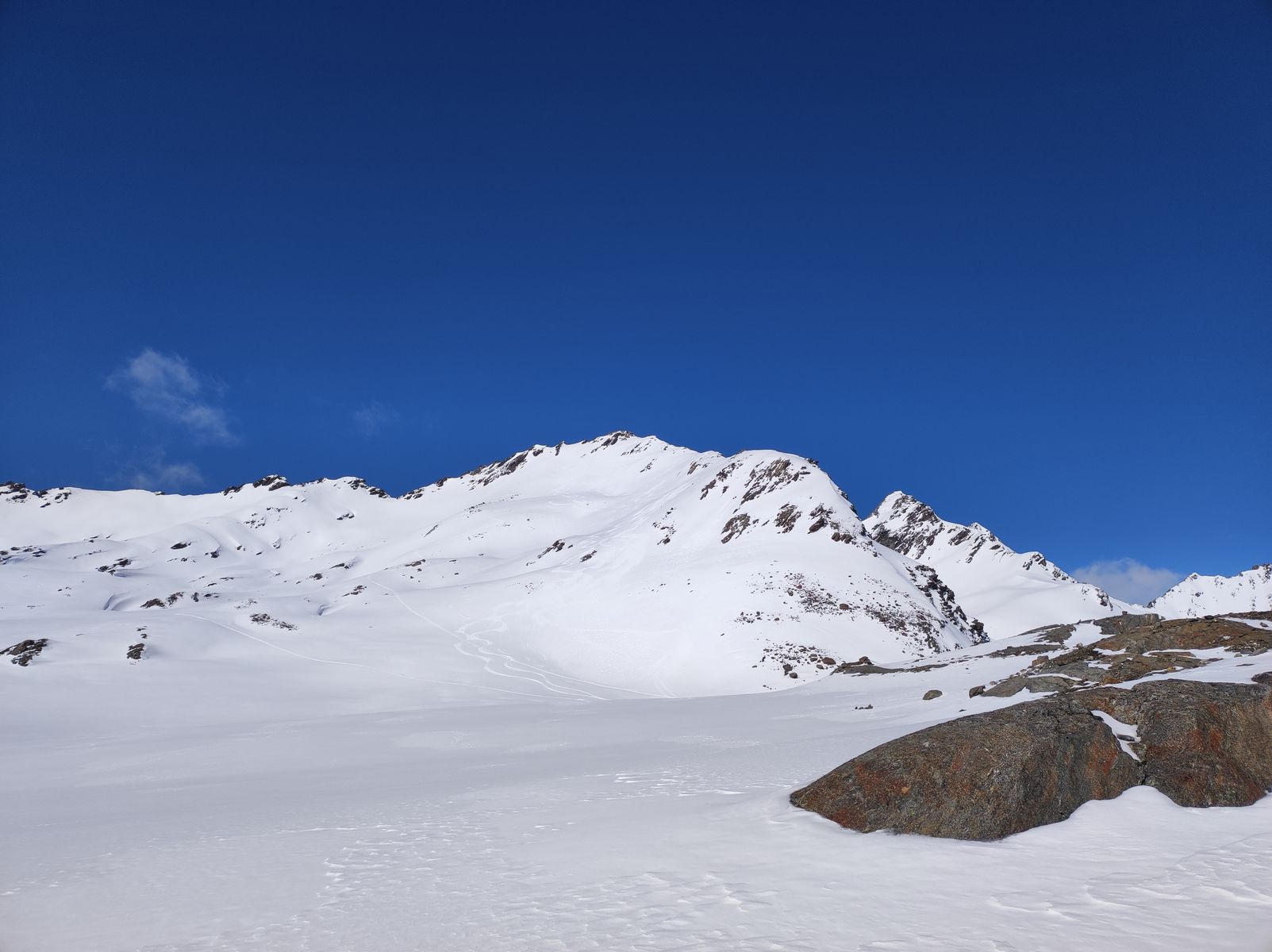 Ansonsten aber sehr gute Verhältnisse! Man kann mit Ski auf den Gipfel. Zunächst bin ich auf der Anstiegsroute bis etwa 2650 Meter abgefahren (schöner Pulver, aber natürlich schon etwas verspurt) und anschließend noch auf die Weitkarspitze. Von dort spektakuläre Abfahrt über teils wirklich steile Hänge. Man trifft beim Flachstück oberhalb der Unteren Zwing wieder auf den Normalweg. Schnee: Wechsel zwischen Pulver und Firn.
