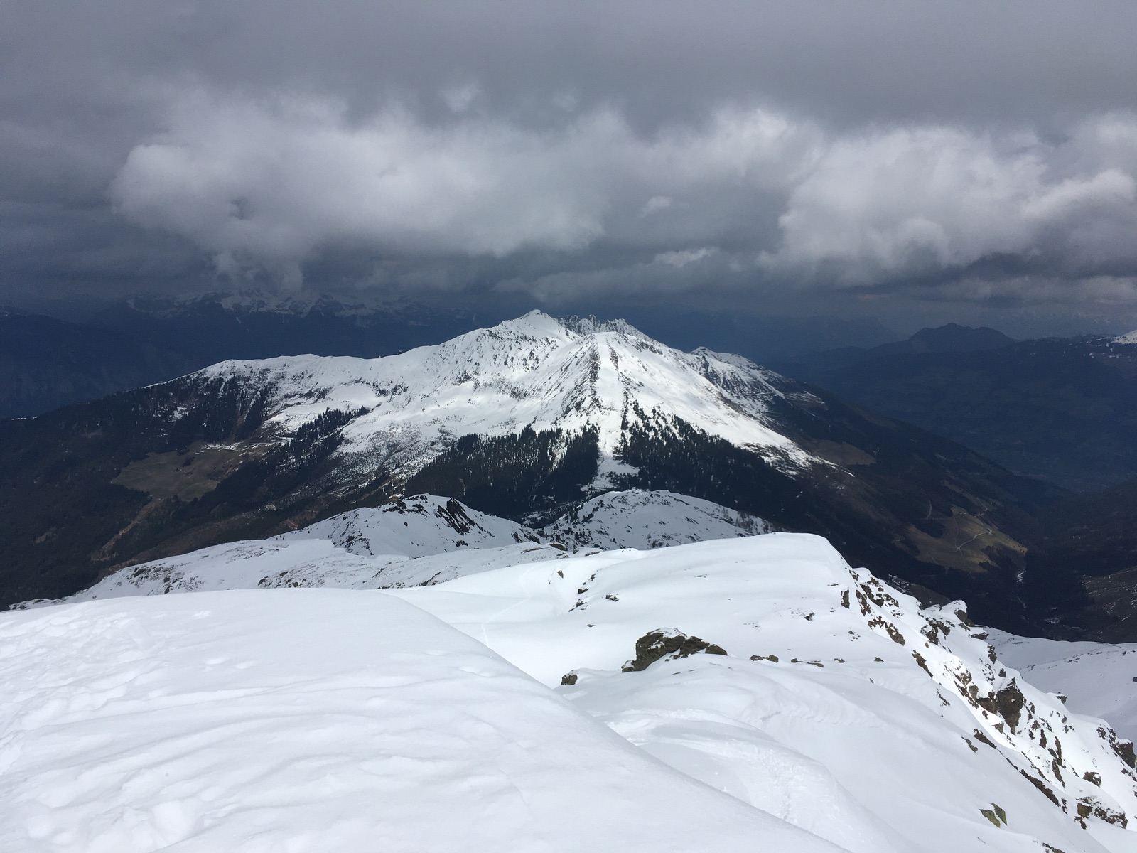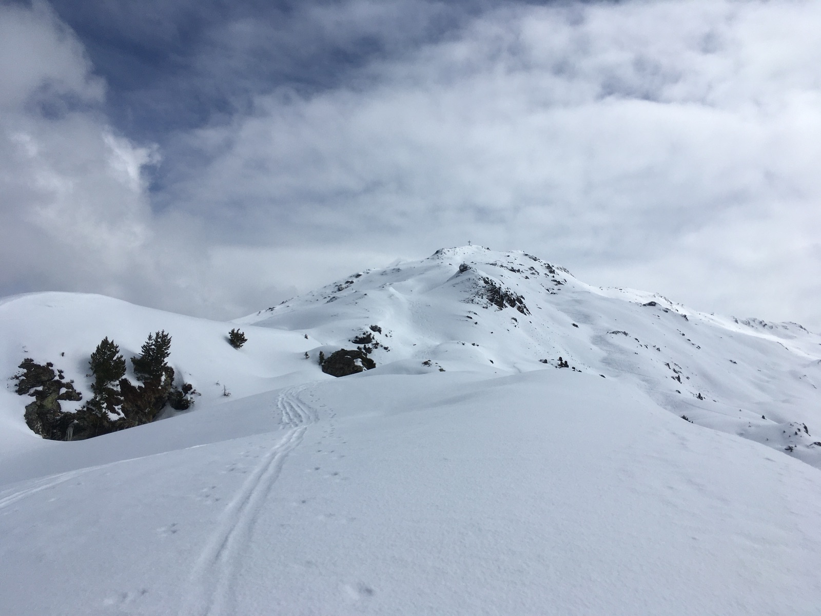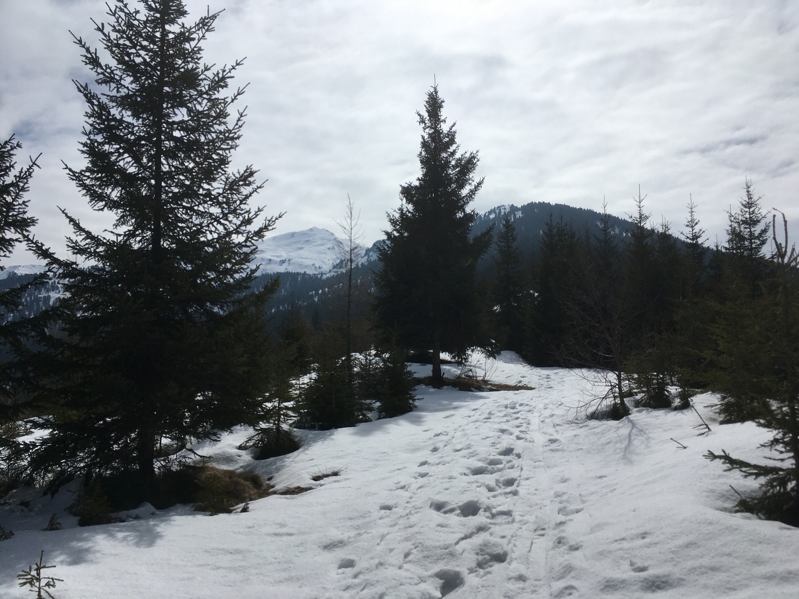 Nach der Piste habe ich mich für den Kammweg über Nonsberg und Nonsjöchl entschieden. Hier liegt im Wald teilweise sehr wenig Schnee, 2x abschnallen mit sicher rasch zunehmender Tendenz. Mehr Schnee hat es, wenn man sich nicht entlang des Sommerwegs hält, sondern soweit möglich in der Nordflanke. Insgesamt aber gut machbar, allzumal es nur die Aufstiegsroute ist.