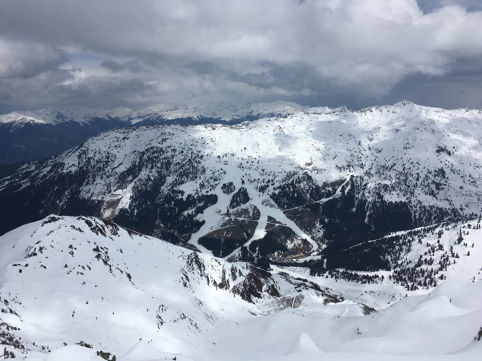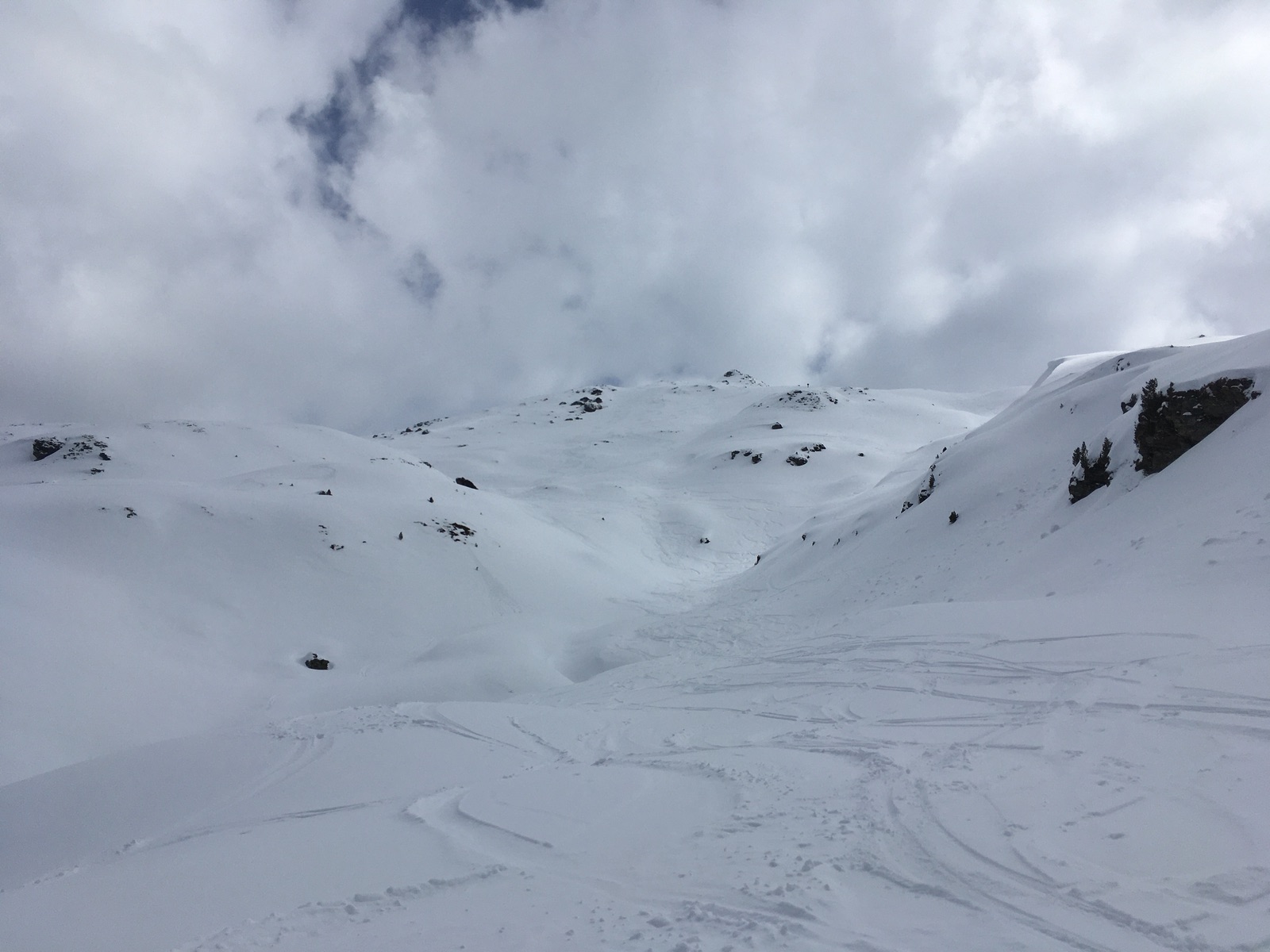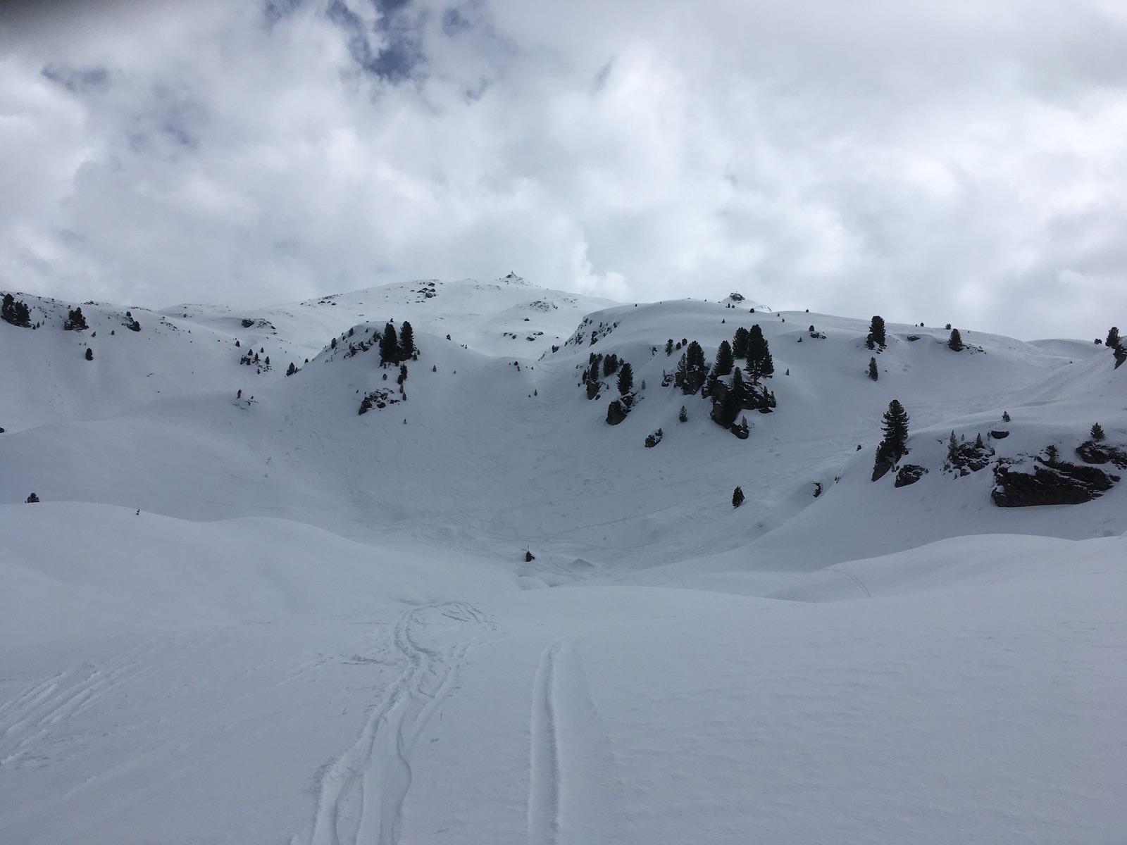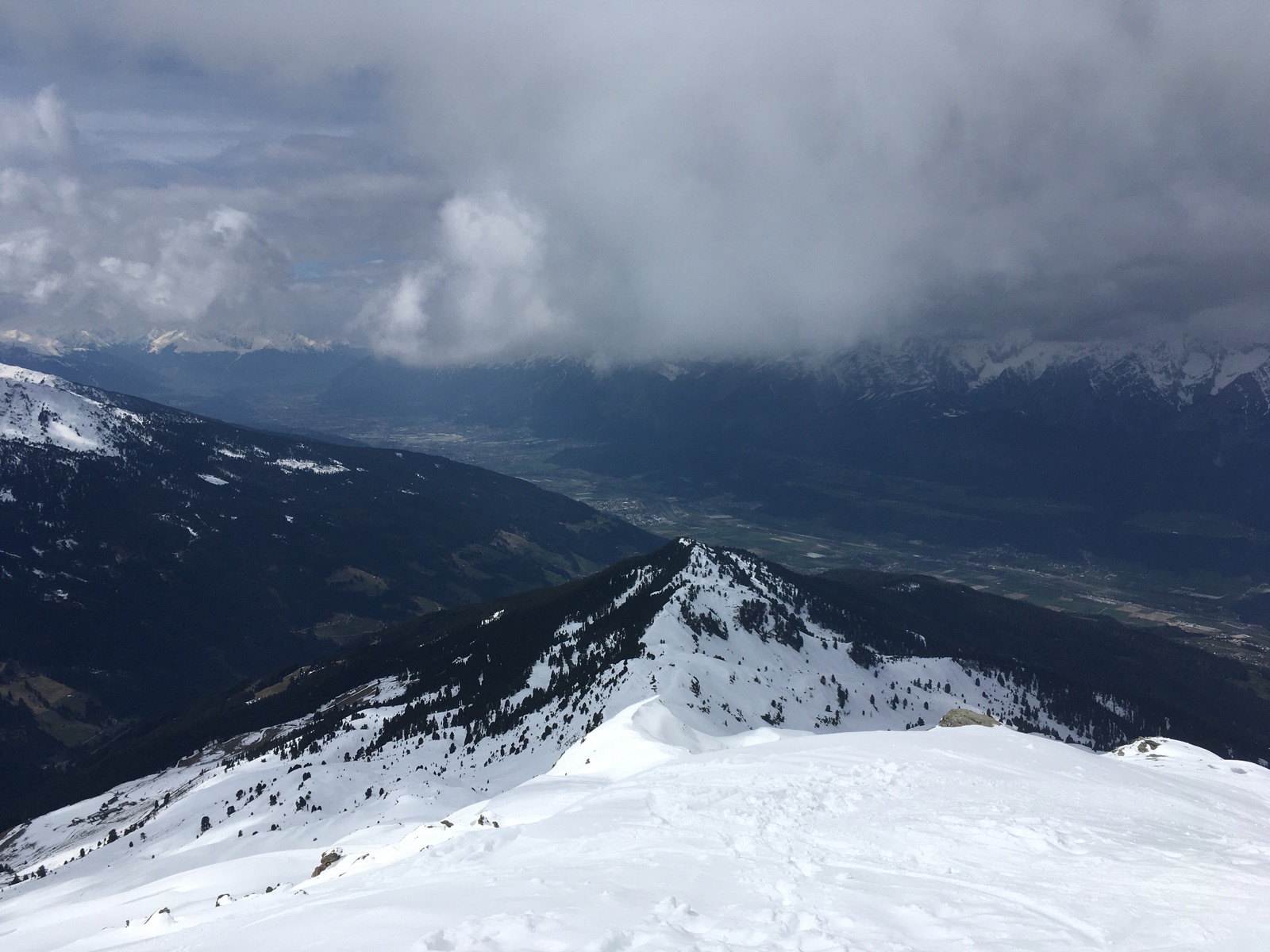 Landschaftlich ist die Tour, gerade auch der Weg über den Kamm, wirklich schön. Und um diese Jahreszeit hat sich der sonst übliche Tourengeherrummel auch gelegt, ich traf und sah nur wenige. Abfahrt über die Lafaster-Alm ausreichend Schnee, meistens Pulver auf tragendem, allerdings etwas inhomogenem Harschdeckel - insgesamt gut. Schon einige Spuren, aber geländebedingt viel Platz. Man muss nur etwas aufpassen, dass man Höhe der Almen nicht auf dem mittleren Rücken landet, von dem man nur relativ schlecht fahrbar wieder herunterkommt.