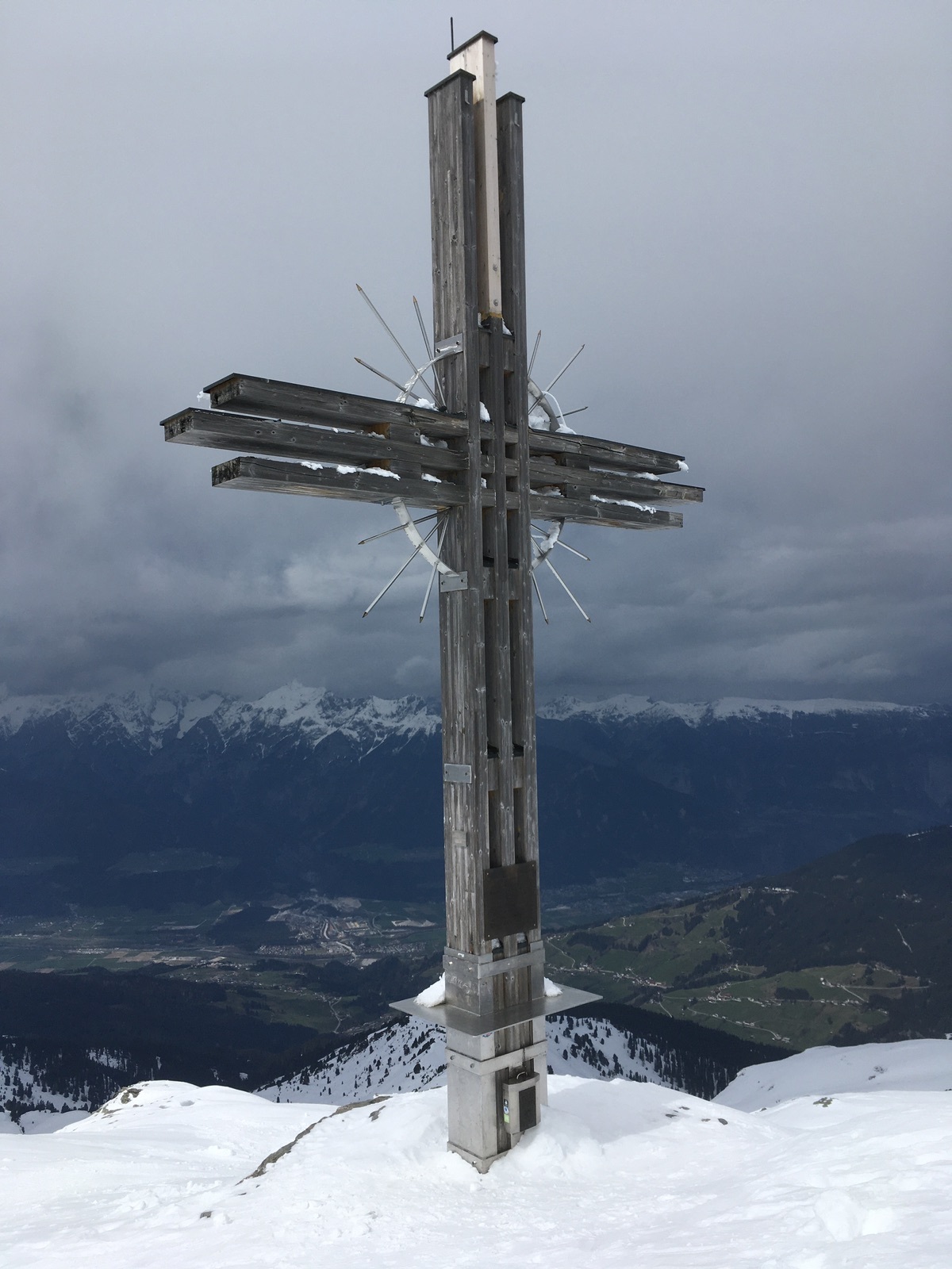 Das riesige Gipfelkreuz auf dem Gilfert - deswegen nähert sich der Gipfel beim Anstieg auch so langsam; hinten das Karwendel, da war es schon schiach: