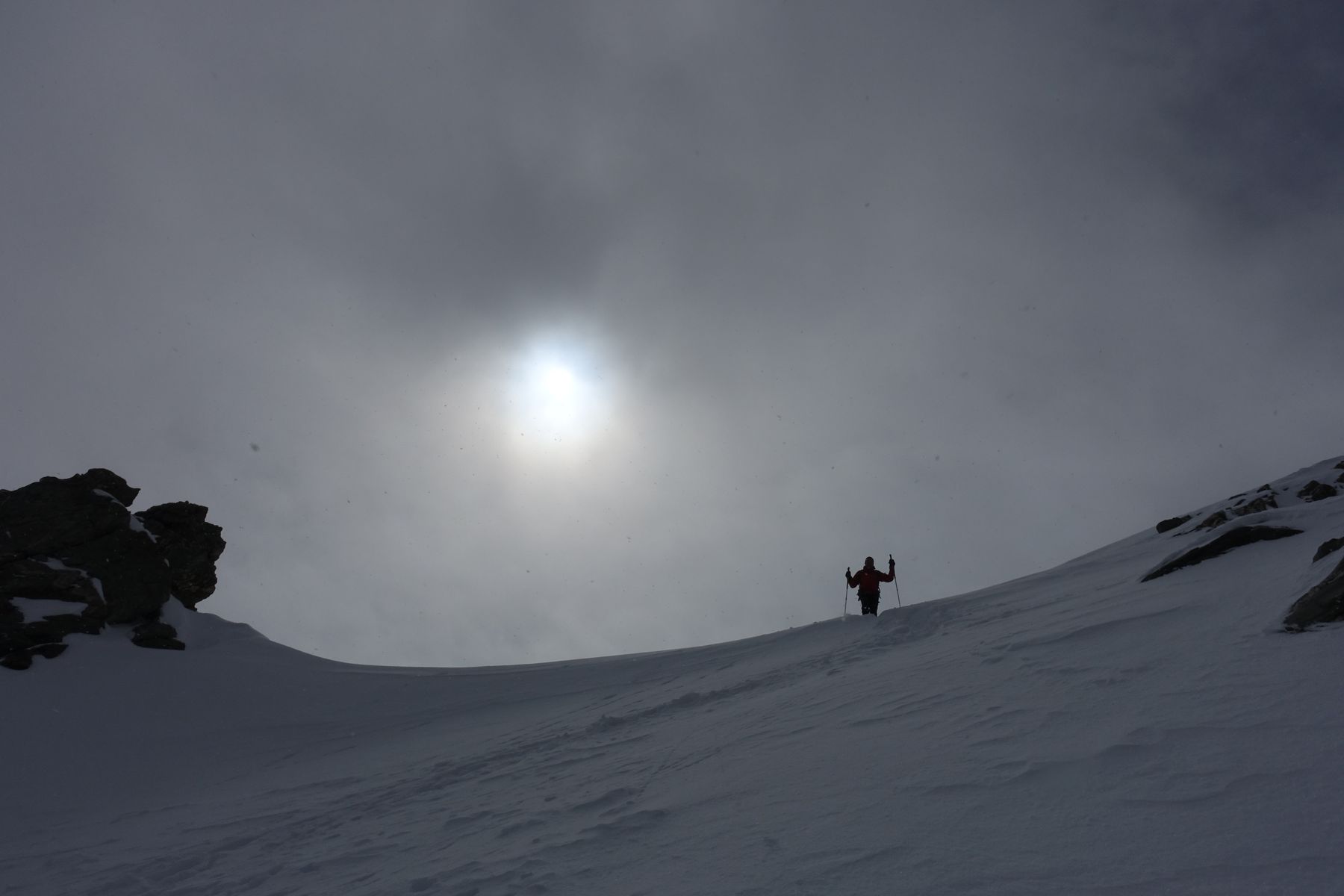 2. Tag: Bedeckter Himmel am Karfreitag zum Piz dal Lej Alv über die Fuorcla Fex Roseg, die letzten Meter mit Steigeisen zum Gipfel bei geringer Sicht und ein paar guten Pulverschneeschwüngen zurück zur Hütte. Schneefall während des restlichen Tages mit deutlich wärmeren Temperaturen als am Tag zuvor.