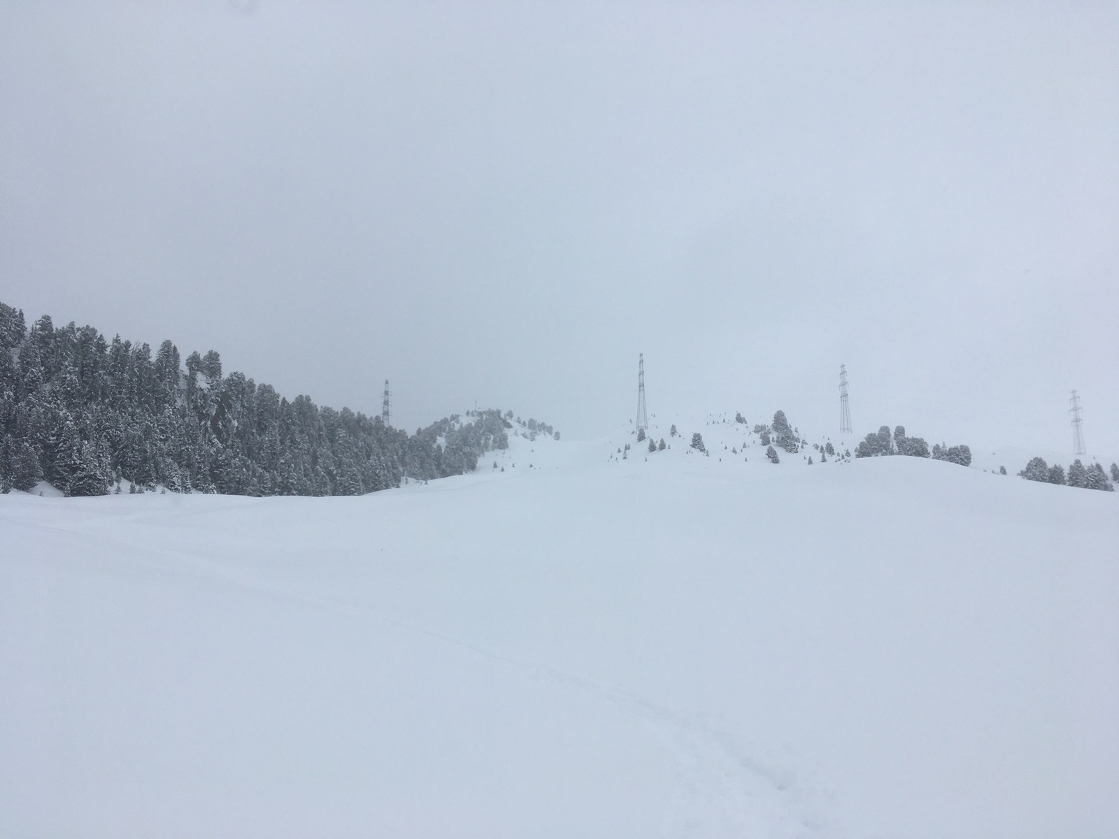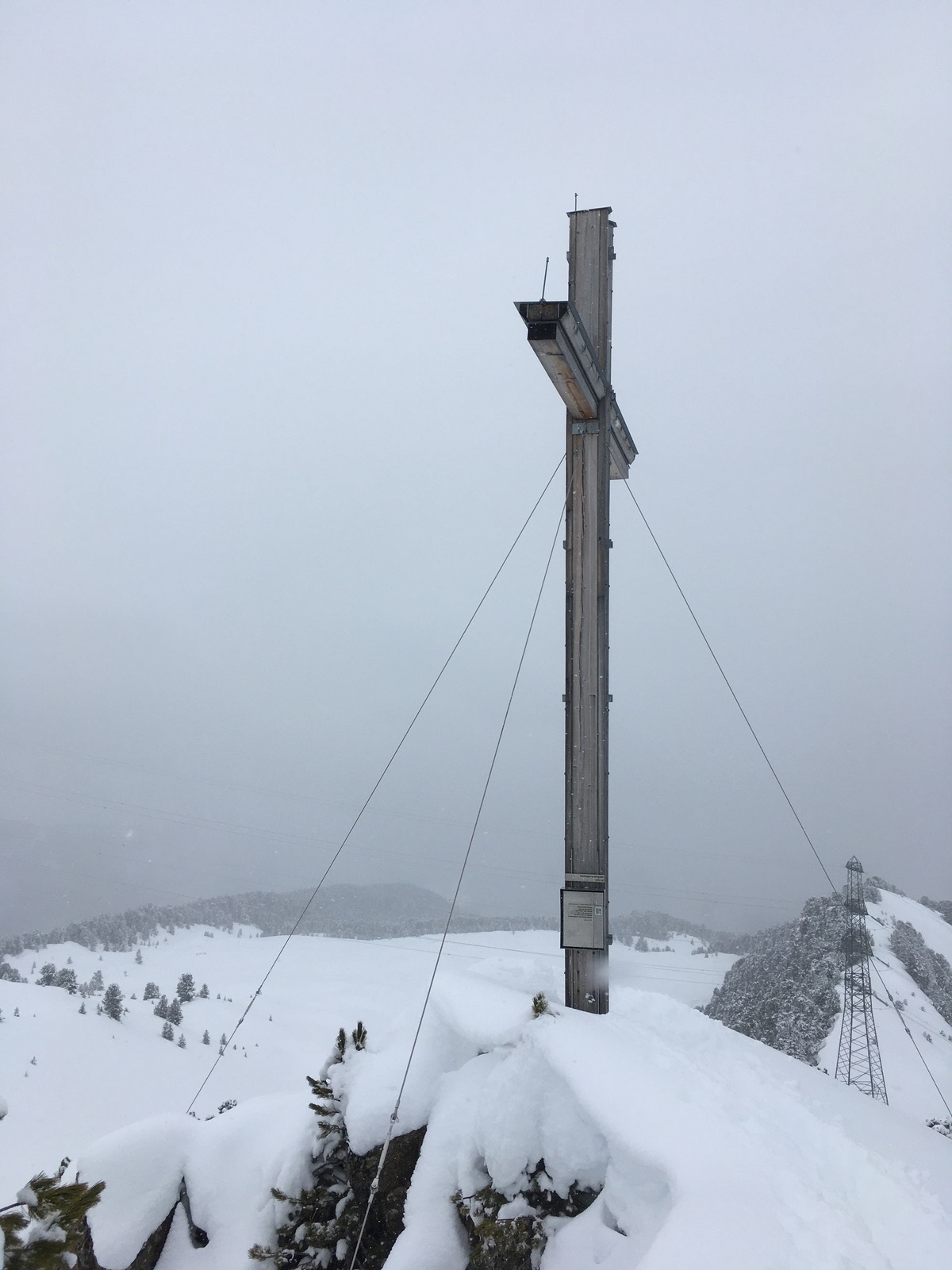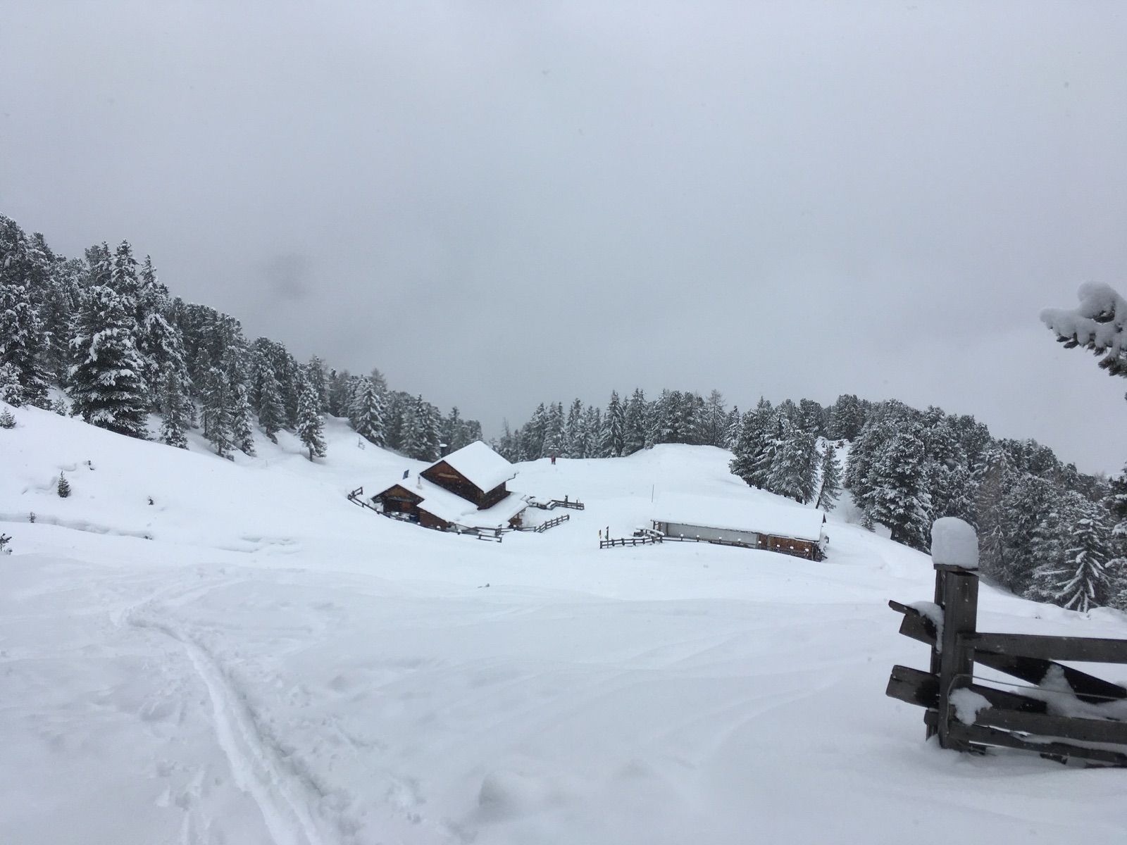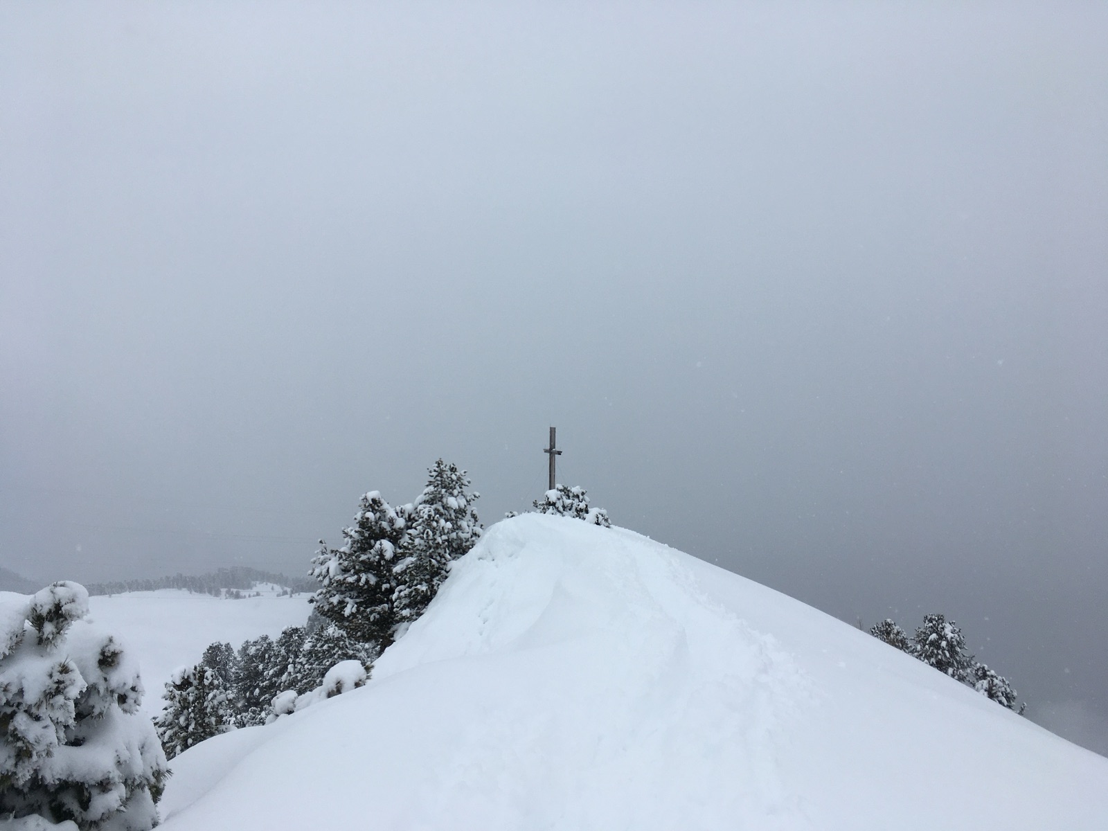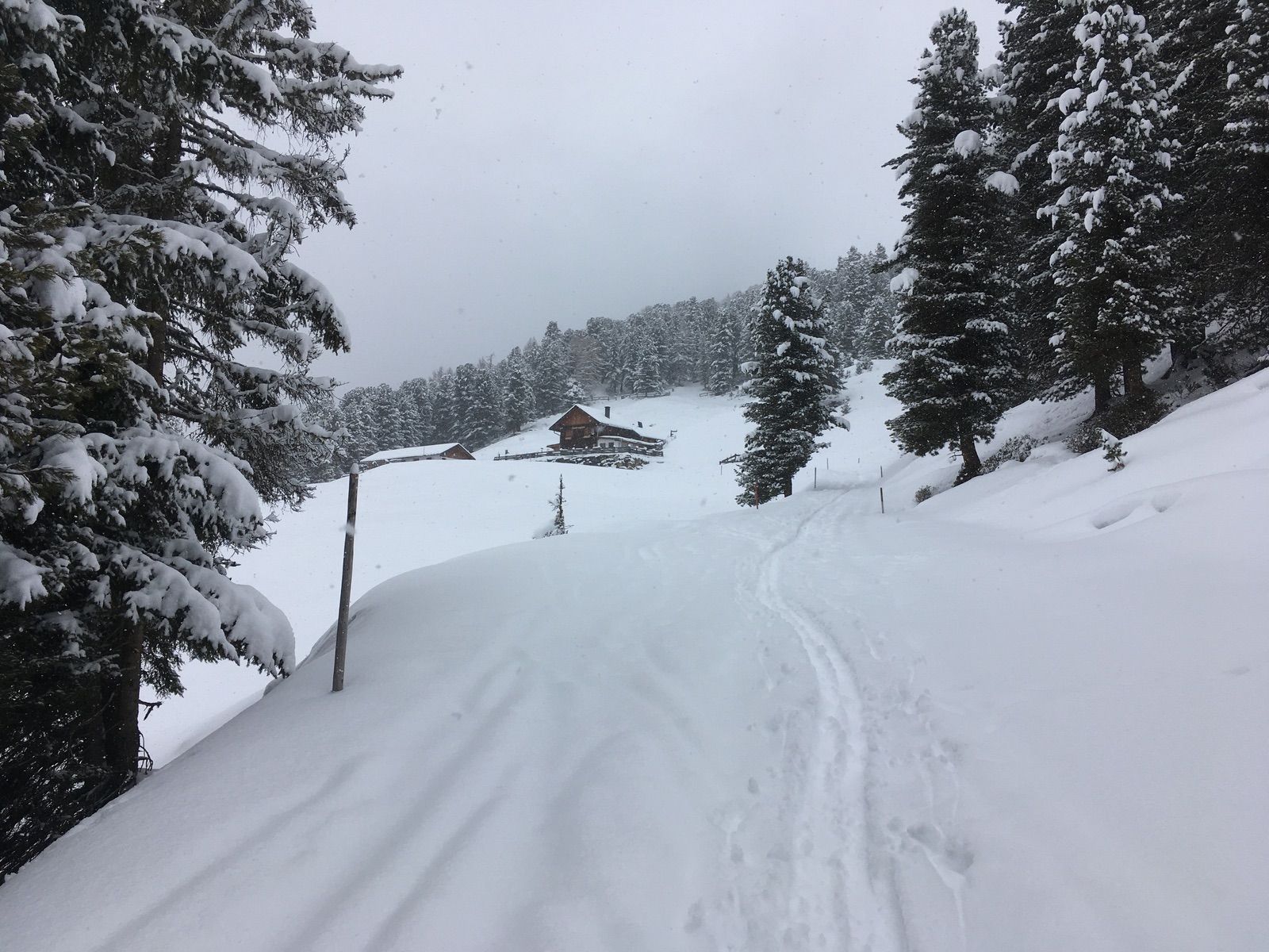 Einen Weiterweg Richtung Schafjoch oder gar Pirchkogel ersparte ich mir heute, da oberhalb der Waldgrenze die Sicht schlecht war und alles zu spuren war; danke an die beiden Skitourengeherinnen vor mir, die das heute bis zum Gipfelkreuz übernommen hatten (nach einer Tourenwoche, in der ich jeden Tag spuren musste, habe ich das dankend angenommen). Die ersparten Spurmeter wurden dann in einen zweiten Aufstieg oberhalb der Alm investiert.