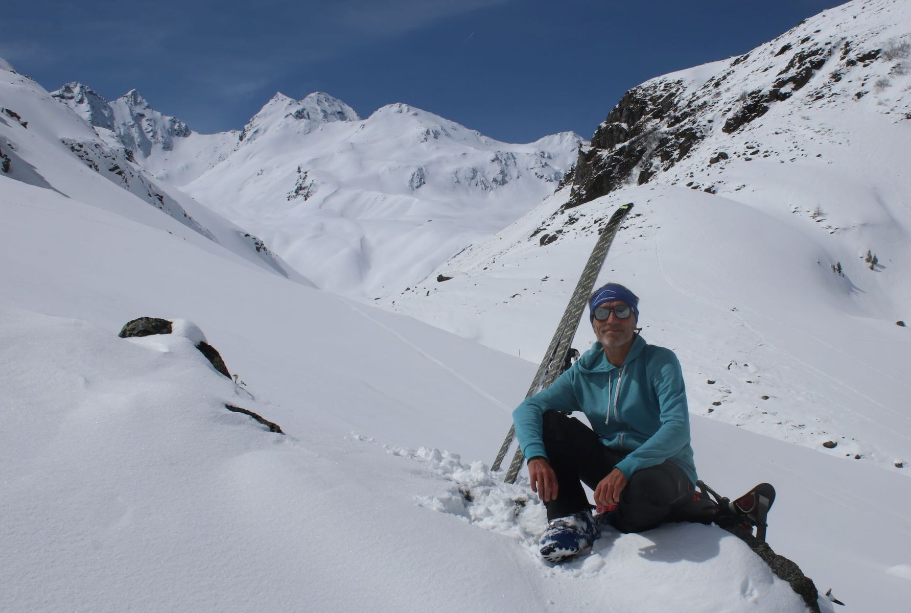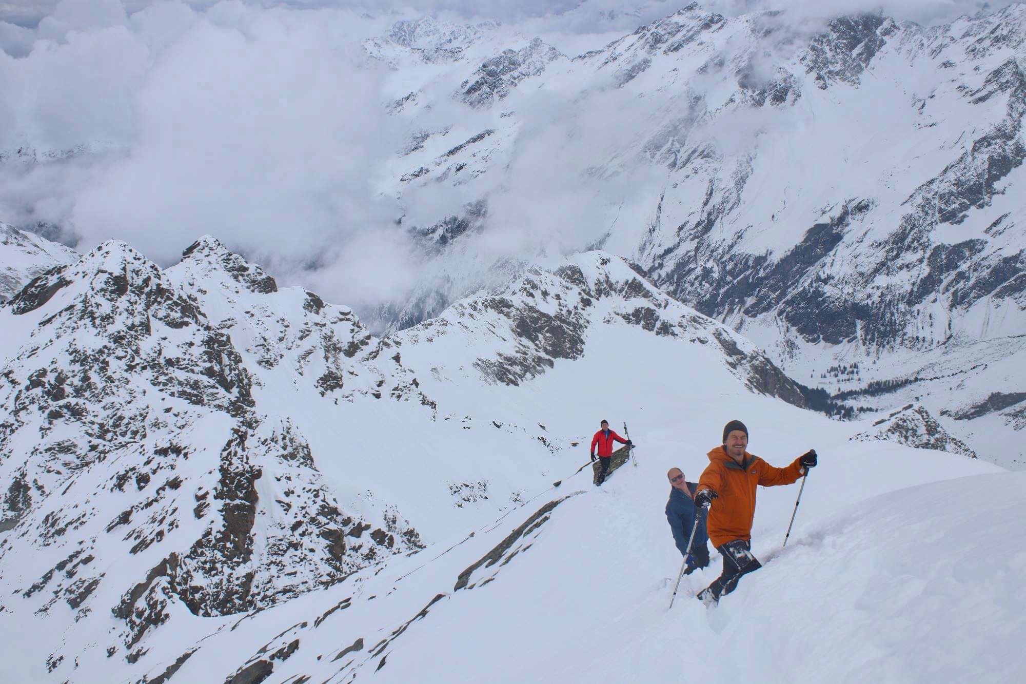 Von der Pforzheimer Hütte ging es am nächsten morgen zunächst in abfahrender Querung ins Gleirschtal und auf der anderen Seite zum Zischgenferner. (Erst fester Harschdeckel, dann gesetzter Pulverschnee). Wir stiegen zum Schluss (wie meist üblich) nicht über die Gipfelflanke, sondern über den links davon liegenden Gipfelgrat auf (bis 43° steil, kurze Kletterstelle). Es liegt derzeit ausreichend Schnee. Ich konnte bis St. Sigmund abfahren.