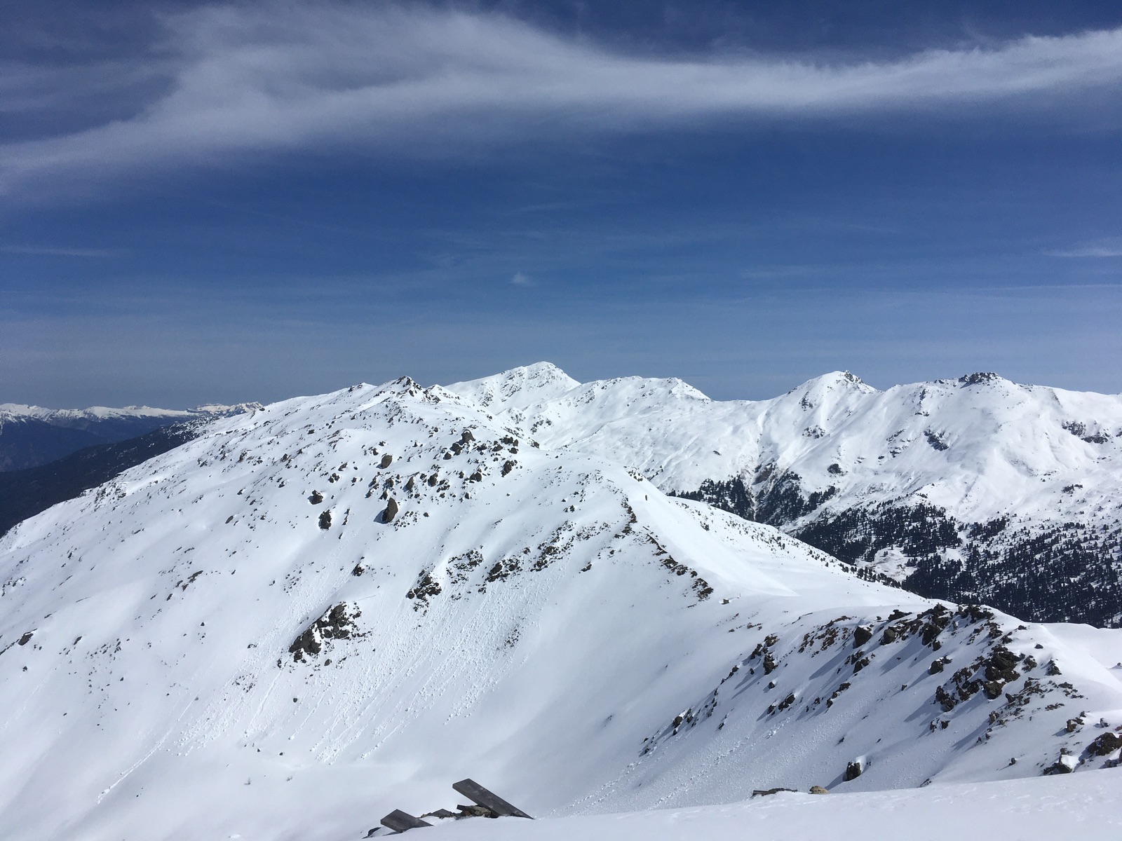 Die Straße vom Lager Walchen ins Mölstal ist leider gründlichst bis oberhalb des Möls-Hochlegers geräumt worden. Offenbar ist das in dem Maße nicht schon im Hochwinter der Fall, den verschiedene Beschreibungen im Internet erwähnen die Abfahrt durch das Mölstal (so auch die Beschreibung im Tourentipp-Archiv). Ich trug daher zunächst die Skier und schnallte sie nach der Almwiese (ca. 1.700 m) an, um auf der Straßenböschung aufzusteigen. Etwas mühsam, mit alten Skiern und Fellen aber machbar. Auf knapp 2.000 m geht es dann endlich ins offene Gelände, hier liegt auch noch gut ausreichend Schnee. Landschaftlich wie in den Hochlagen der Tuxer Alpen eigentlich immer sehr schön. Das erste Gipfelkreuz, welches man sieht, erwies sich als der vorgelagerte Gipfel des sog. Skispitzerl (es gibt verschiedene Bezeichnungen). Der direkte Anstieg dorthin von Norden war am Ende ziemlich steil - besser über die sog. "Unbenannte Scharte" aufsteigen. Zur Mölser Sonnenspitze geht es zur Zeit bis zum Kreuz mit Skiern.