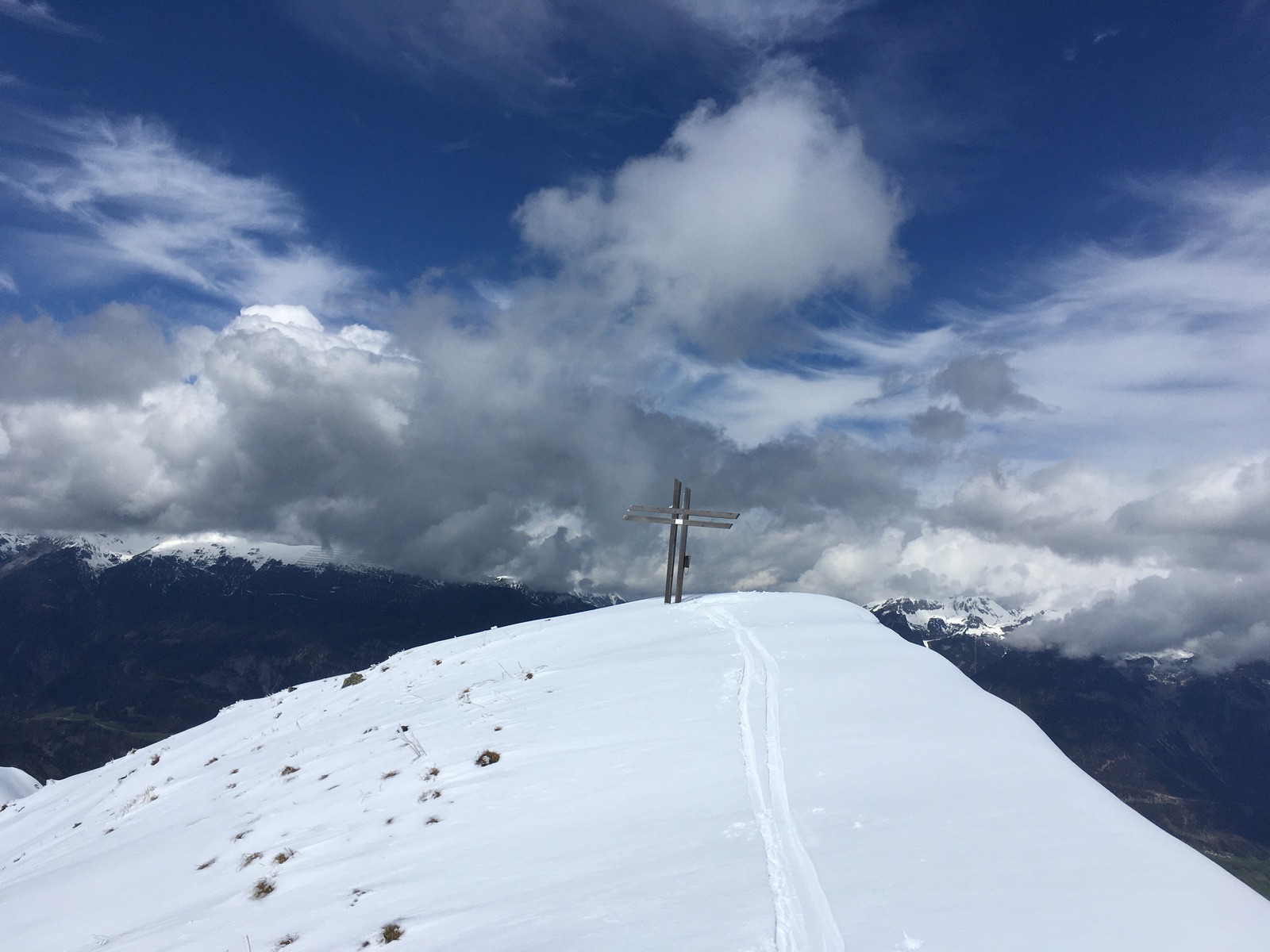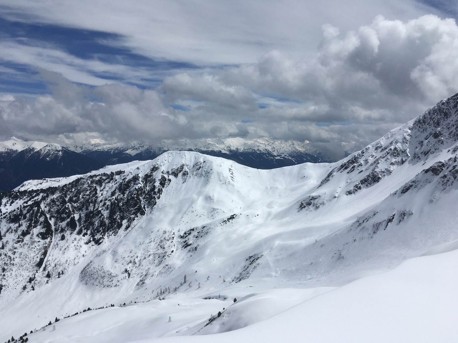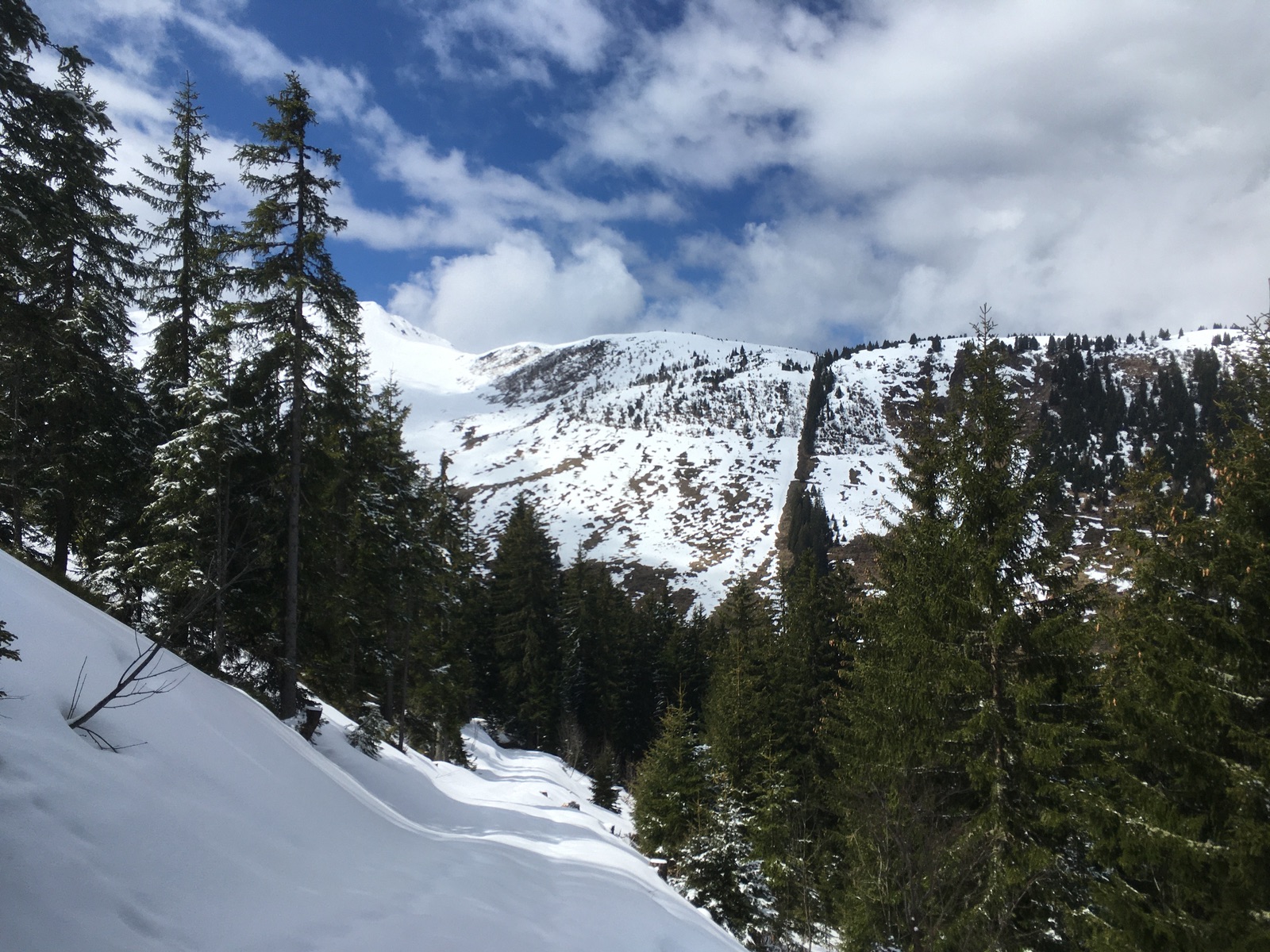 Im Ergebnis ging es von der Fügener Seite (Mittelstation der geschlossenen Spieljochbahn / Kohleralmhof: hier neue Parkverbotsschilder) durch das geschlossene Skigebiet mit Zwischen-Fellabfahrt zur Kaunzalm und dann hoch zum Gratzenkopf. Am Anfang ca. 30 Hm Skitragen, dann geht es durchgehend. Nur die querlaufenden Fahrwege sind freigeschoben, mit alten Skiern und Fellen einfach drüber (ggf. Vorsicht bei Nebel in der Abfahrt: teilweise beachtliche Fräskanten). Es sei aber angemerkt, dass es die ersten ca. 200 Hm schon viele Lücken in der relativ dünnen Schneedecke gibt. Das könnte also bald vorbei sein, allzumal es laut Wetterbericht in den kommenden Tagen bis über 2.000 m Regen geben soll (der bekannte "Schneefresser" im Frühjahr). Danach gibt es durchwegs pappigen Neuschnee. Auf dem Weg zur Kainzalm auch noch ganz kurze apere Flecken. Auch die könnten ggf. rasch zunehmen. Nordseitig liegt in dem Gebiet ab ca. 1.500 m aber grundsätzlich noch eine geschlossene Schneedecke.