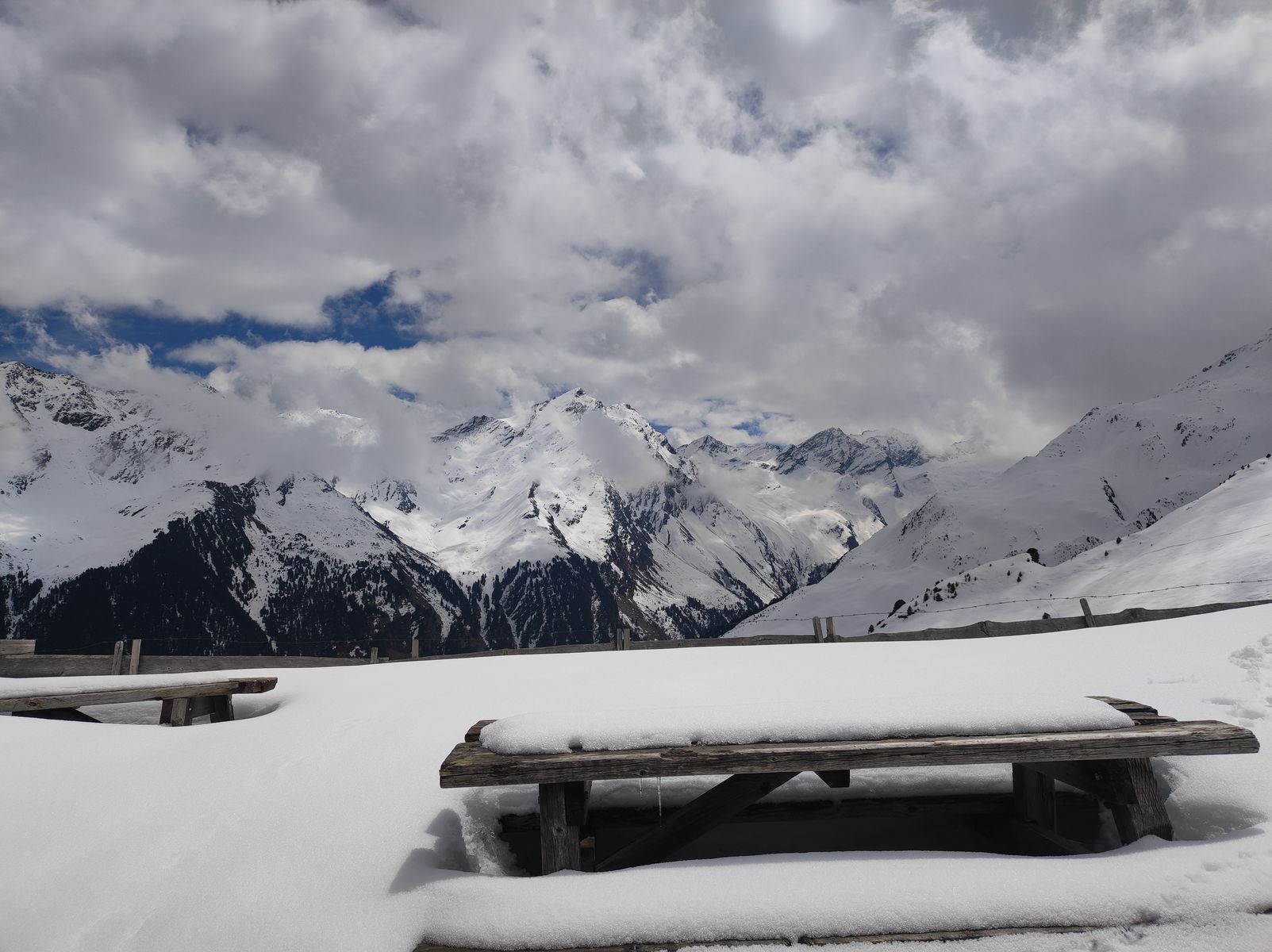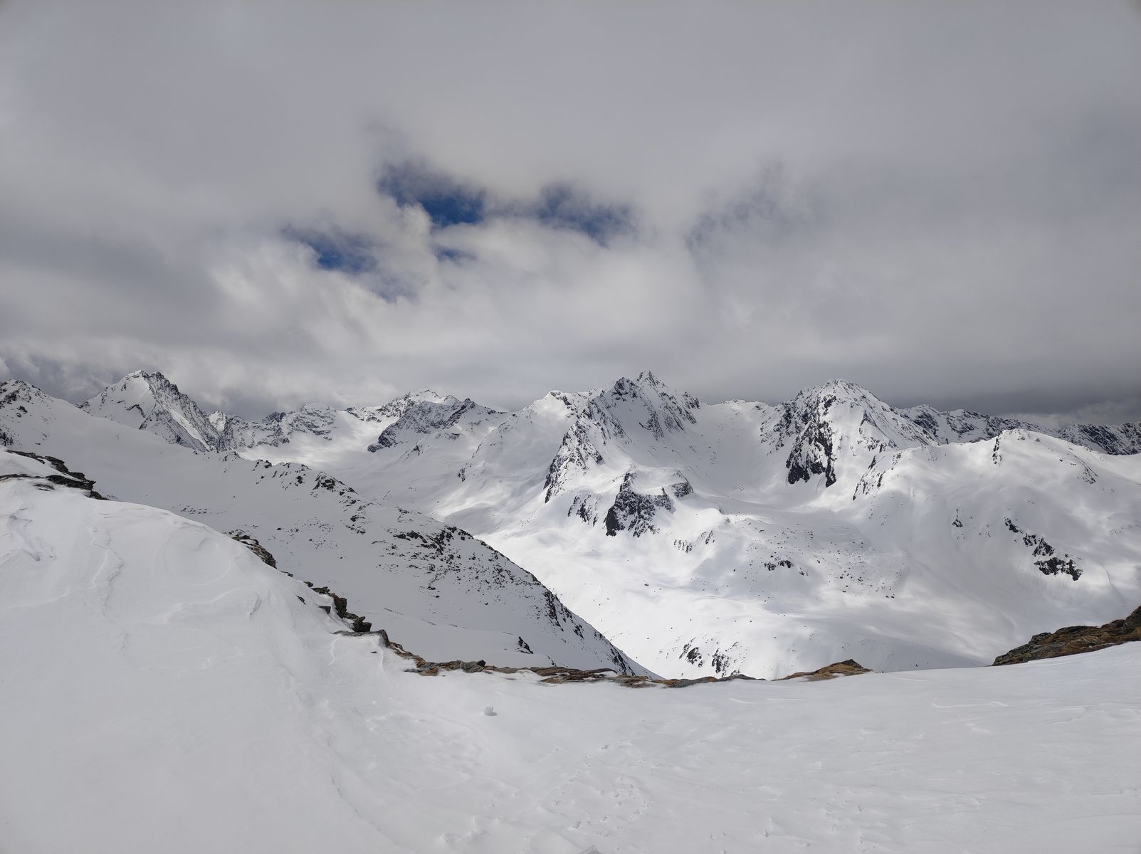 Ursprünglich hatte ich heute eine etwas längere/ambitioniertere Tour geplant, doch erstens verzögerte sich die Anfahrt ins Sellrain wegen Blockabfertigung und Stau ziemlich und zweitens war schon von weitem zu erkennen, dass der Wetterbericht mal wieder kräftig daneben gelangt hatte - dieses Mal bezüglich der Schneefallgrenze, die aber ja nur 1000Meter höher lag als angekündigt (bei fast 2500m), aber was soll's... Ich vertu mich ja auch gern bei den Gipfelhöhen und eigentlich war ich so gesehen heute am Großglockner...