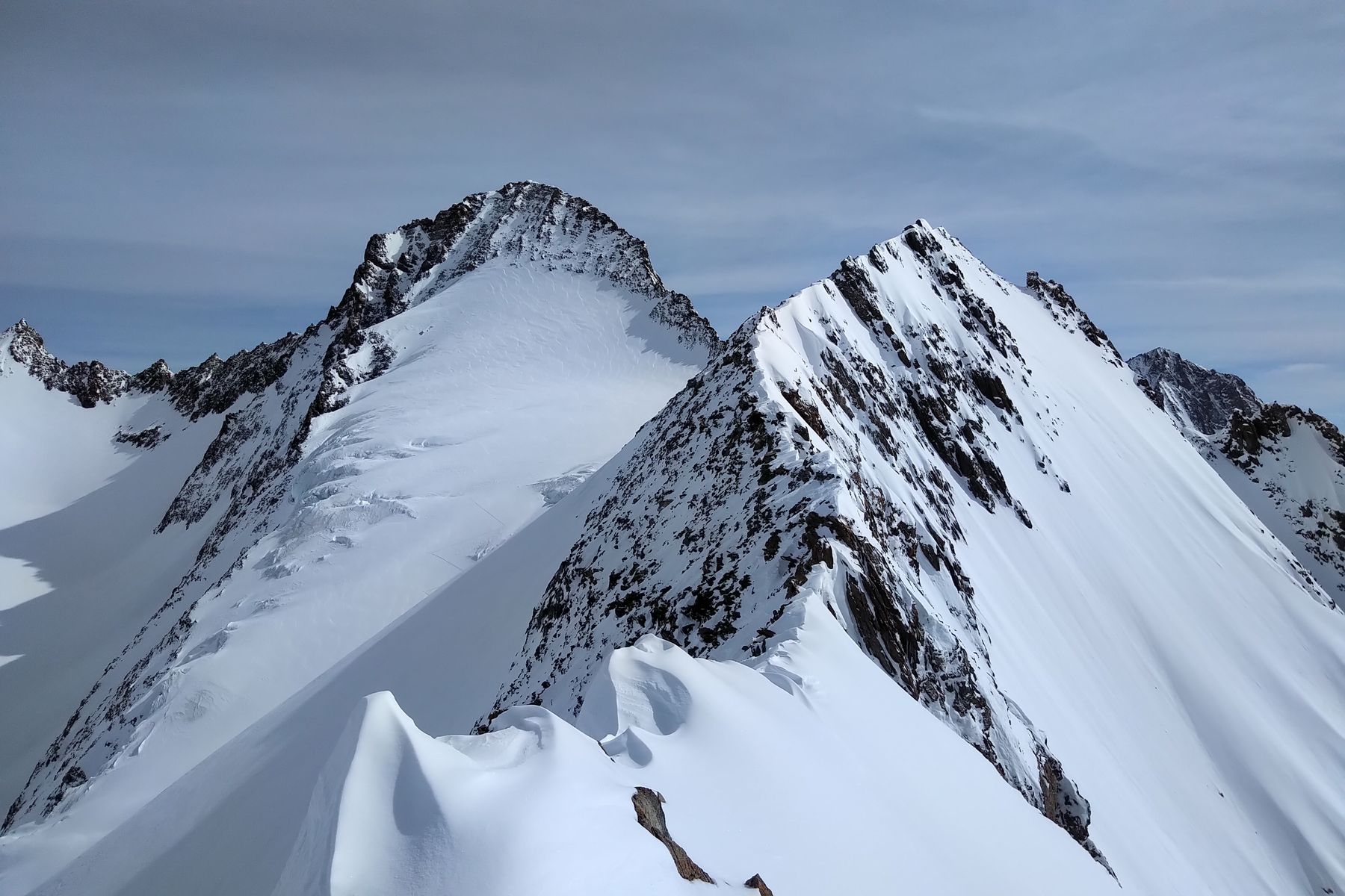 Am Donnerstag sind wir früh aufgebrochen und haben erstmal die Tour übers Grüneggfirn zum Skidepot vom Grünegghorn eingespurt. Praktischerweise war teilweise noch eine Spur vom Vortag zu sehen, vor allem beim Durchschlupf am Ende der Steilstufe war das hilfreich. Der Grat zum Grünegghorn war uns dann ohne Spur und leicht überwächtet zu heikel, um mit Ski am Rucksack drüberzugehen.