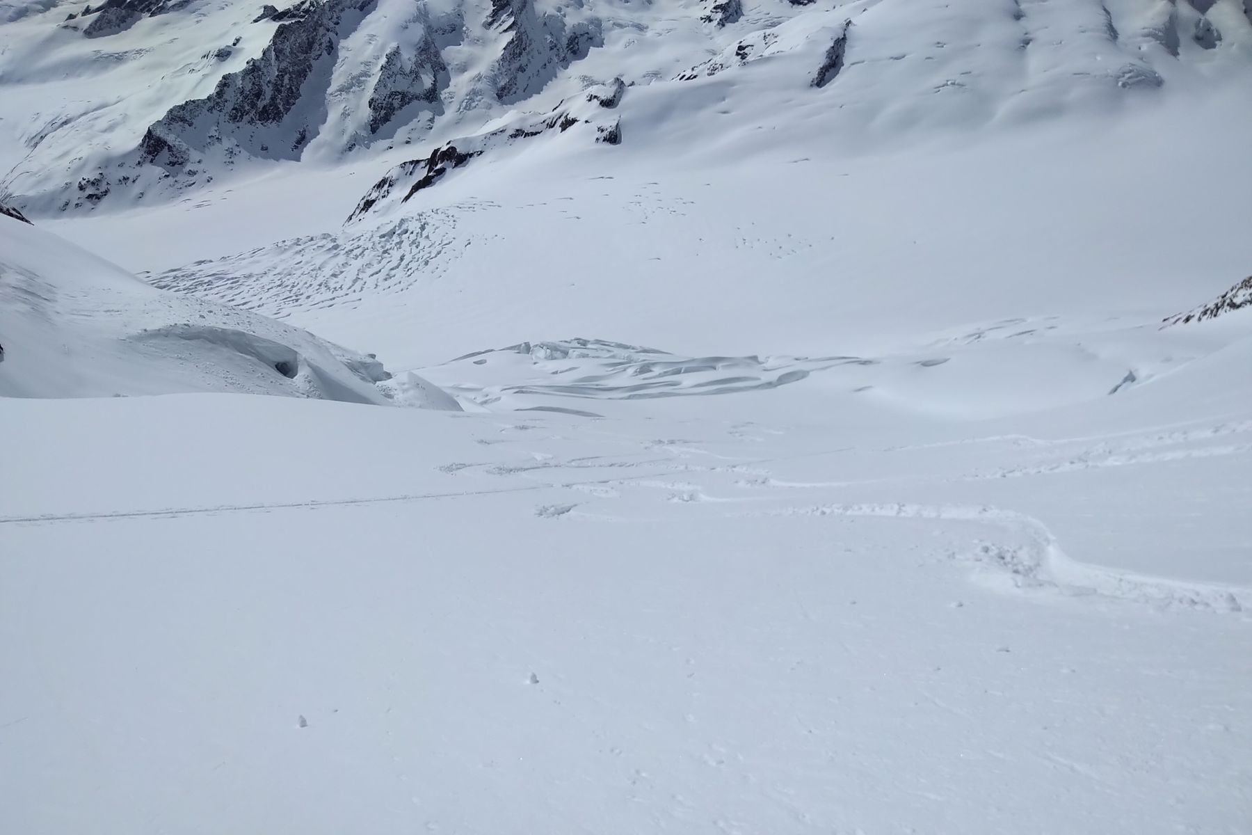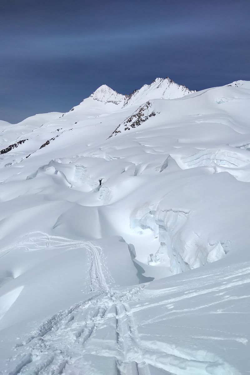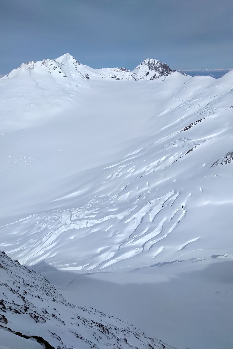 Der Fieschersattel hat von der Ferne aus gut ausgeschaut, und eine Aspirantengruppe hat später noch den Grat zum Grünegghorn eingespurt. Das Grünhorn wurde wahrscheinlich auch bis oben gemacht (den Spuren nach). Ansonsten haben wir keine Erfolgsberichte mitbekommen.