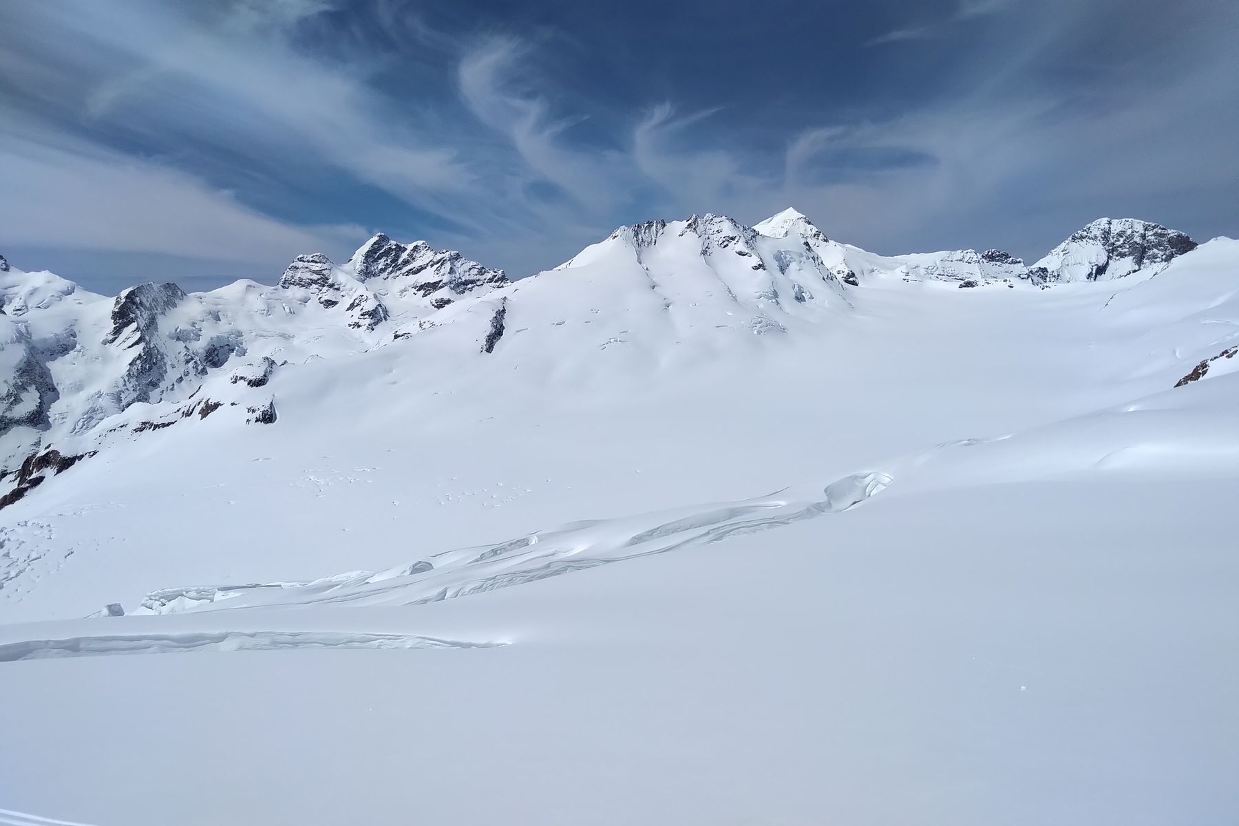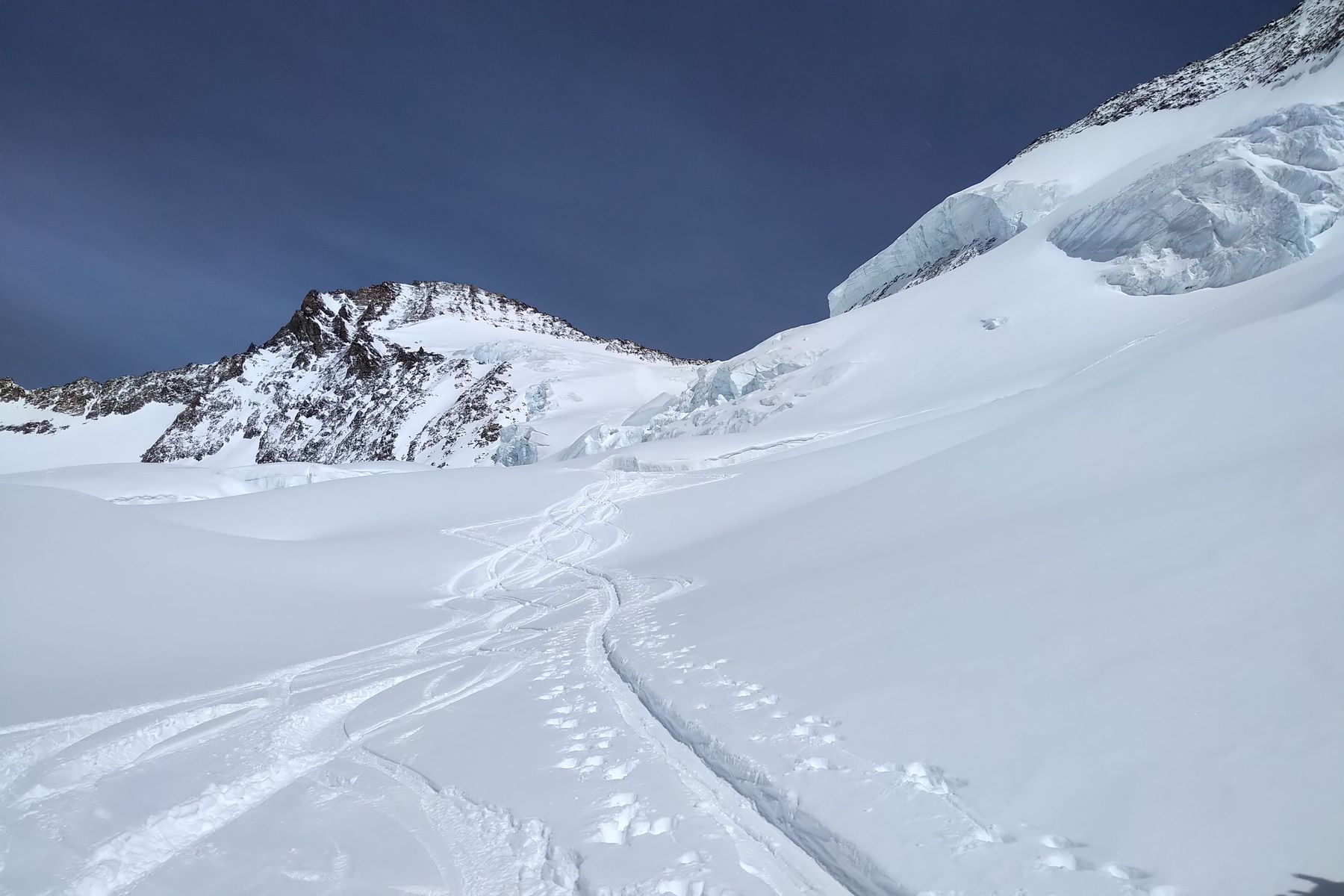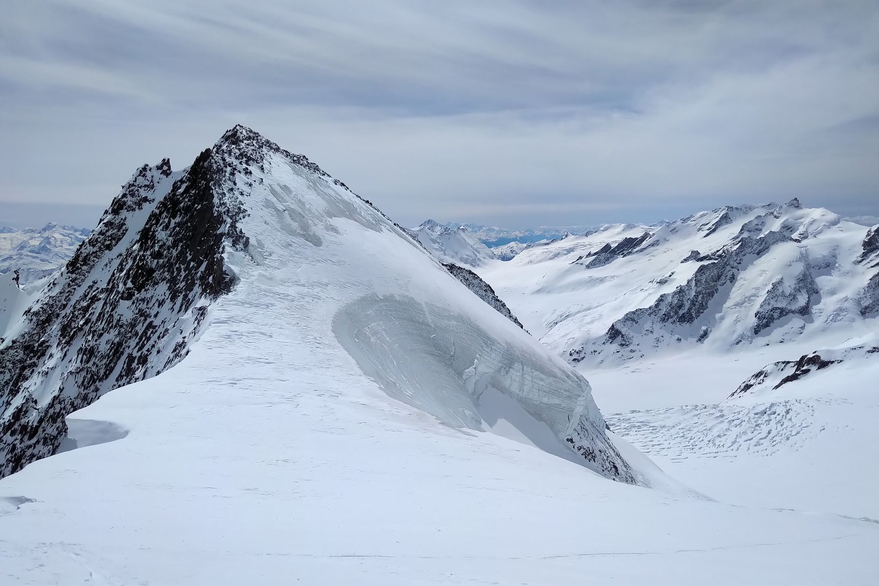 Der Fieschersattel hat von der Ferne aus gut ausgeschaut, und eine Aspirantengruppe hat später noch den Grat zum Grünegghorn eingespurt. Das Grünhorn wurde wahrscheinlich auch bis oben gemacht (den Spuren nach). Ansonsten haben wir keine Erfolgsberichte mitbekommen.
