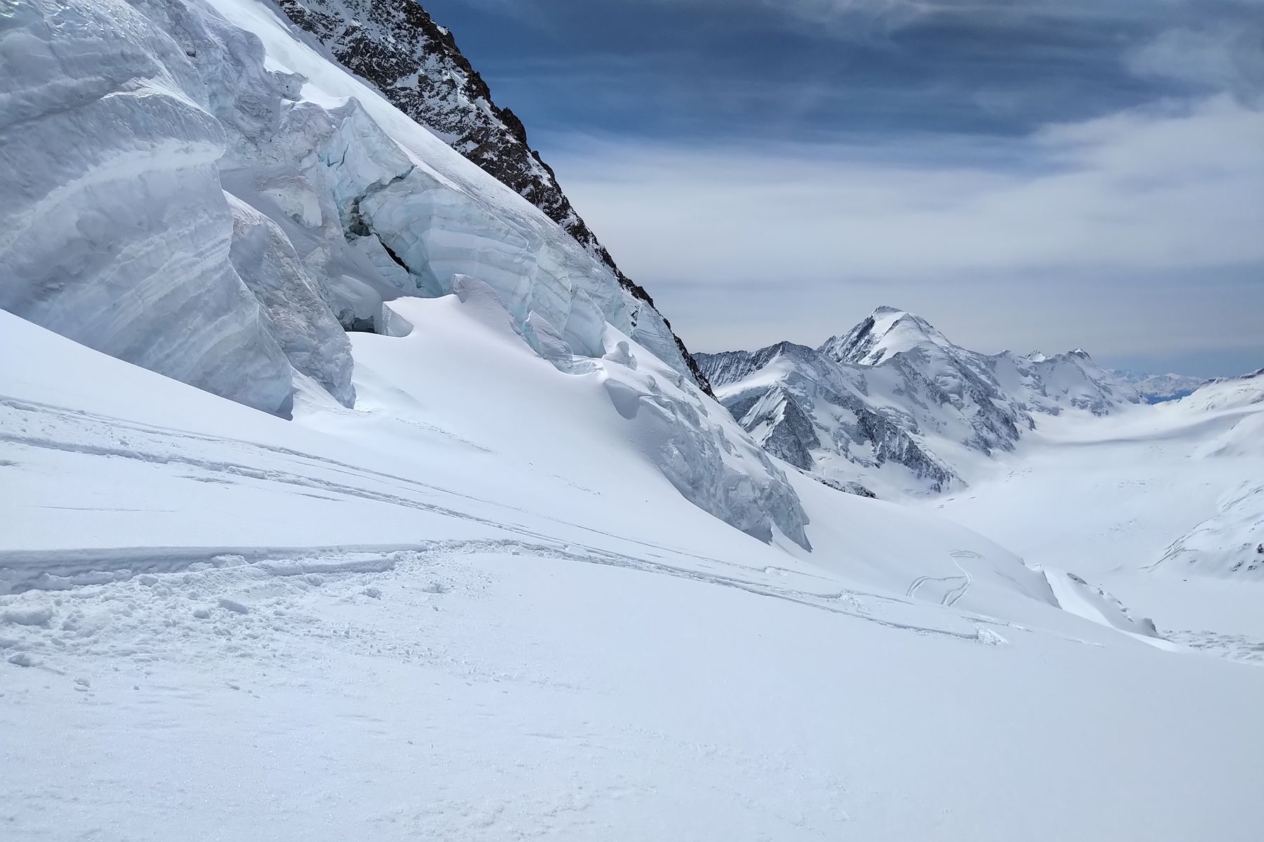 Blick runter zum Ewigschneefeld, ganz unten die Aufstiegsspur zum Grünhorn: