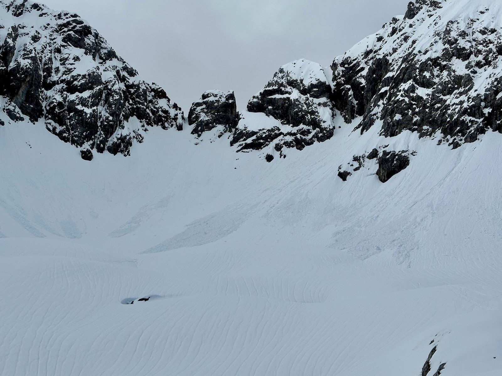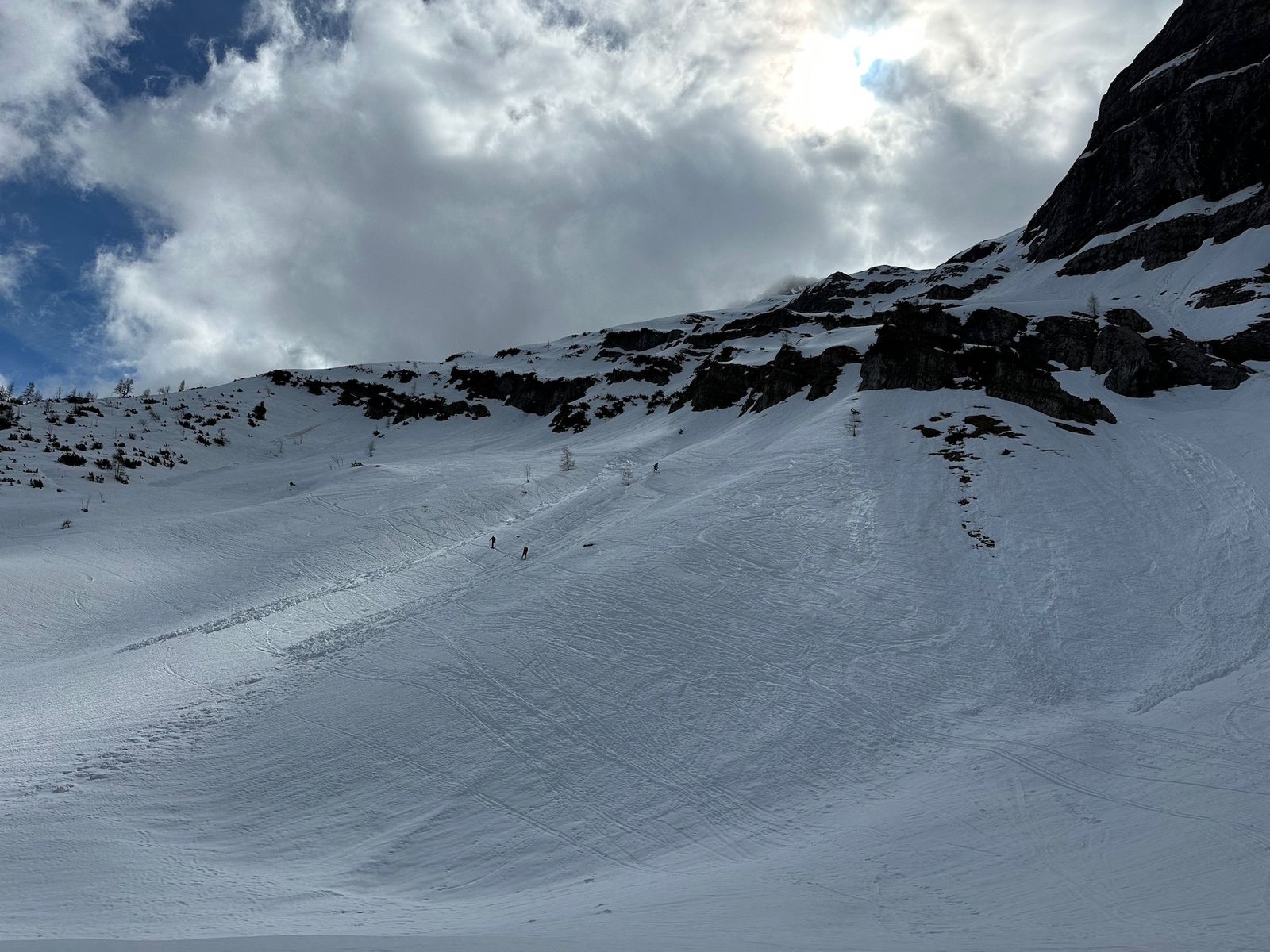 Von den Felsen der Eiskarlspitze donnern ab Vormittag schon die kleinen Lawinen runter, aber man ist relativ weit davon entfernt, so dass es nicht stört. Im unteren Bereich oberhalb des Kirchl und im Schlussanstieg zum Kar sind schon alte Nasschneelawinen runter gegangen, im Einzugsbereich scheint nicht mehr viel zu liegen was noch abgehen könnte.