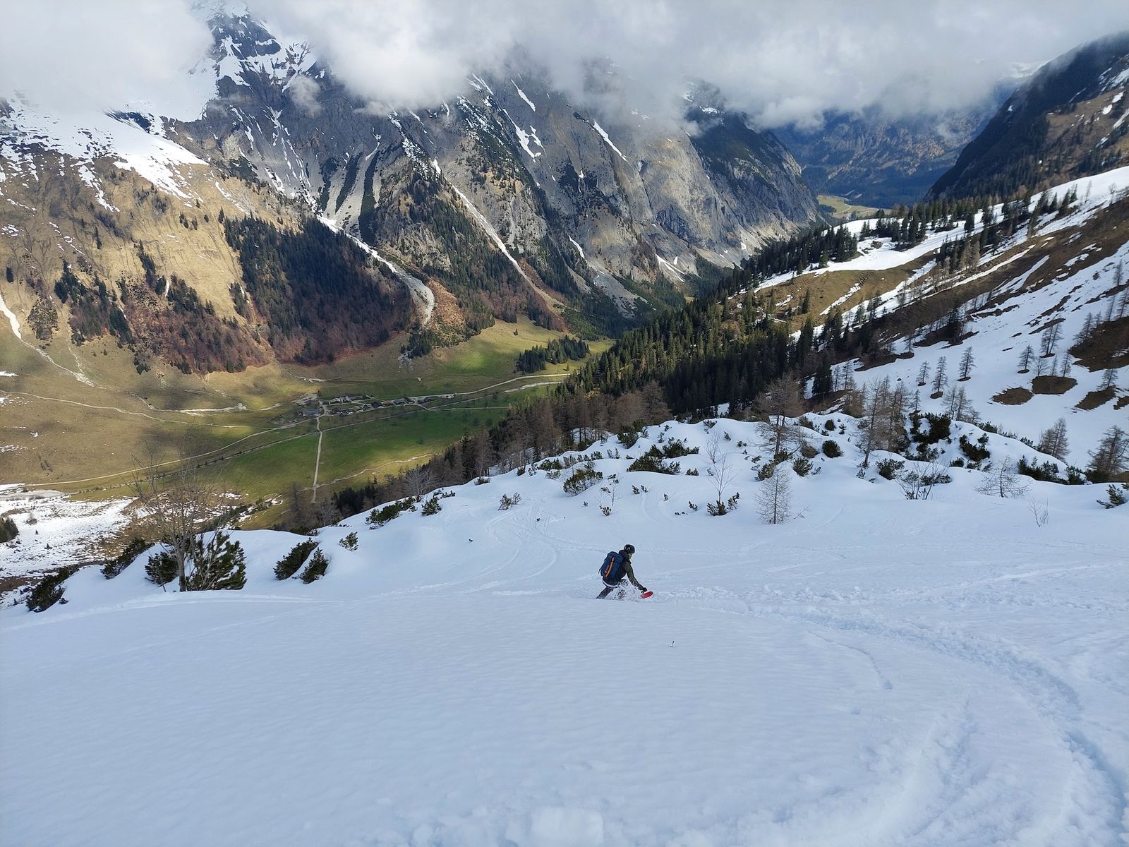 Ski Anschnallen oberhalb des Wasserkraftwerks, Schnee dann bis 1600m sehr nass, dann nass, und oberhalb von 2000m mit Harschdeckel, der im Steilhang zum Kar unschön zu fahren ist. Zu gehen aber gut, nur die letzten 50m zu Fuß, ohne Steigeisen da guter Stapfschnee. In der Abfahrt hat's kurz leicht angefirnt mit sehr schnellem Übergang zum Sulz, aber ganz ok zum angenhemen runter kommen.