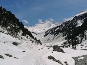 Die Lawinengefahr haben wir als gering eingeschätzt. Im bis 2300m ist der Schnee nicht aufgeweicht/aufgefirnt, im Bereich der Forststraße liegt in den darüberliegenden Hängen nur noch wenig Schnee. Hier sind auch schon einige Lawinen abgegangen.