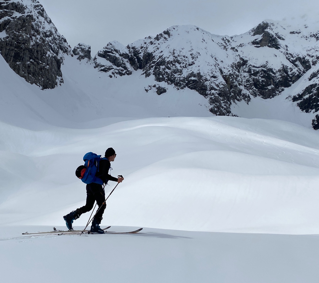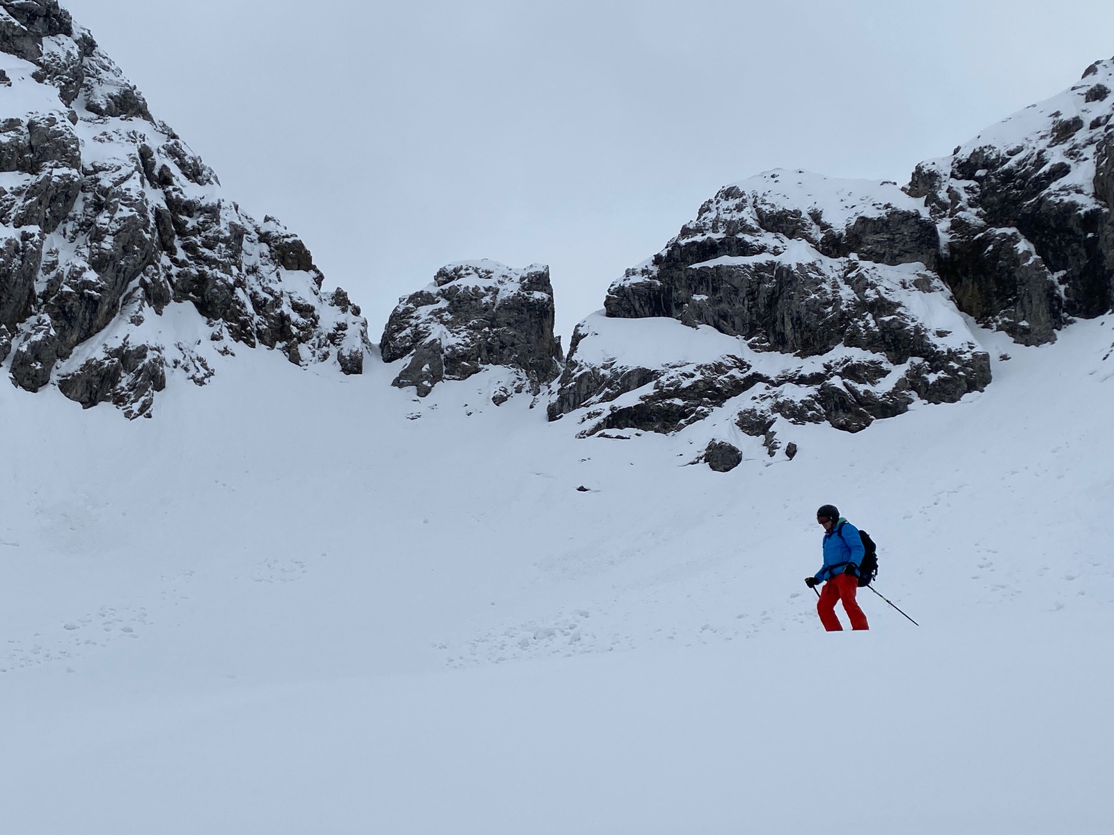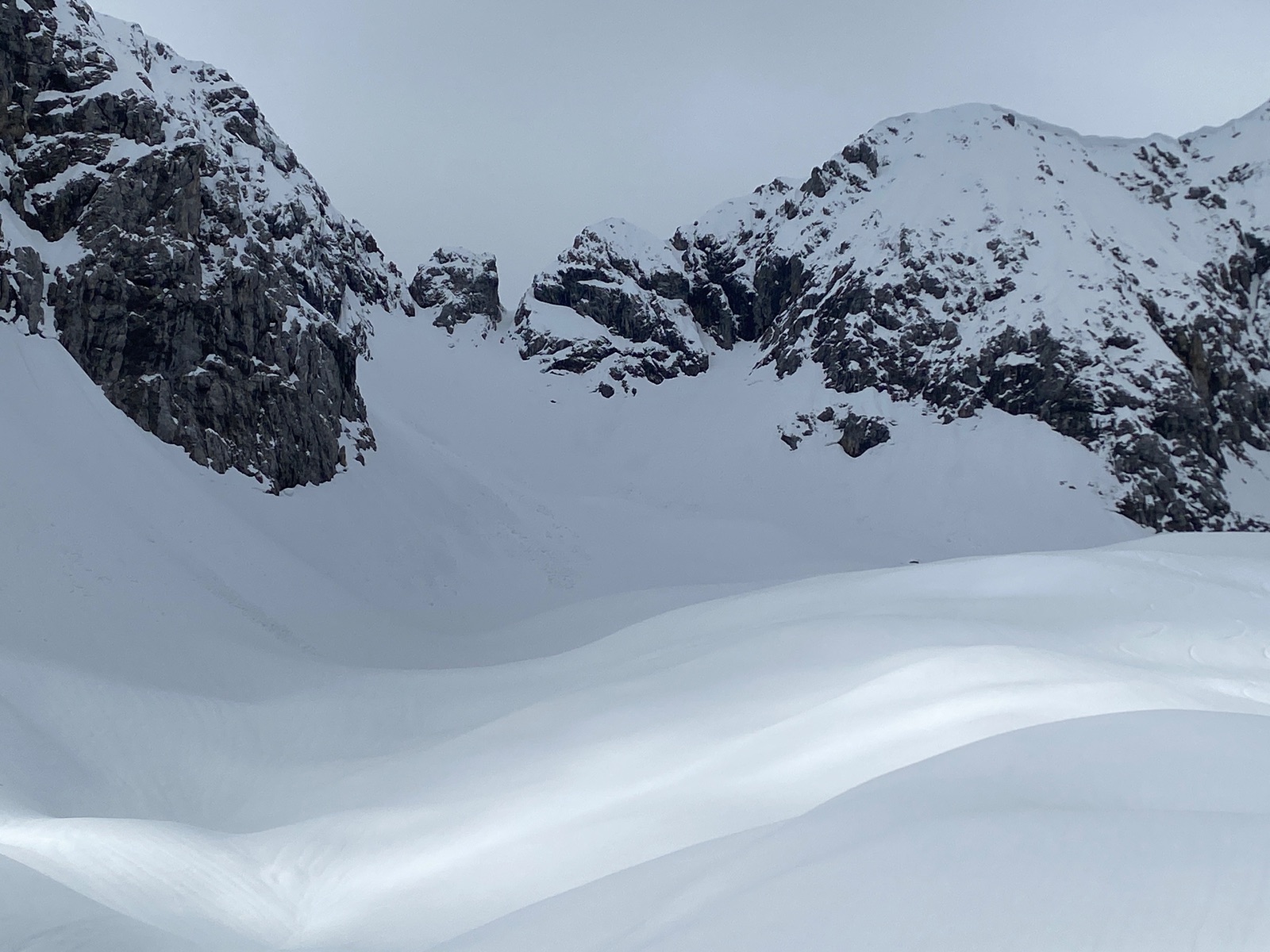 Vielleicht lag es, neben dem nur teils sonnigen Wetter, an der Lawinenlage? Die ist ein bisschen komplex, nix für Anfänger, das Risiko musste in Aufstieg und Abfahrt immer wieder kleinräumig bewertet werden. Knackpunkt ist die Querung oberhalb vom Brotzeitfelsen, wo es Faulschnee gibt und kleine Rutsche, dazu die Ergüsse von der Eiskarlspitze. Ab 2000 m ein Hauch von Pulver, aber verpresst und nicht mehr fluffig. Skifahrerisch am schönsten war es in der unteren Hälfte (gut fahrbarer Sulz).