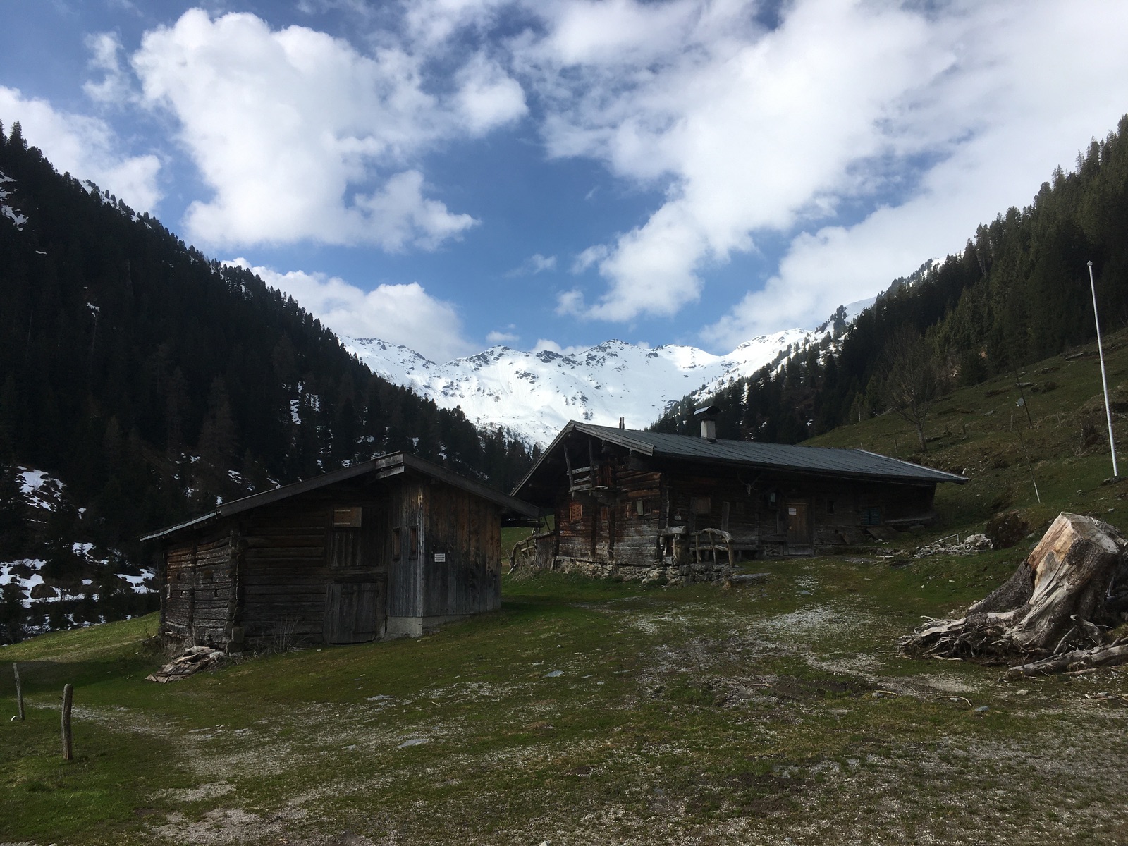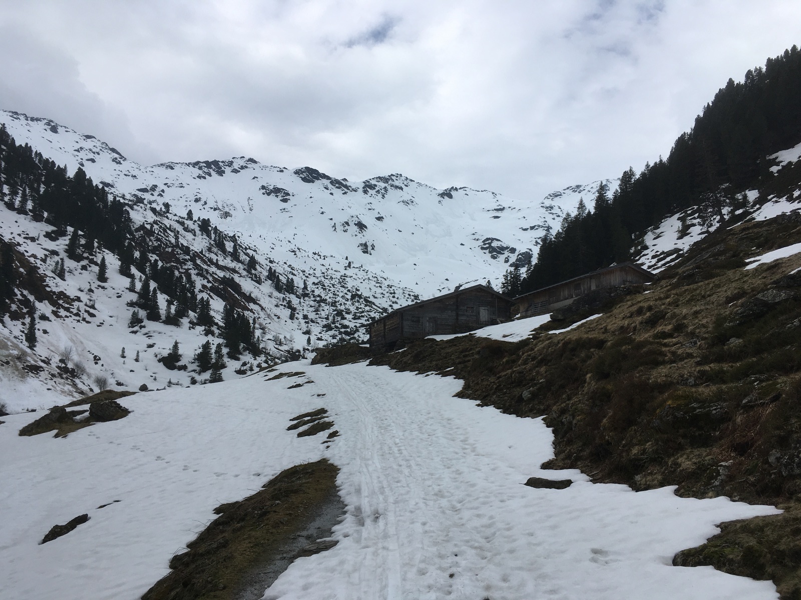 Am Ausgangspunkt bei der Tiefentalalm schaut es noch recht aper aus: