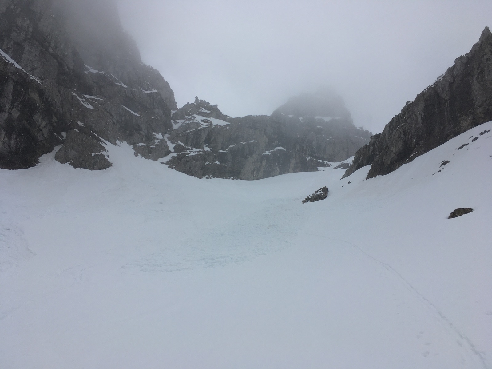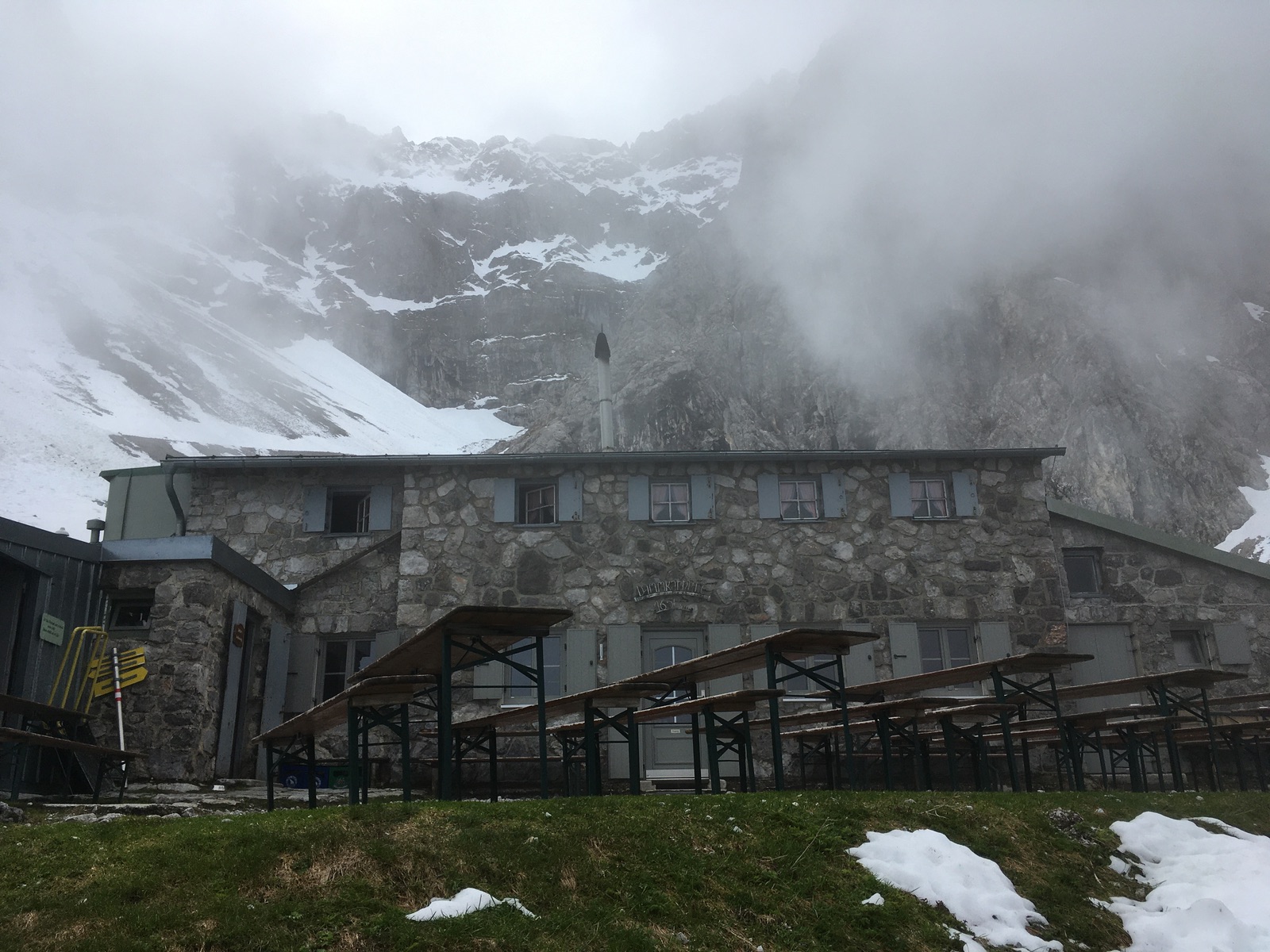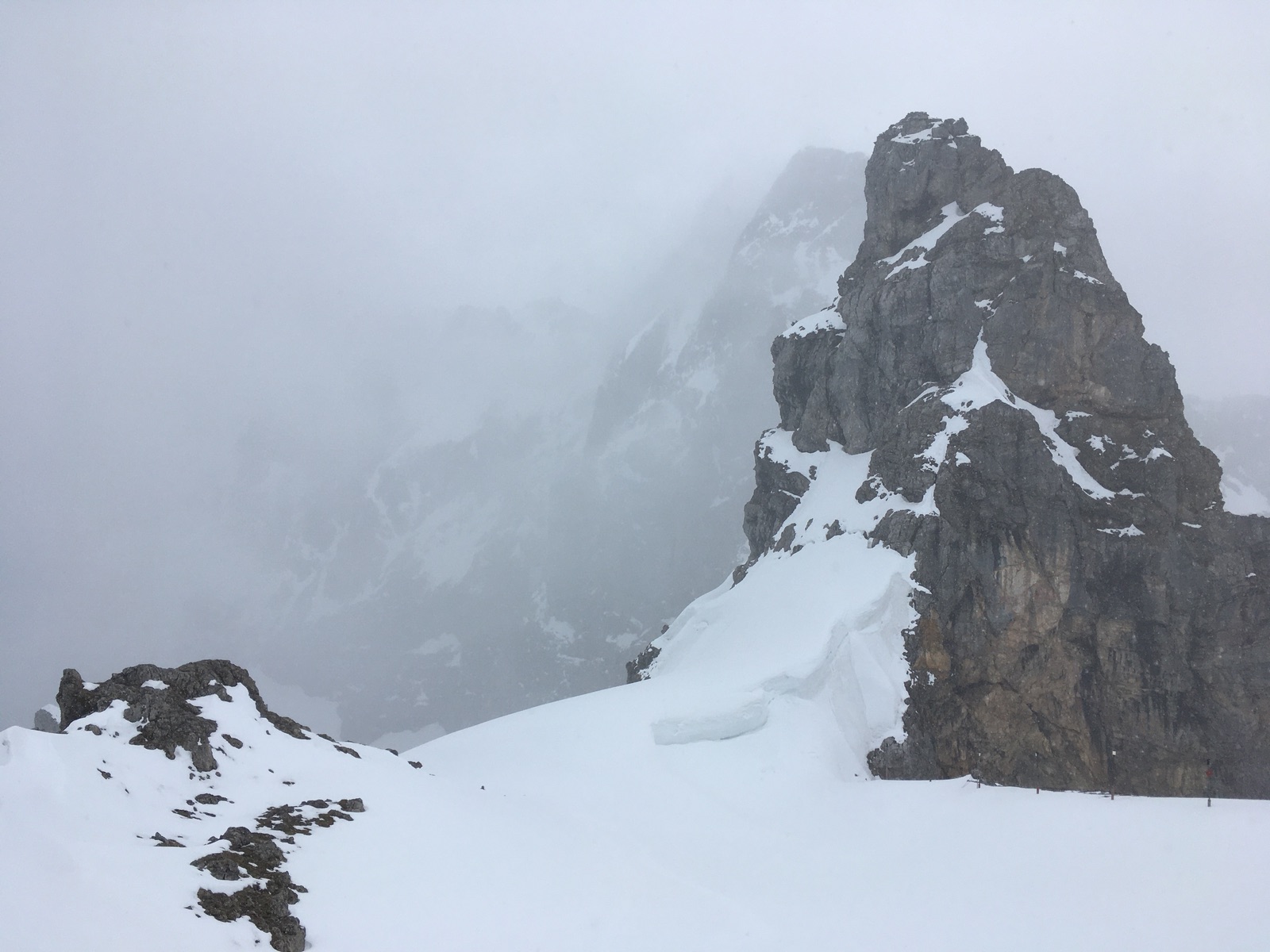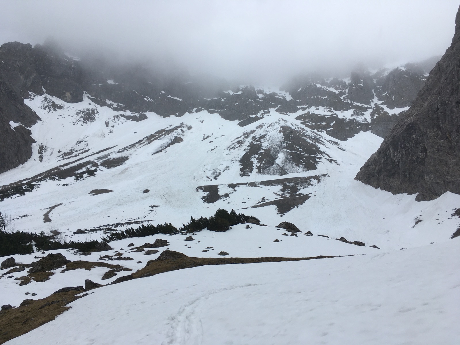 Heute sollte das angekündigte Wetterfenster am Vormittag für die alljährliche Skitour ins Dammkar genutzt werden. Zu Fuß bis zum "Bankerl" und dann gleich weiter, weil im "Kanonenrohr" dieses Jahr nur noch wenig Schnee liegt (Regen und Wärme haben da volle Arbeit geleistet). An der (geöffneten) Dammkarhütte kamen die Kurzski dann aber an die Füße. Heute leider zunächst dichter Nebel, aber wirklich verlaufen kann man sich da ja nicht und außerdem kenne ich mich gut aus. Hoch durch das Hintere Dammkar bis zum Tunnelausgang. Dieser war (entgegen des Schildes) geöffnet. Genau als ich oben ankam, wurde das bis dahin noch trockene Wetter aber so richtig garstig mit Graupelschauer und da es nur noch schlechter werden sollte und man oben ohnehin wenig sah und tiefen Schnee hatte, entschied ich mich gegen eine Besteigung von Östlicher Karwendelspitze oder Nördlicher Linderspitze.