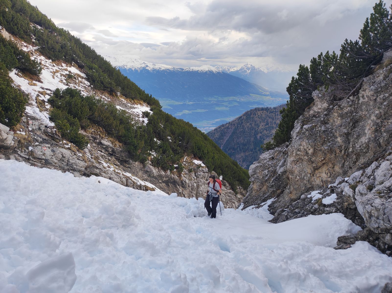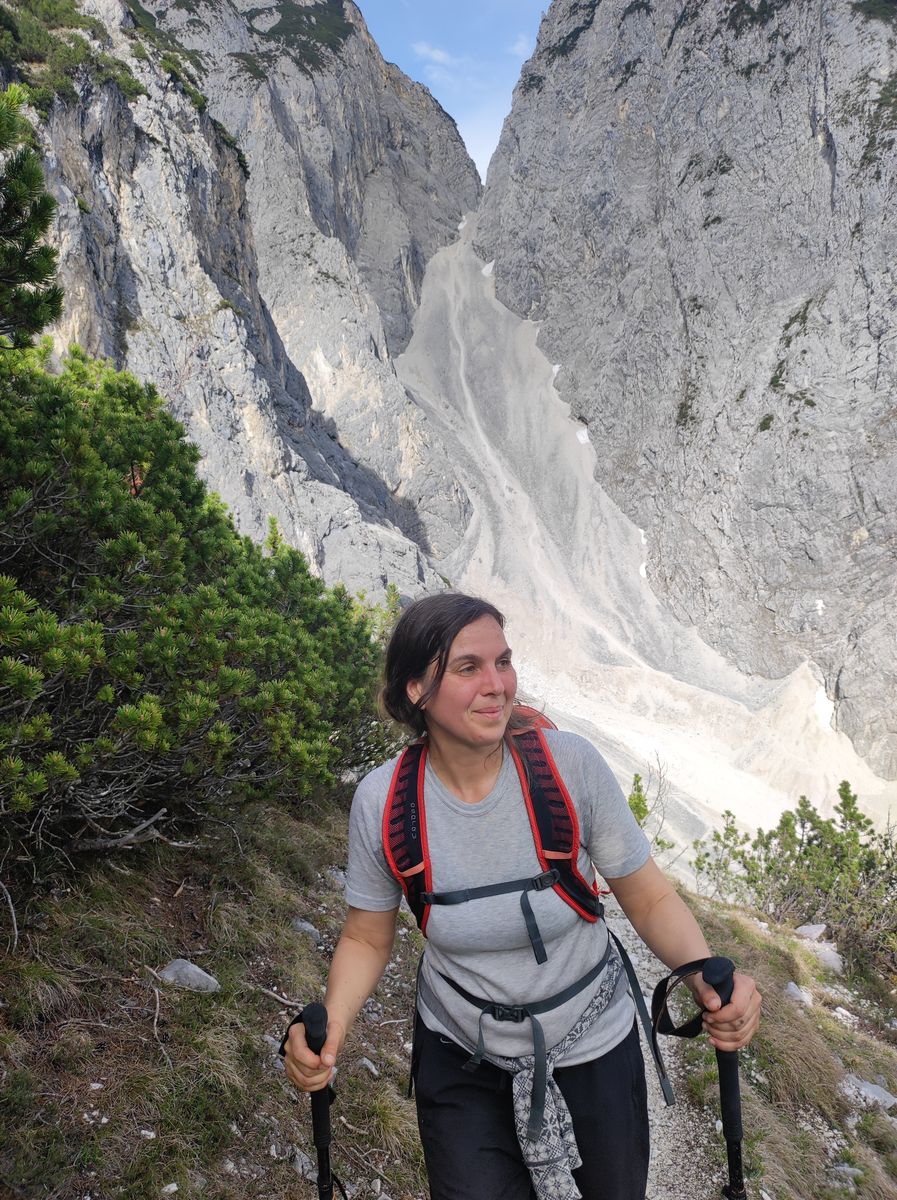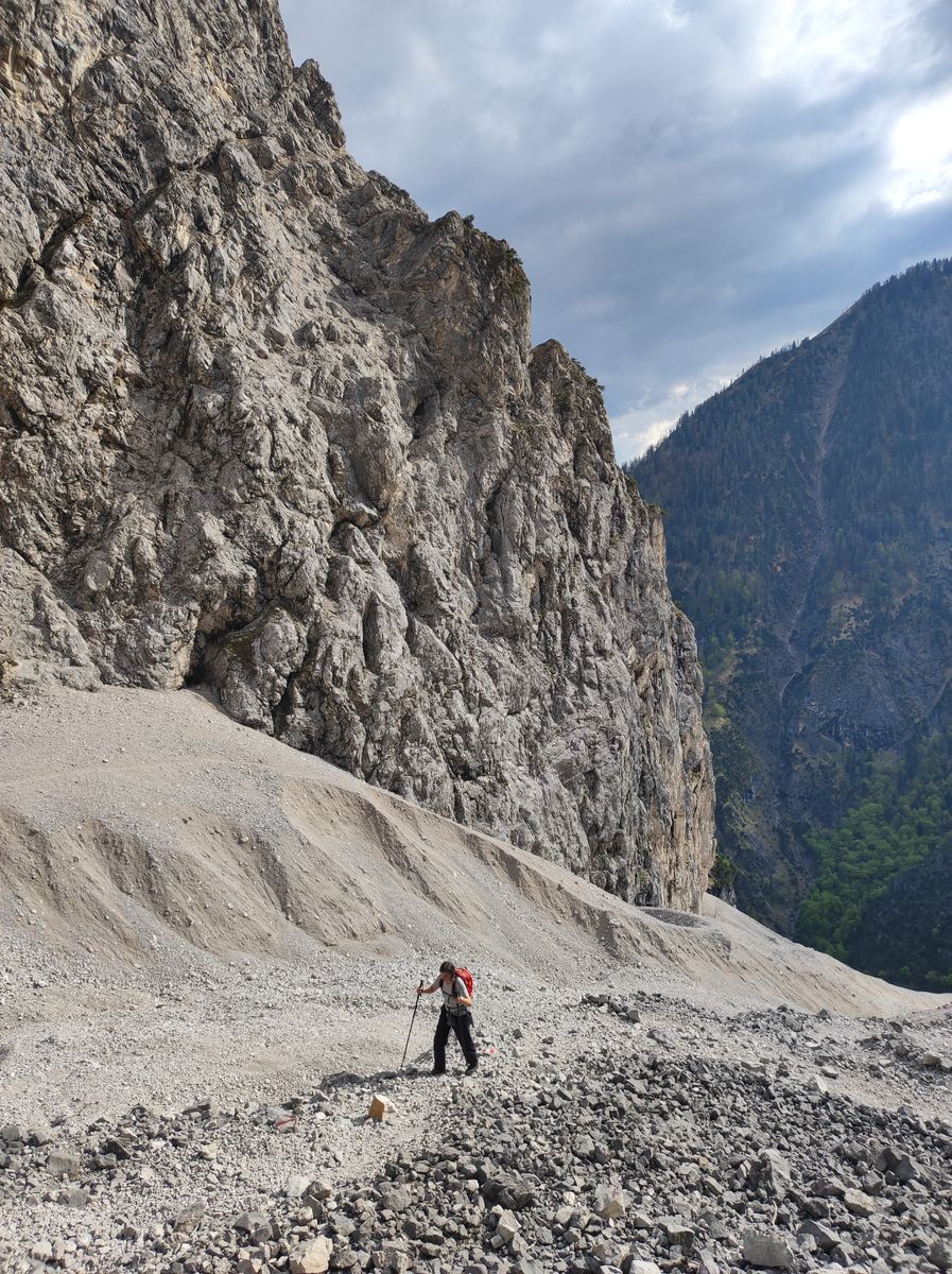 Sehr spannend war es, dabei mitzuhelfen, die Hütte nach der Winterpause wieder auf Vordermann zu bringen, wobei die Arbeiten noch lange nicht abgeschlossen sind. Man hat ja vielleicht die eine oder andere Doku zum Leben von Hüttenwirten gesehen, aber in natura ist das etwas ganz Anderes. Nur ein Beispiel: Die Wasserversorgung ist immer ein großes Thema und im Karwendel noch viel mehr. Die Bettelwurfhütte hat eine Quelle, die einige hundert Meter weit entfernt (und nicht direkt oberhalb) ist. Um das Wasser in der Hütte zum Laufen zu kriegen, muss die Leitung, die nicht immer nur bergab geht, an verschiedenen Stellen entlüftet werden. Diese Stellen lassen sich aber teils nicht so einfach erreichen, sondern liegen an sehr ausgesetzten Punkten, die nur in heikler, brüchiger Kletterei (I-II) im Absturzgelände zu erreichen sind. Ich habe Michael bei dieser Arbeit am Samstag begleitet - Schnee lag da auch noch und machte die Sache noch riskanter... Ein Glück, dass Michael ein erfahrener Kletterer (im Gegensatz zu mir) ist und das Ganze souverän gemeistert hat. Ich wäre da teilweise nicht hingestiegen, wo er locker rüber ist. Er wollte mich sozusagen nur zur Sicherheit als Beobachter dabei haben, falls was passiert (und um zu schauen, ob das mit der Entlüftung funktioniert und das Wasser auch an der nächsten Station ankommt).