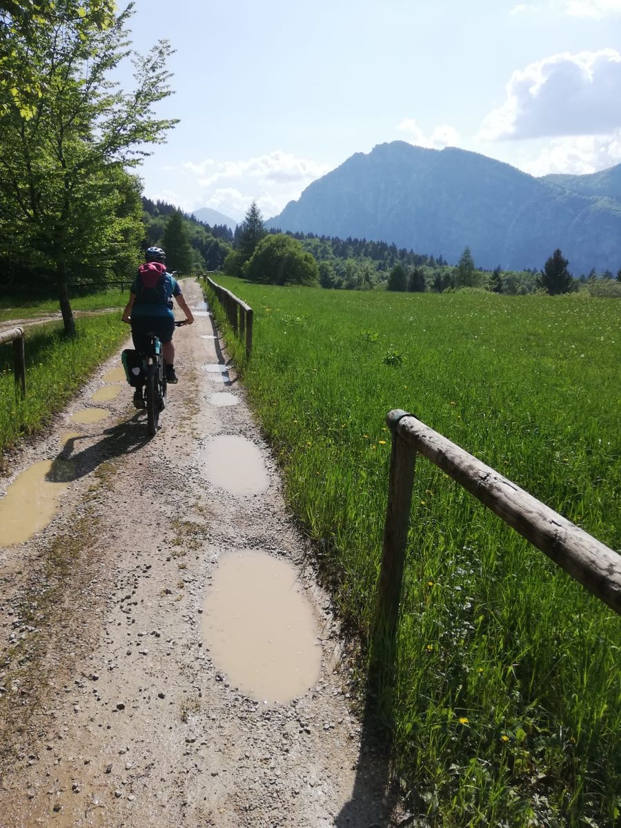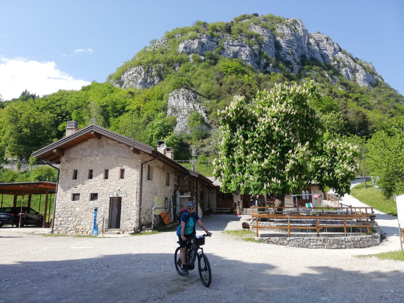 Von Arco auf Nebenstraßen nach Vigne und dann die Teerstraße (mit sporadischem Autoverkehr, an diesem Tag) zunächst etwas steiler nach Padaro, ab dort in moderater Steigung bis San Giovanni (Einkehrmöglichkeit). Ab hier Forststraßen. Zunächst weitere ca 100Hm bergauf, dann stetig bergab durch Wiesen und meist Wald nach Treni und Cavola. Vor Cavola beginnt wieder eine Teerstraße und Autoverkehr möglich. Über Ville del Monte nach Tenno und dort kurz nach der Burg links ab von der Hauptstraße auf eine Nebenstraße und kurz danach über kleine Forstwege über Volta di No runter nach Vigne und zurück nach Arco.