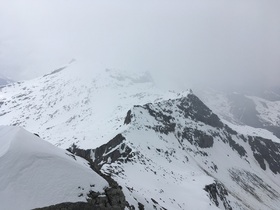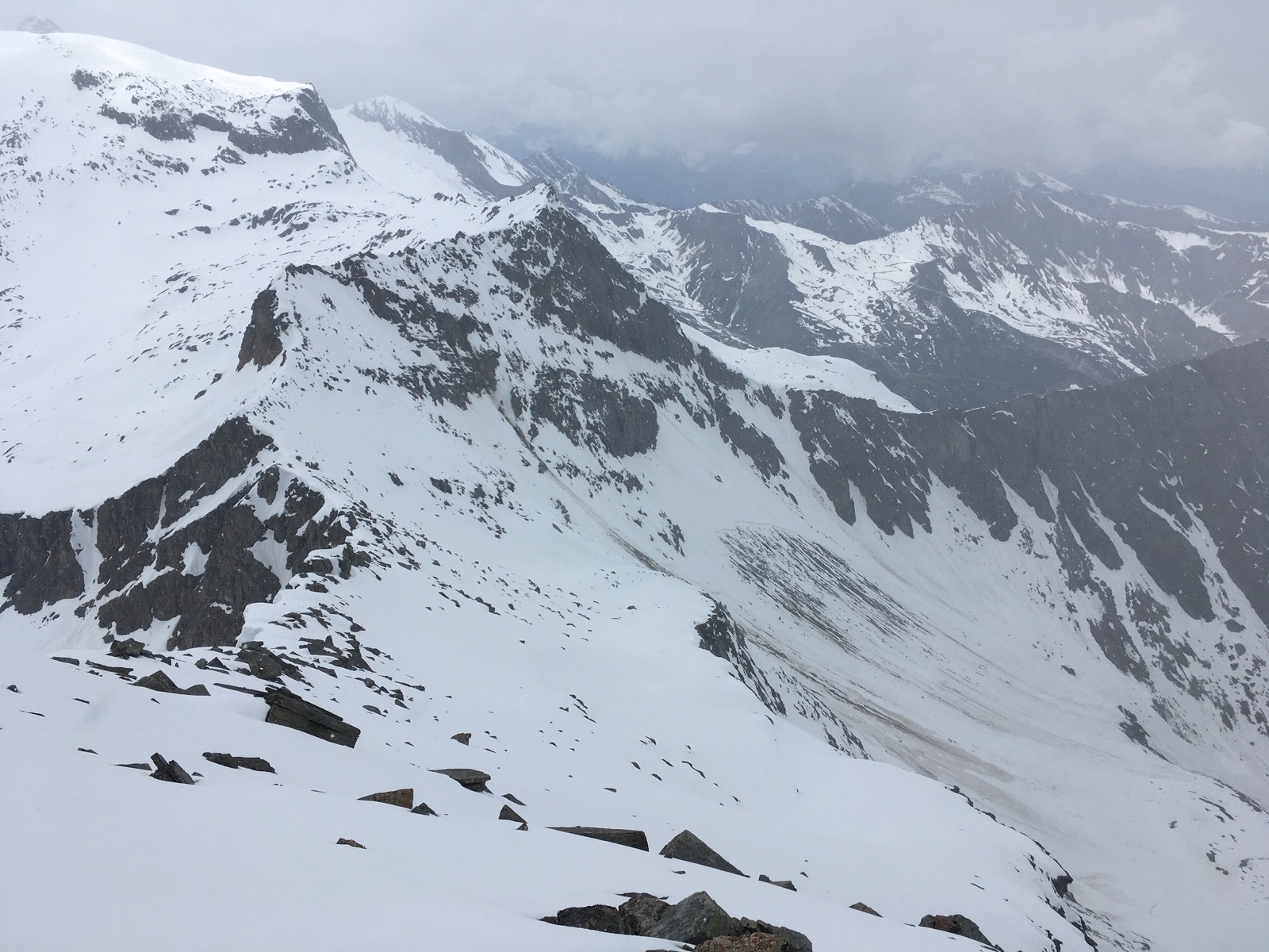 Abfahrt: Oben mal tragend, mal bruchharschig. Mitte Lawinenschnee und Nassschnee, unten Sommerschnee. Auf wirklich allerletzten Schneeresten ging es noch bis ca. 1.750 m