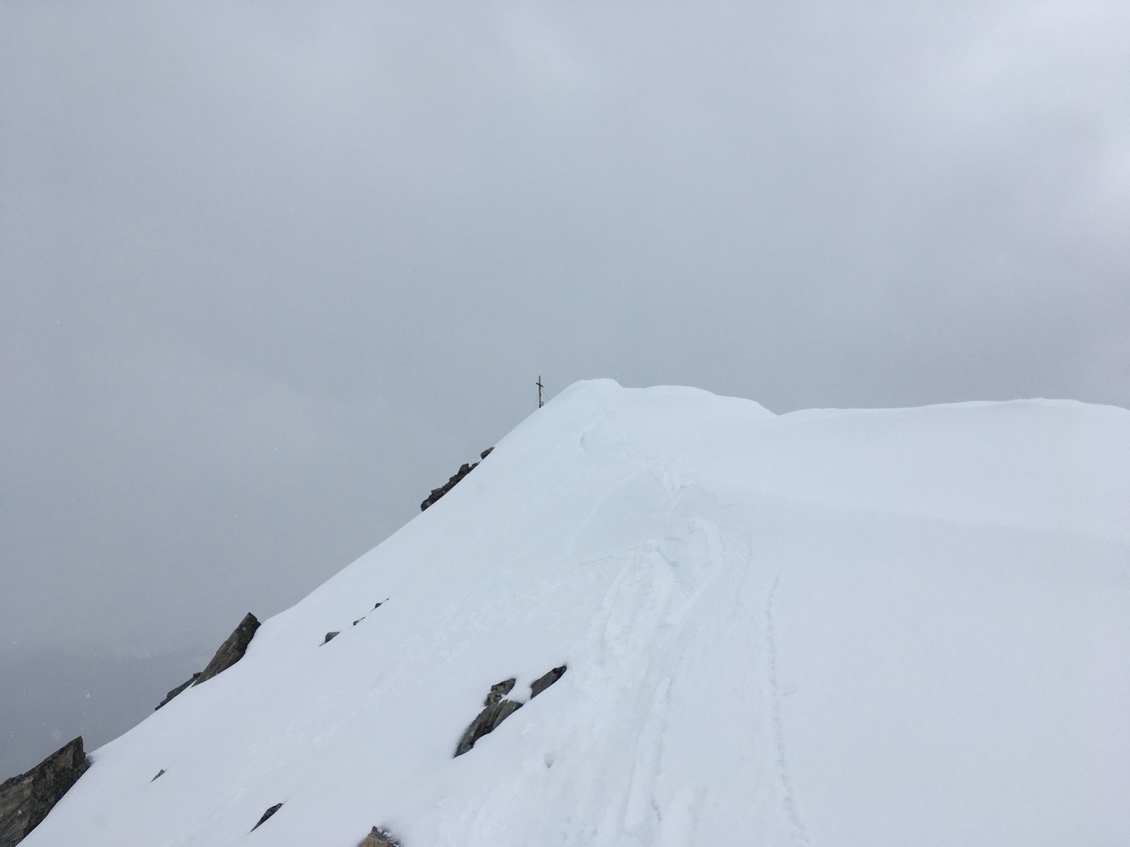 Heute nach mühsamen Start ging es von Madseit zu Fuß über die Tulfesalm ins Griererkar und ab ca. 1.840 m weiter mit Skiern. Große Teile des Kares sind durch Lawinen verunstaltet. Darunter auch eine Lawine im Steilhang der Aufstiegsroute von einer Größe, wie man sie nur selten sieht: Der ganze Hang ist im Altschnee bis auf den Grund abgegangen. Entsprechend mühsam ist der Aufstieg. Leider kam ich erst recht spät auf die Idee, hochzustapfen, statt mich mit den Skiern hochzuplagen. Ist die Steilstufe geschafft, wird es wieder leichter und geht zur Zeit mit Skiern bis zum Gipfelkreuz.