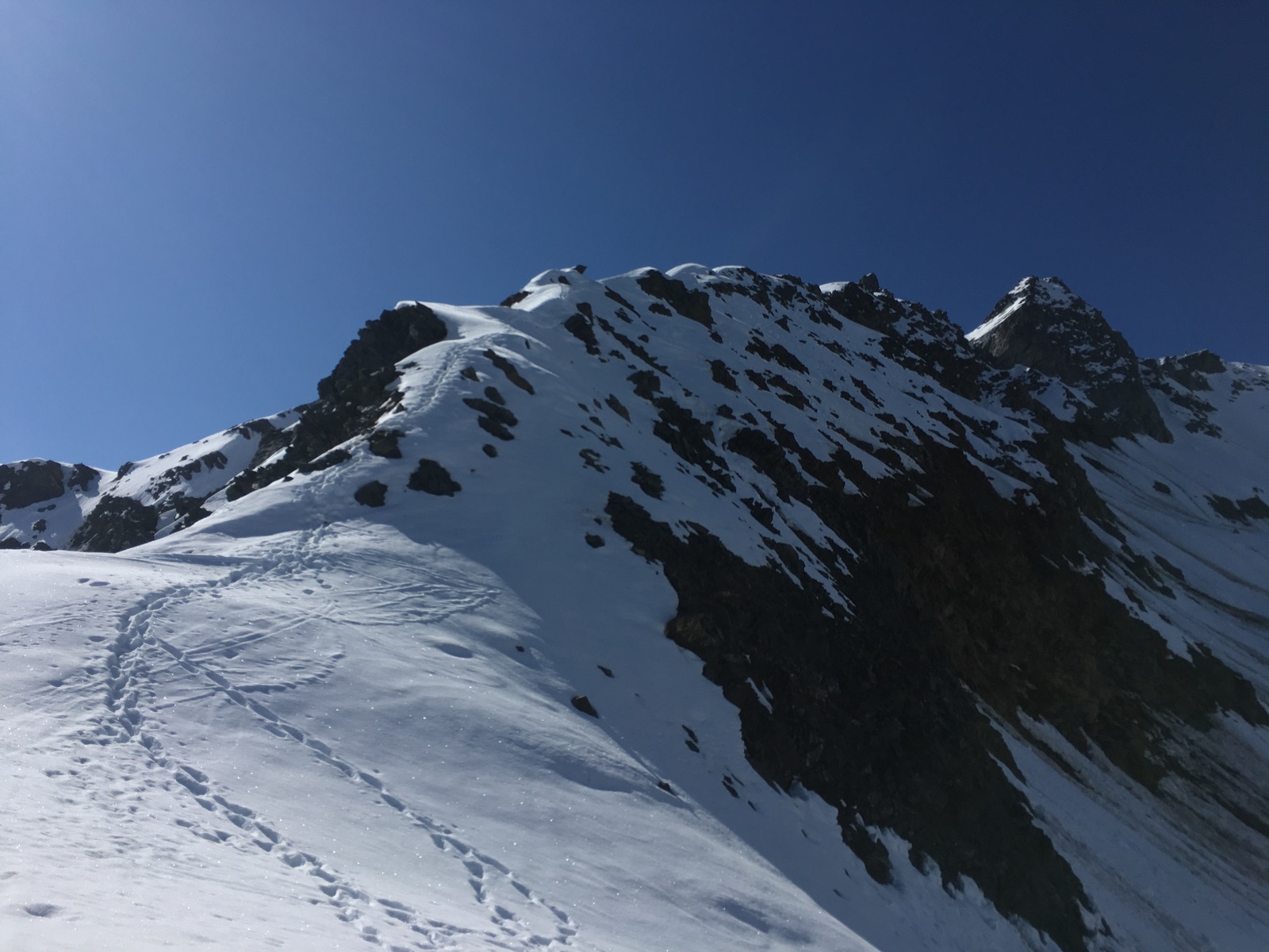Am Samstag ging es endlich mal wieder auf Skihochtour. Die Nacht Fr/Sa war wohl überwiegend klar und auch nicht zu warm, so dass der Schnee in der Höhe endlich mal wieder durchgefroren ist (das hatten wir zuletzt ja wirklich selten). Später Start um 9 Uhr: Kurz durchs Skigebiet und die letzten Meter steil zum Nörderschartl. Dann zu Fuß mit Steigeisen (dringend anzuraten) über den Grat Richtung Zahn. Tipp: Die Steigeisen schon kurz unter dem Nörderschartl (da gibt es eine Flachstelle) anlegen, dann plagt man sich nicht an der Abrutschgrenze die letzten Höhenmeter in die Scharte hoch. Ich bin nach dem Grat dann nicht der Spur nach links hoch (oder rechts hoch direkt Richtung Zahn - auch gespurt), sondern ab 3.200 m mit Skiern weiter. Man muss dann aber ca. 60 Hm abfahren / abrutschen. Ostseitig der Schnee schon um 10 Uhr ziemlich weich.