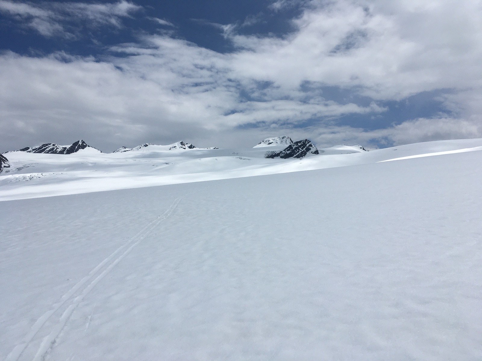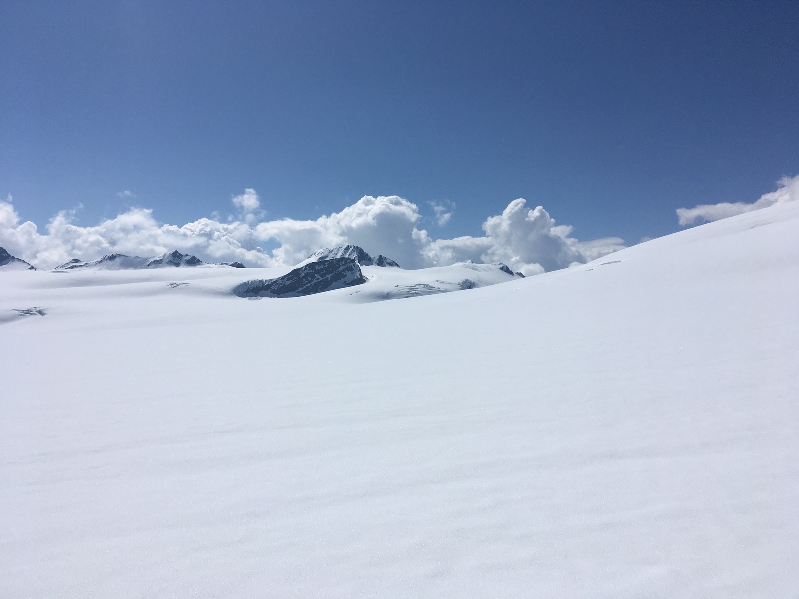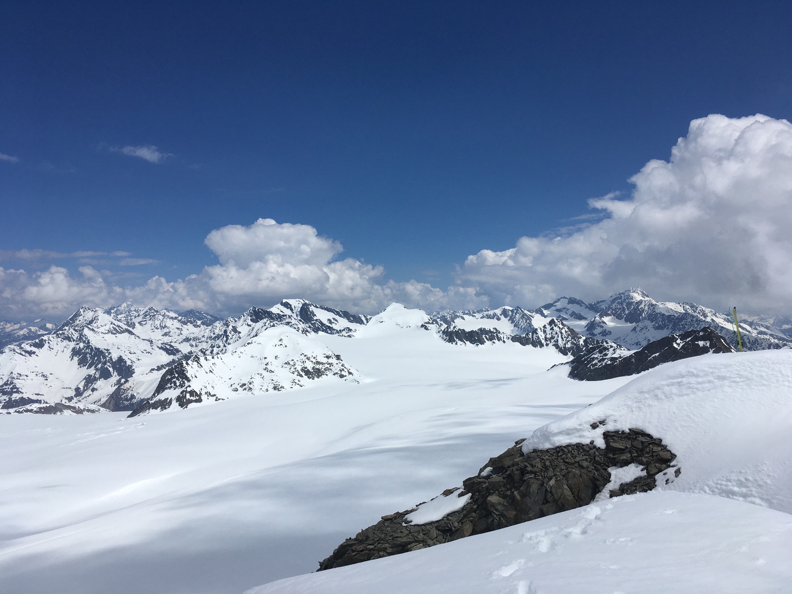 Abfahrt um 12:30 direkt vom Gipfel ordentlich - ziemlich steil nach Norden hinab (unterhalb Felsen!). Ich bin dann noch die ca. 50 Hm hoch zur Zinne durch die Ostflanke und wollte das zu Fuß machen, aber da brach man bis über die Hüfte ein. Also doch wieder mit aufgefellten Skiern. Vom Sattel zwischen Hintere Hintereisspitze und Zinne hätte es aber eine Stapfspur gegeben. Abfahrt um 13 Uhr dann außer die ostseitigen Meter von der Zinne schöner Firn. Zwischendurch muss man auch anschieben, es gibt am Gepatschferner auch einige Meter Gegenanstieg. Der Münchner Hang ist noch durchgehend fahrbar, aber leider ging der Schnee unterhalb von ca. 3.000 m rasch in tiefen Schnee über. Zwei Stunden früher abzufahren, wäre wohl deutlich besser gewesen. In der Mitte des Hanges eine offene Spalte. Über letzte Schneefelder ging es bis ca. 2.230 m hinunter. Leider meistens kein gut tragender Sommerschnee, sondern ich brach wiederholt auf Steine durch. Anschließend musste ich dann noch ziemlich mühsam über den Wanderweg über den Weißsee zurück zum Skigebietsparkplatz. Ab unterhalb Weißsee mit Skiern, davor wiederholt zu Fuß durch Schneefelder, die leider auch nicht immer getragen haben. Wenn man besser plant als ich (bzw. es sich vorher überlegt), könnte man auch mit dem Bus hoch vom Fernergrieß fahren. Fährt zur Zeit aber nur ein Mal am Vormittag und eimal am Nachmittag.