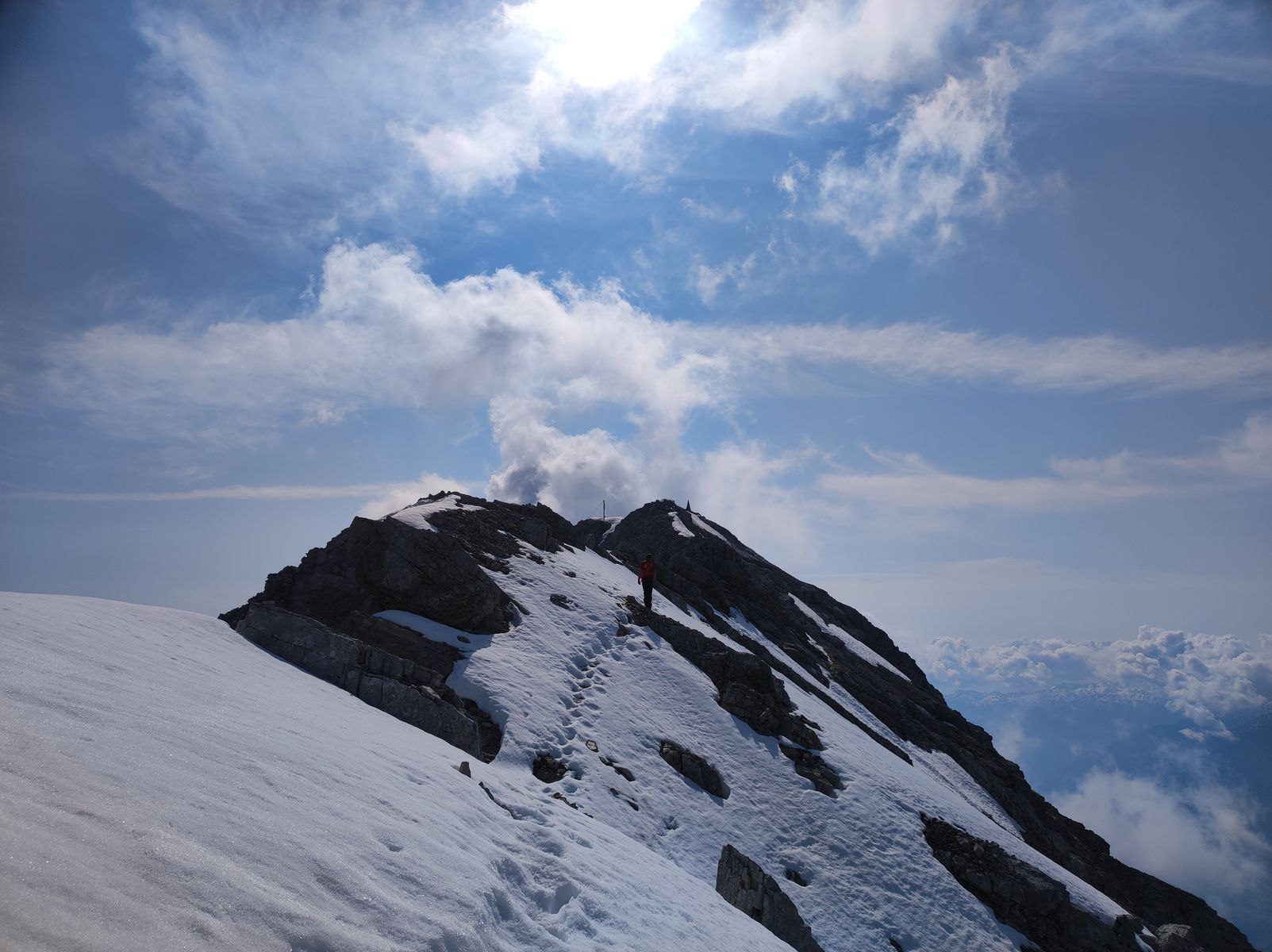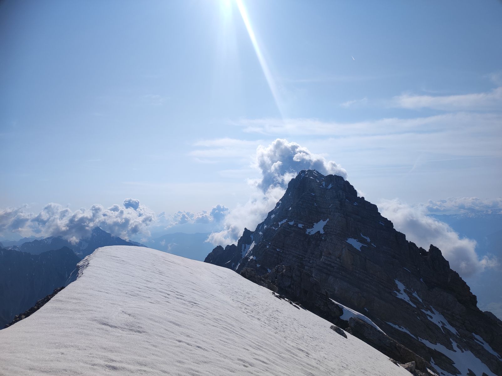 Heute in der Früh hab ich mit Michael, dem neuen Hüttenwirt, die Überschreitung von Kleinem und Großem Bettelwurf gemacht. Die Verhältnisse sind anspruchsvoll, da es vor allem beim Anstieg zum Kleinen Bettelwurf noch einige steile und morgens gefrorene Schneefelder gibt, bei denen Ausrutschen absolut Tabu ist. Grödel (hatte ich dabei) und ein leichter Pickel (hatten wir nicht) sind zu empfehlen. Auch im Abstieg vom Großen BW gibt es noch Schneefelder, aber die sind nicht so steil und enden nicht in irgendwelchen Abbrüchen. Momentan sollten nur erfahrene Leute die Überschreitung wagen.
