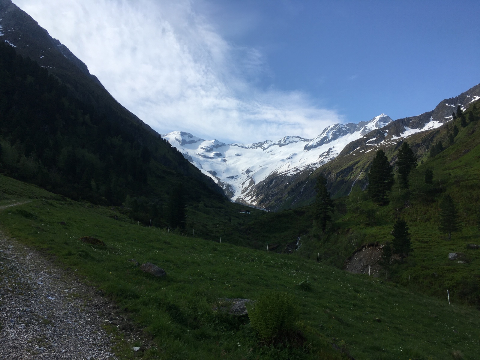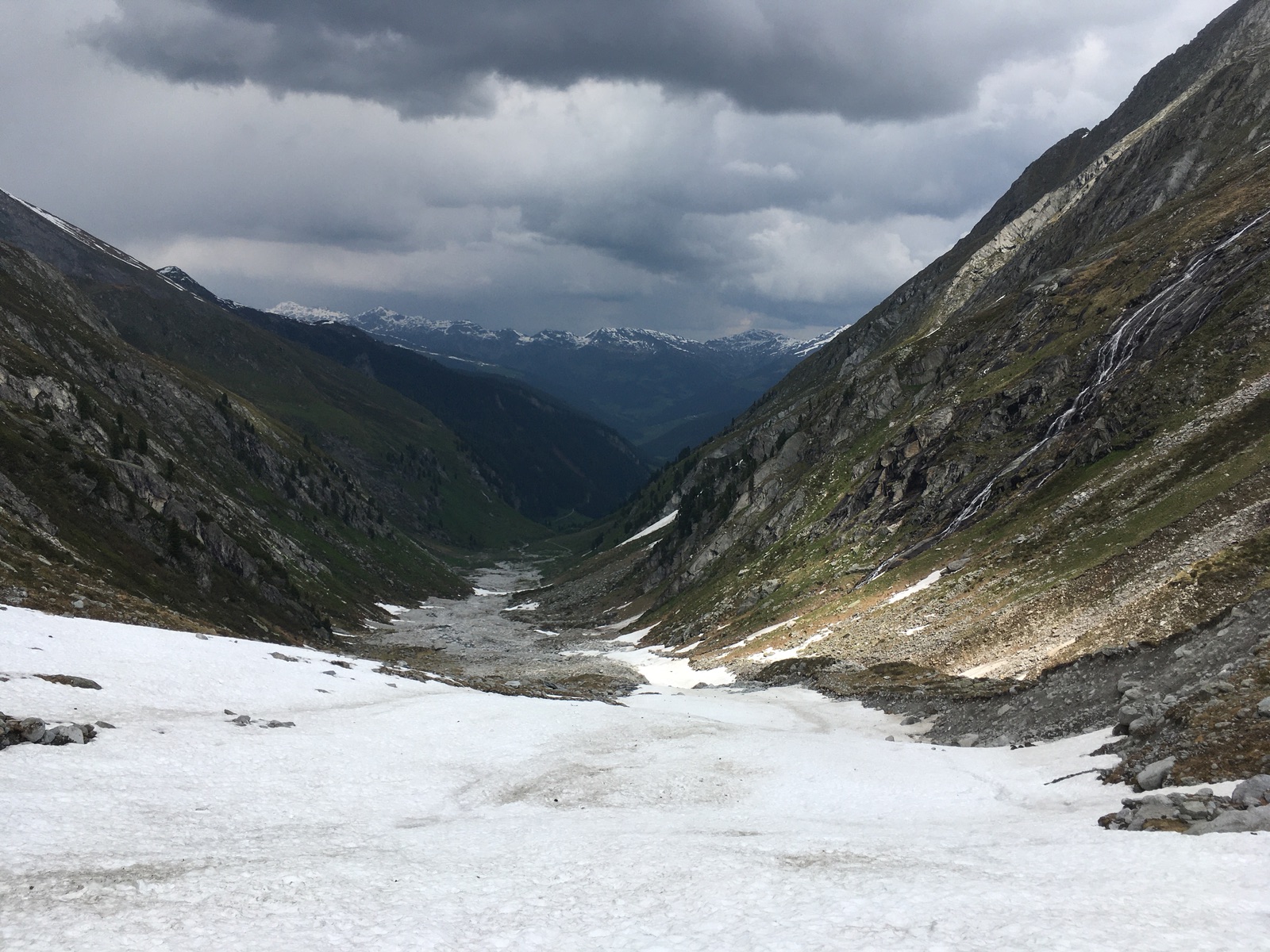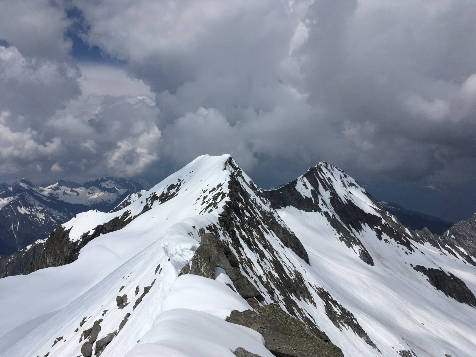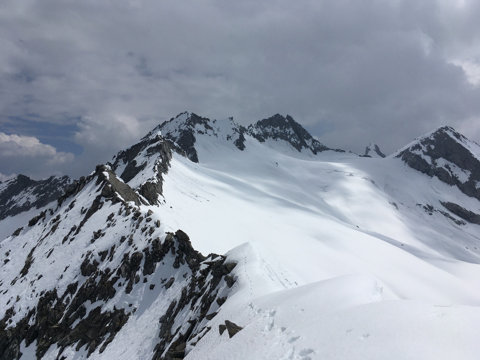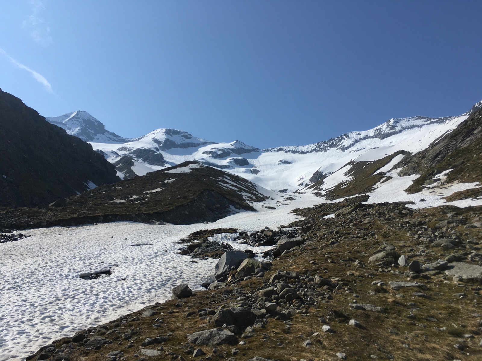 Für die Abfahrt bot es sich an, gleich oben am Grat zu starten und vorsichtig hinabzurutschen / treppeln. Dann oben schöner Firn (12:30 Uhr, ca. 2 h früher wäre sicher ideal gewesen), Mittelteil bruchharschig / Nassschnee (ging aber mit langen Bögen), dann ab ca. 2.500 m Sommerschnee. Es liegt noch durchgehend Schnee bis ca. 1.950 m herunter. Insgesamt gute Skiverhältnisse, das hatte ich zuletzt deutlich schlechter. Überhaupt scheint in diesem Eck (und der Venedig-/Glocknergruppe?) deutlich mehr Schnee als andernorts zu liegen.