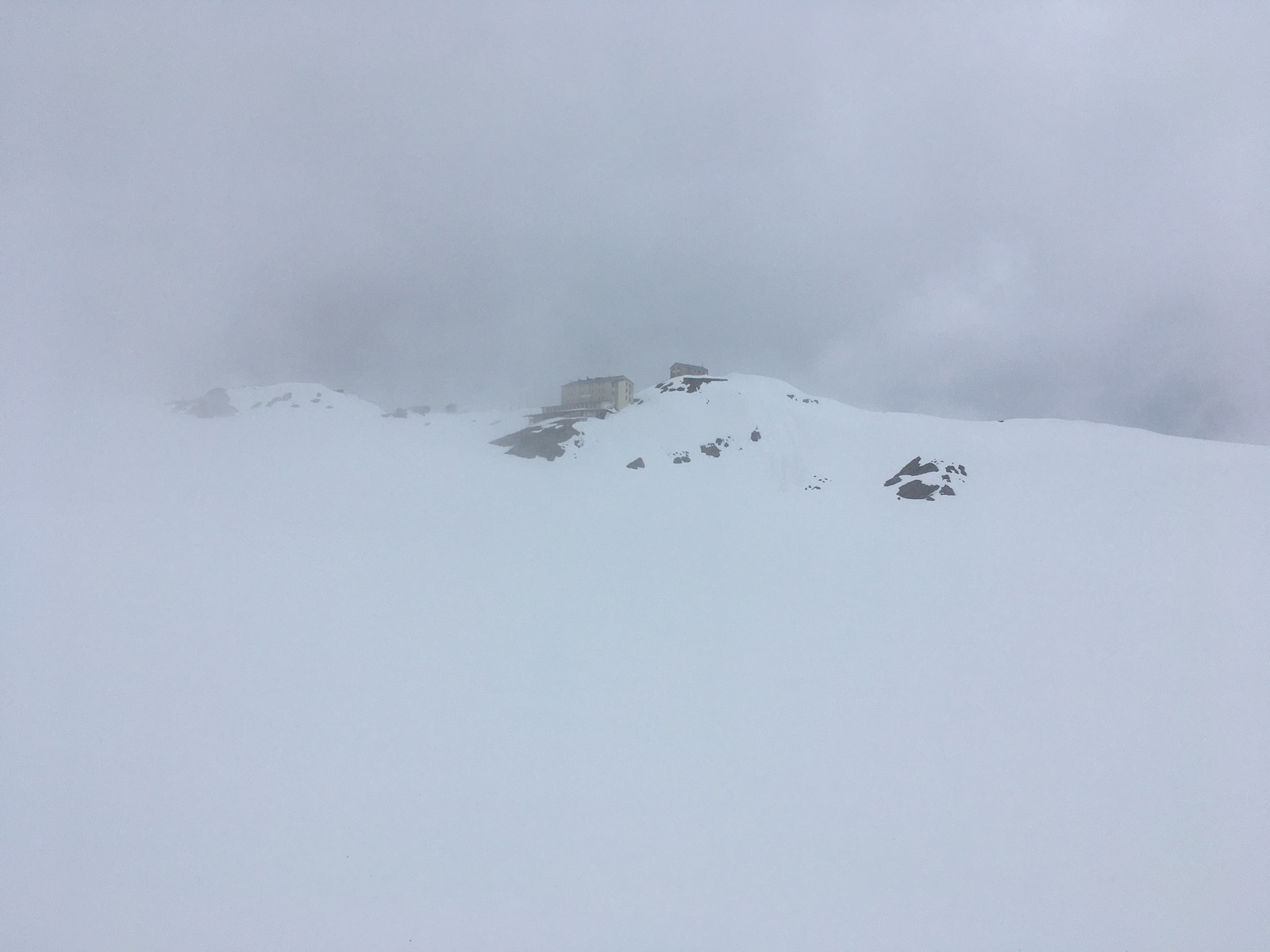 Blick zum noch geschlossenen Rifugio Casati in einem kurzen Moment, wo sich der Nebel im oberen Bereich gelichtet hatte: