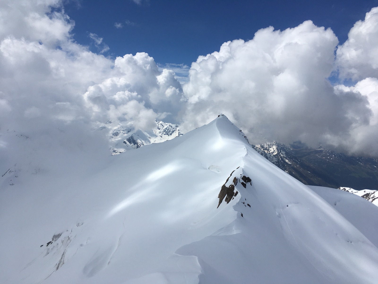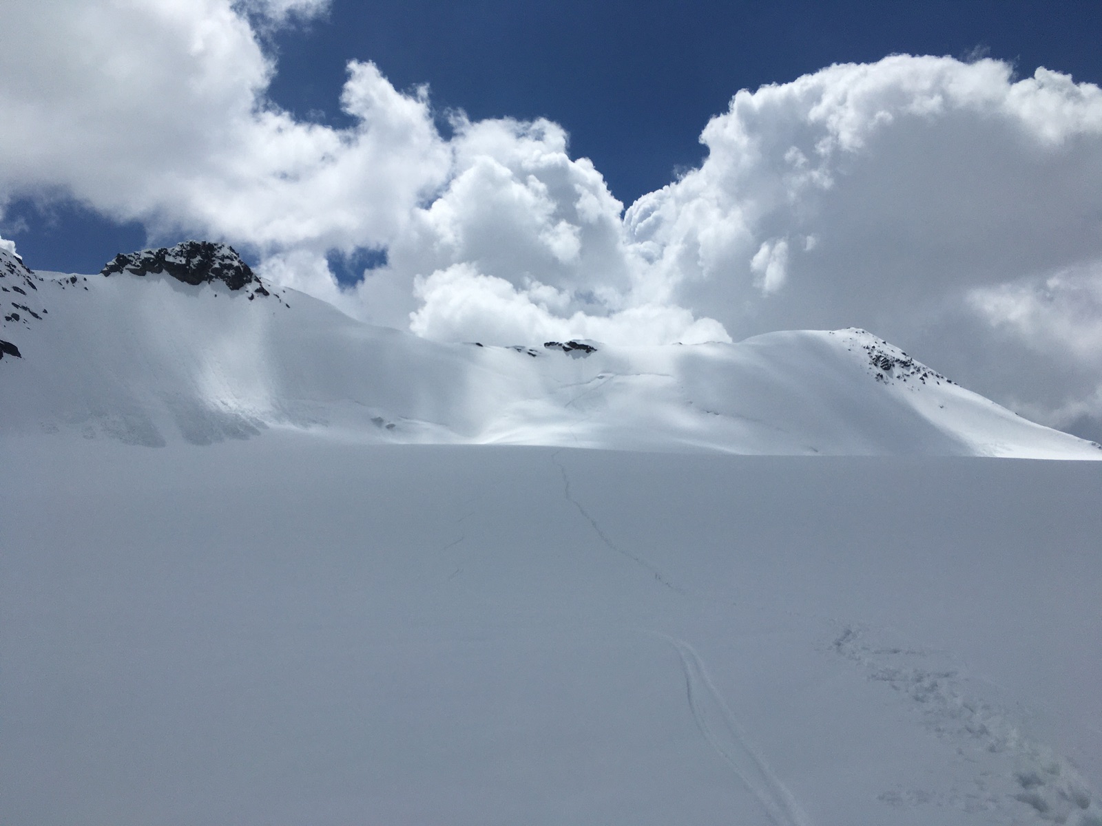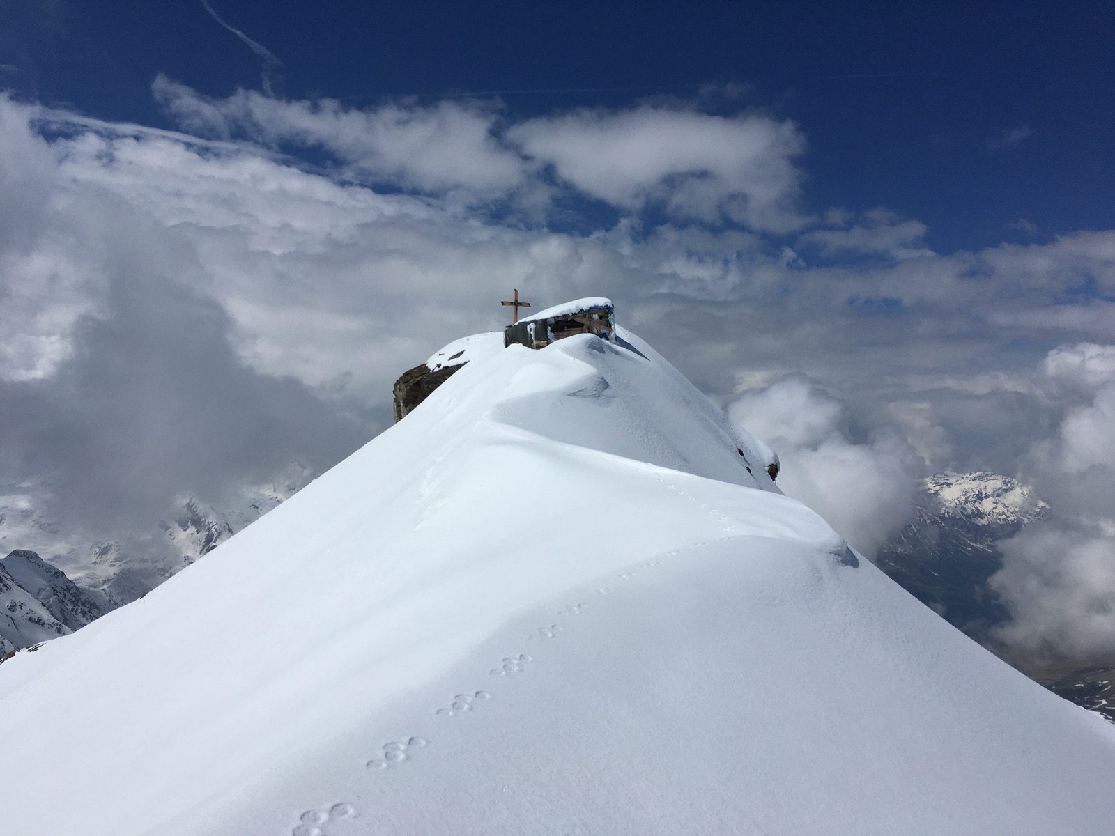Die Zufallspitze wurde auch noch mitgenommen (man braucht gar nicht erst abfellen), die letzten Meter zum höheren Südgipfel zu Fuß / kraxeln. Abfahrt oben firnig, die (westseitige) Steilstufe noch eher hart, dann unterhalb ca. 3.200 m etwas tieferer Schnee (die Nacht war wohl eher bedeckt). Bis ca. 2.840 m kommt man durchgehend mit Skiern herunter, darunter muss man suchen und die Rinne wechseln, aber es geht noch bis in den Boden bei der Marteller-Hütte. Unten dann auch der erhoffte Sommerschnee.