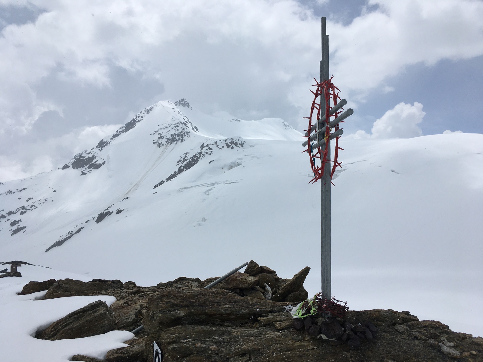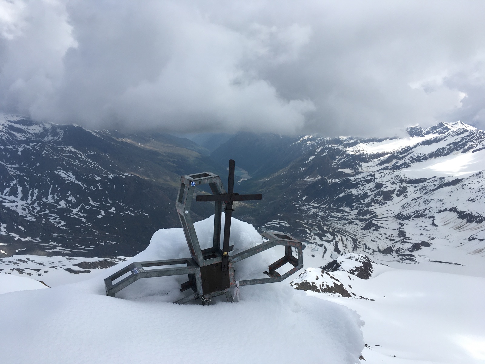 Eigentlich wollte ich über den Zufallferner aufsteigen. Nur hatte ich die Karte nicht ausreichend studiert und vor Ort auch nicht Lust, diese auszupacken. Und so war ich am Abzweig des Sommerwegs zur Martellhütte (Winterweg geht nicht mehr) schon vorbei, als ich das bemerkte. Und Lust zum Zurückgehen hatte ich auch nicht. Zur Zeit ist es aber ohnehin etwas verwirrend, weil durch die Sperre der alten Staumauer vor Ort eine Umleitung besteht, die nicht ganz selbsterklärend ist. Folglich ging es auf dem Sommerweg weiter Richtung Langerferner. "Dank" der sonnseitigen Ausrichtung ist der Weg bis auf kleinere Schneefelder ab ca. 2.600 m schon weit hinauf aper. Auf gut 2.725 m geht es dann durch Schutt-und Bröselgelände hinab zum Gletscherboden. Die in der Karte eingezeichneten Pfadspuren fand ich nicht - möglicherweise gibt es die auch nicht mehr. Das Gelände ist aber grundsätzlich gangbar. Ab dem Schneebeginn auf ca. 2.700 m ging es dann in ca. 3 h mit Skiern hoch bis zum Gipfel. Wobei mich allein der Gipfelhang am Ende fast eine Stunde gekostet hat. Über die Randspalte - leicht offen - ging es zwar noch mit Skiern (+ Harscheisen) drüber (eine Fußgängerspur drehte da um), aber dann wurde es doch so steil, dass ich auf Stapfen umsteigen musste. Mitten im Steilhang ist so etwas ja immer etwas unangenehm. Die mitgeschleppten Steigeisen wurden aber nicht benötigt. Wegen einer (Neu-?)Schneeschicht, die immer leicht wegrutschte, war mit das eigentlich geplante Durchgehen mit Skiern aber zu heikel.