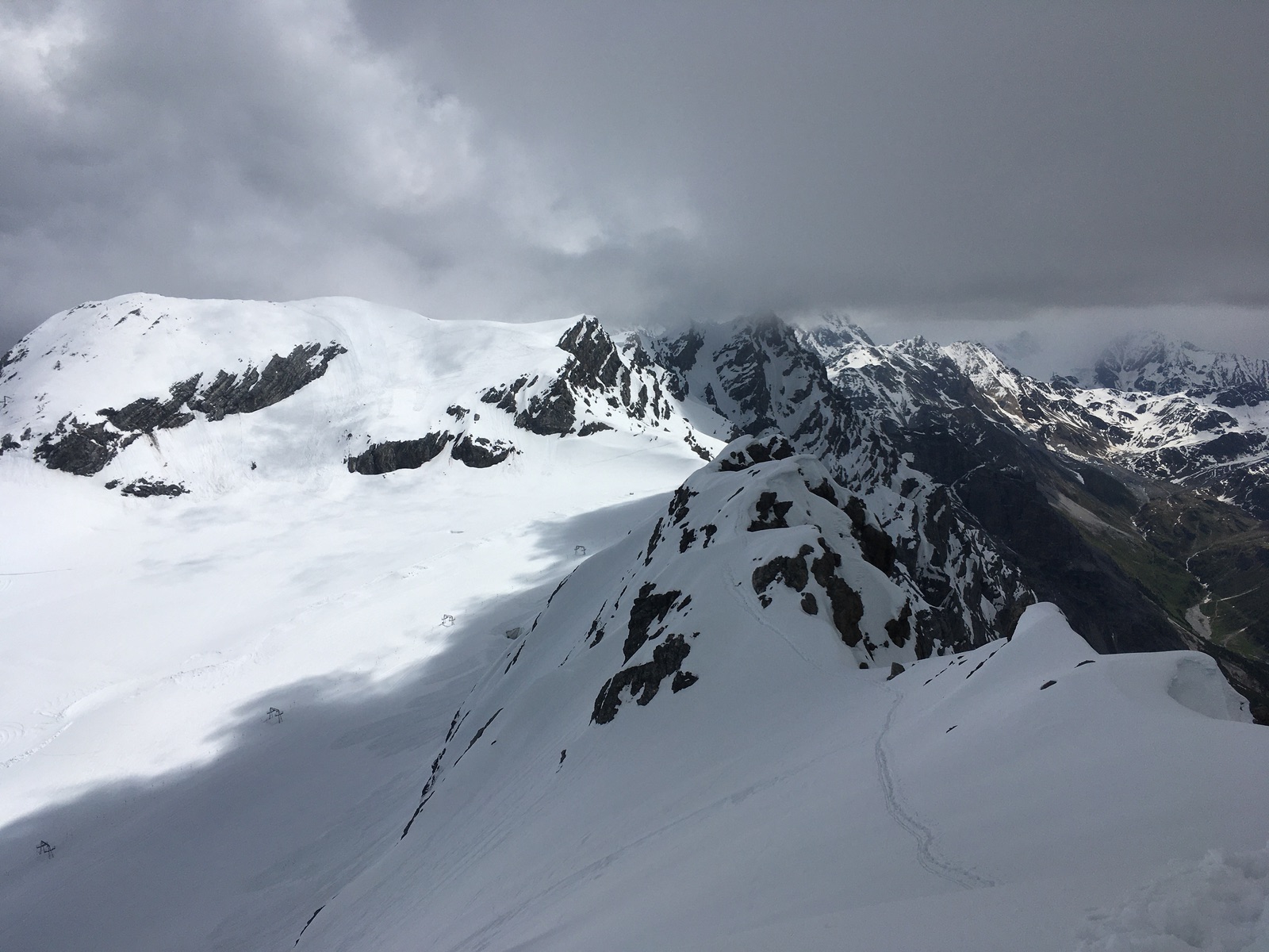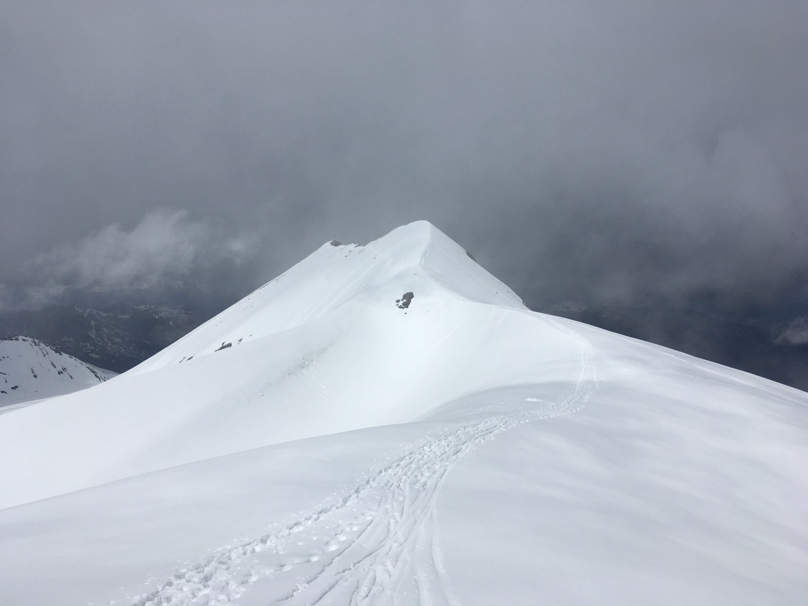 Zur Hohen Schneide kann man bis auf zwei kurze Passagen (einmal am Grat und die letzten Kraxelmeter zum Gipfel) alles mit Skiern gehen. Womöglich, weil es teilweise ziemlich ausgesetzt ist, hat das aber außer mir keiner gemacht. Zu Fuß brach man den Spuren nach aber teilweise tief in den Schnee ein. Zu "meiner" Kristallspitze (Nebengipfel der Geisterspitze) geht es ohnehin mit Skiern bis zum Gipfelsteinmann. Die (späte) Abfahrt bot außerhalb der Pisten wie bei diesen Verhältnissen erwartet eher tiefen Schnee. Auf der Piste wäre es grundsätzlich gelaufen - teilweise sehr flach. Aber da ein im Wetterbericht ebenfalls nicht prognostizierter heftiger Graupelschauer und unten starker Regen genau zu meiner Abfahrt aufzogen, waren die Schneeverhältnisse am Ende zweitrangig.