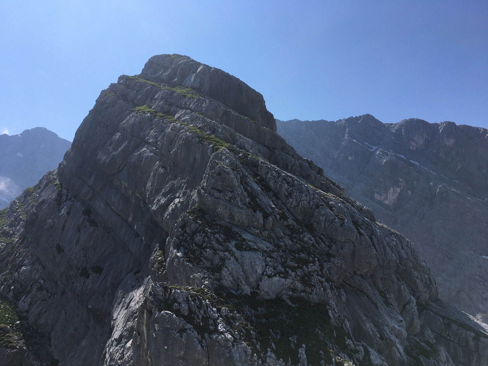 Blick aus der Watzmannscharte auf den Gipfelaufbau des 1. Watzmannkindes - offenbar geht es da durch, auch wenn es ungangbar scheint;