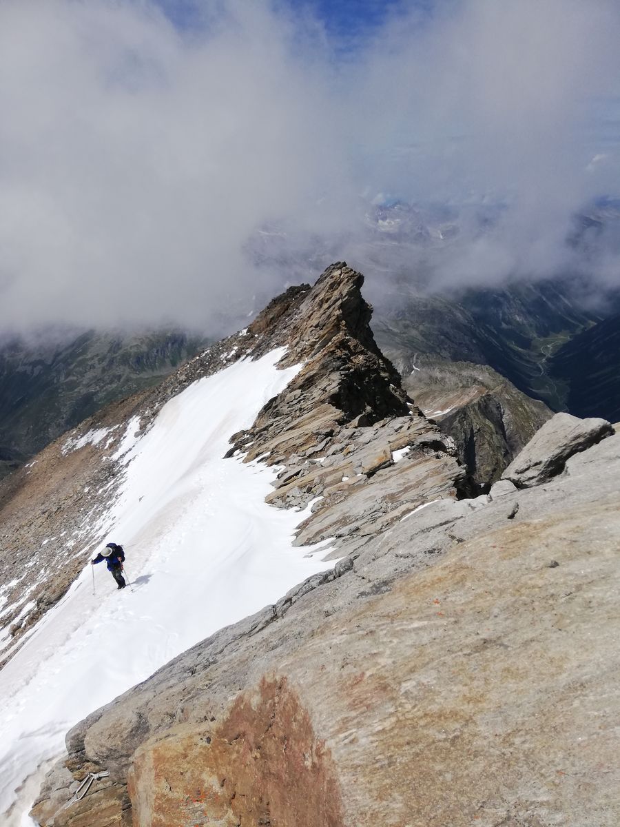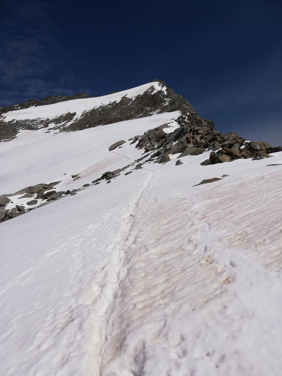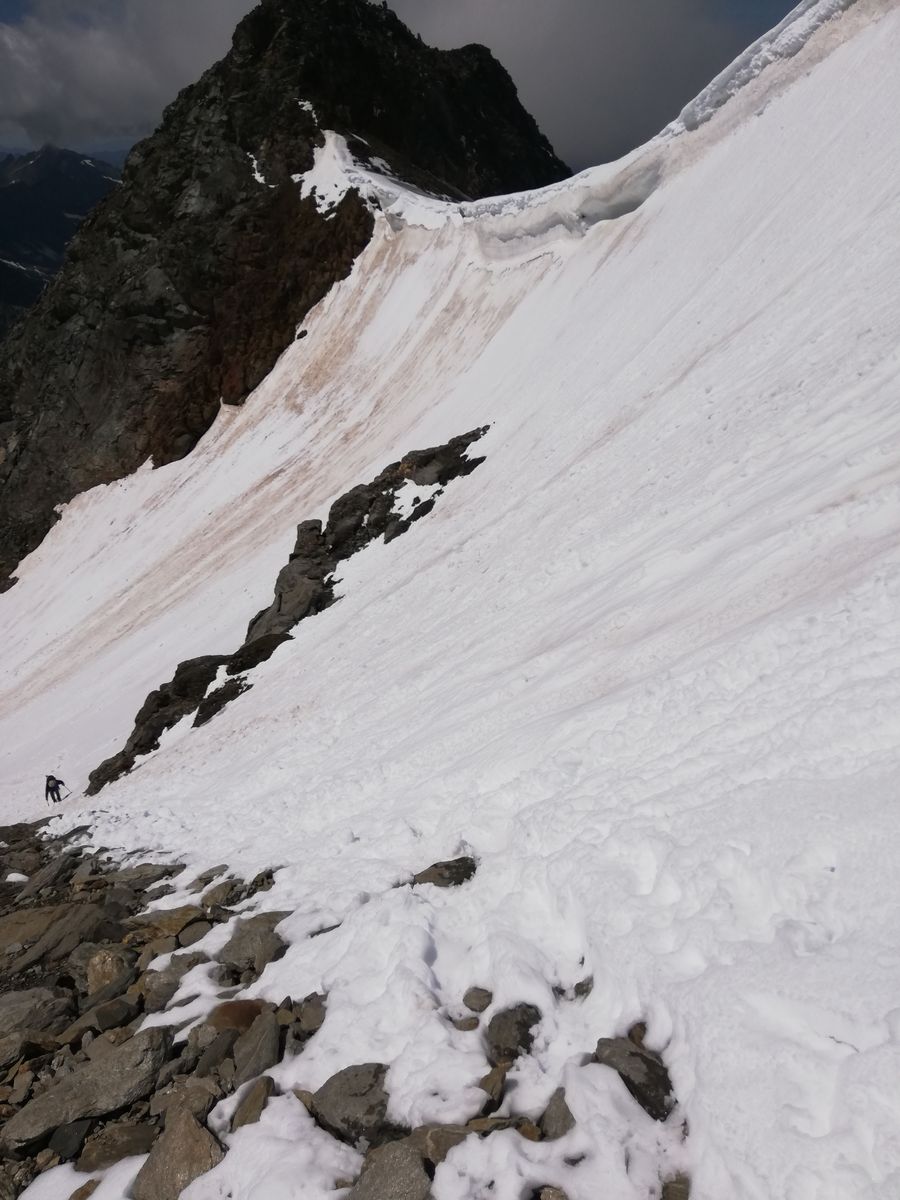 Von der Hütte aus sind wir am nächsten Morgen zunächst den gut markierten Gletscherpfad bis zu dessen Ende nahe der Gletscherzunge (vermutlich kommen die Wegebauer dem Gletscherrückzug nicht hinterher) des Umbalkeeses gegangen (große Steinpyramide, Ende der Markierungen). Von dort sind wir, den Empfehlungen des Hüttenteams folgend, weglos entlang eines Bachs, gerade hoch (einfach durch begrüntes Blockgelände (kein Moränenschutt) zur (in Aufstiegsrichtung) linken Seitenmoräne angestiegen und haben diese in einer kleinen Senke betreten. Nun nicht nach links Richtung Hinteres Umbaltörl, sondern nach rechts (Nordost) auf der Seitenmoräne weiter (zwei Steinmänner). Relativ bald ist die Seitenmoräne nicht mehr ausgeprägt und man steigt weiter Richtung Nordost über die begrünten Hänge empor. Diese gehen dann allmählich in ehemaliges Gletschergelände über und wir sind weiter über Gletscherschliffe bzw. Rinnen dazwischen immer leicht rechts (Nordost) haltend bis zum Beginn des Althauskeeses angestiegen. Ab der oben erwähnten Pyramide alles weglos, aber einfach, nie schwerer als maximal I+, aber sehr unübersichtlich. Im Gletscherschliffgelände haben wir selbst einige Steinmänner gebaut, um den Rückweg wieder zu finden. Wahrscheinlich kann man auch westlich von unserer Route genauso gut aufsteigen. Auf dem Althauskees zunächst über Blankeis relativ steil (30-35 Grad), später über Firn und flacher mehr oder weniger gerade hoch bis zur Spur, die vom Hinteren Umbaltörl (bzw. der Lenkjöchlhütte) kommt und nahe entlang der Felsen flach, manchmal auch leicht fallend, nach Osten bis zum Beginn der langen "Rampe" an der Stelle, an der ein steiler Felsgrat im Gletscher verschwindet, führt. Auf dem Gletscher mehrere Spalten, davon zwei größere, aber alle noch gut verschneit. Zunächst ein Schneefeld hoch, das sich zu einer Schneerinne verjüngt, die an einer Stelle nur noch einen Meter breit ist (hier apern Felsplatten aus), sich dann aber zu einer breiten Schneeflanke weitet. Hier immer am rechten Rand entlang der Felsen hoch (bei Blankeis könnte man wohl auch durchgehend die Felsen benutzen, schaut einfach, aber brüchig aus). Wir hatten durchgehend guten Trittfirn, sind aber mit Steigeisen gegangen. Die ganze Flanke dürfte in der Rinne etwas über 35 Grad, darunter und darüber etwas weniger steil sein und ist insgesamt etwa 200Hm hoch .