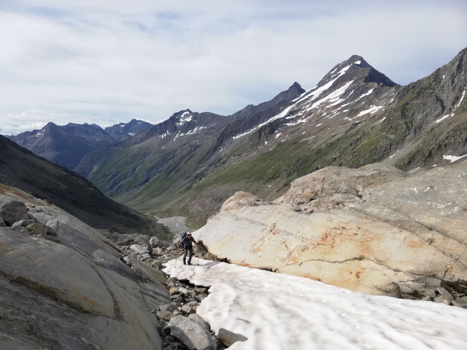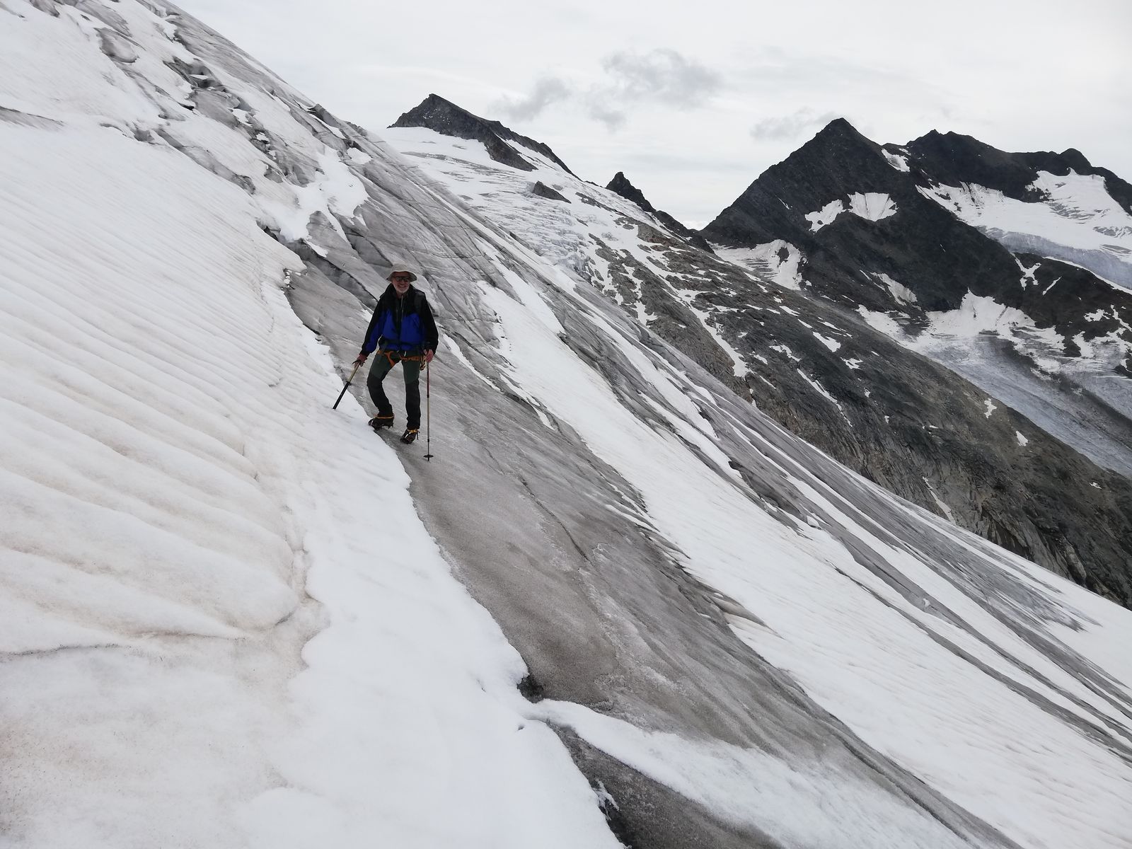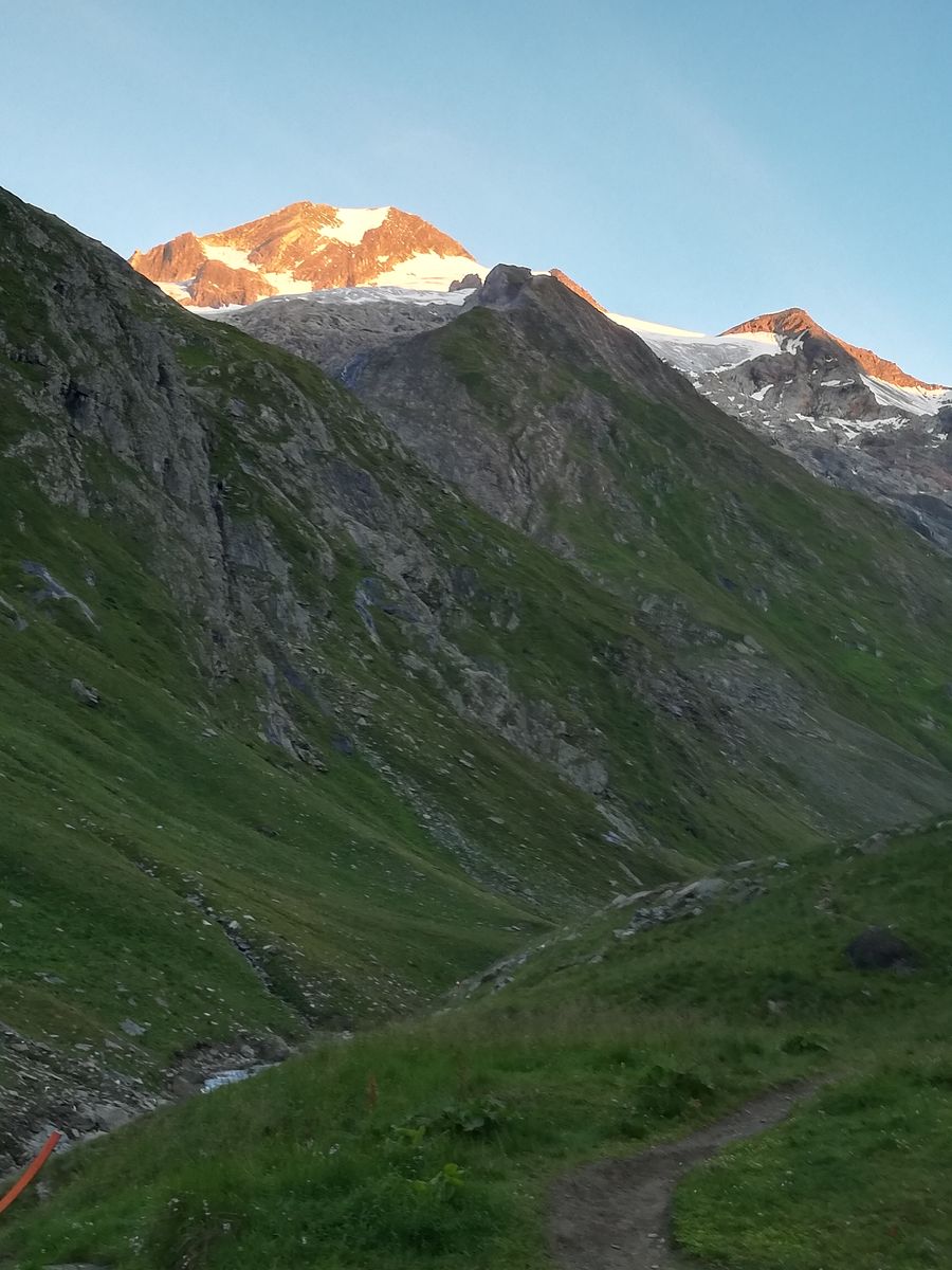 Von der Hütte aus sind wir am nächsten Morgen zunächst den gut markierten Gletscherpfad bis zu dessen Ende nahe der Gletscherzunge (vermutlich kommen die Wegebauer dem Gletscherrückzug nicht hinterher) des Umbalkeeses gegangen (große Steinpyramide, Ende der Markierungen). Von dort sind wir, den Empfehlungen des Hüttenteams folgend, weglos entlang eines Bachs, gerade hoch (einfach durch begrüntes Blockgelände (kein Moränenschutt) zur (in Aufstiegsrichtung) linken Seitenmoräne angestiegen und haben diese in einer kleinen Senke betreten. Nun nicht nach links Richtung Hinteres Umbaltörl, sondern nach rechts (Nordost) auf der Seitenmoräne weiter (zwei Steinmänner). Relativ bald ist die Seitenmoräne nicht mehr ausgeprägt und man steigt weiter Richtung Nordost über die begrünten Hänge empor. Diese gehen dann allmählich in ehemaliges Gletschergelände über und wir sind weiter über Gletscherschliffe bzw. Rinnen dazwischen immer leicht rechts (Nordost) haltend bis zum Beginn des Althauskeeses angestiegen. Ab der oben erwähnten Pyramide alles weglos, aber einfach, nie schwerer als maximal I+, aber sehr unübersichtlich. Im Gletscherschliffgelände haben wir selbst einige Steinmänner gebaut, um den Rückweg wieder zu finden. Wahrscheinlich kann man auch westlich von unserer Route genauso gut aufsteigen. Auf dem Althauskees zunächst über Blankeis relativ steil (30-35 Grad), später über Firn und flacher mehr oder weniger gerade hoch bis zur Spur, die vom Hinteren Umbaltörl (bzw. der Lenkjöchlhütte) kommt und nahe entlang der Felsen flach, manchmal auch leicht fallend, nach Osten bis zum Beginn der langen "Rampe" an der Stelle, an der ein steiler Felsgrat im Gletscher verschwindet, führt. Auf dem Gletscher mehrere Spalten, davon zwei größere, aber alle noch gut verschneit. Zunächst ein Schneefeld hoch, das sich zu einer Schneerinne verjüngt, die an einer Stelle nur noch einen Meter breit ist (hier apern Felsplatten aus), sich dann aber zu einer breiten Schneeflanke weitet. Hier immer am rechten Rand entlang der Felsen hoch (bei Blankeis könnte man wohl auch durchgehend die Felsen benutzen, schaut einfach, aber brüchig aus). Wir hatten durchgehend guten Trittfirn, sind aber mit Steigeisen gegangen. Die ganze Flanke dürfte in der Rinne etwas über 35 Grad, darunter und darüber etwas weniger steil sein und ist insgesamt etwa 200Hm hoch .