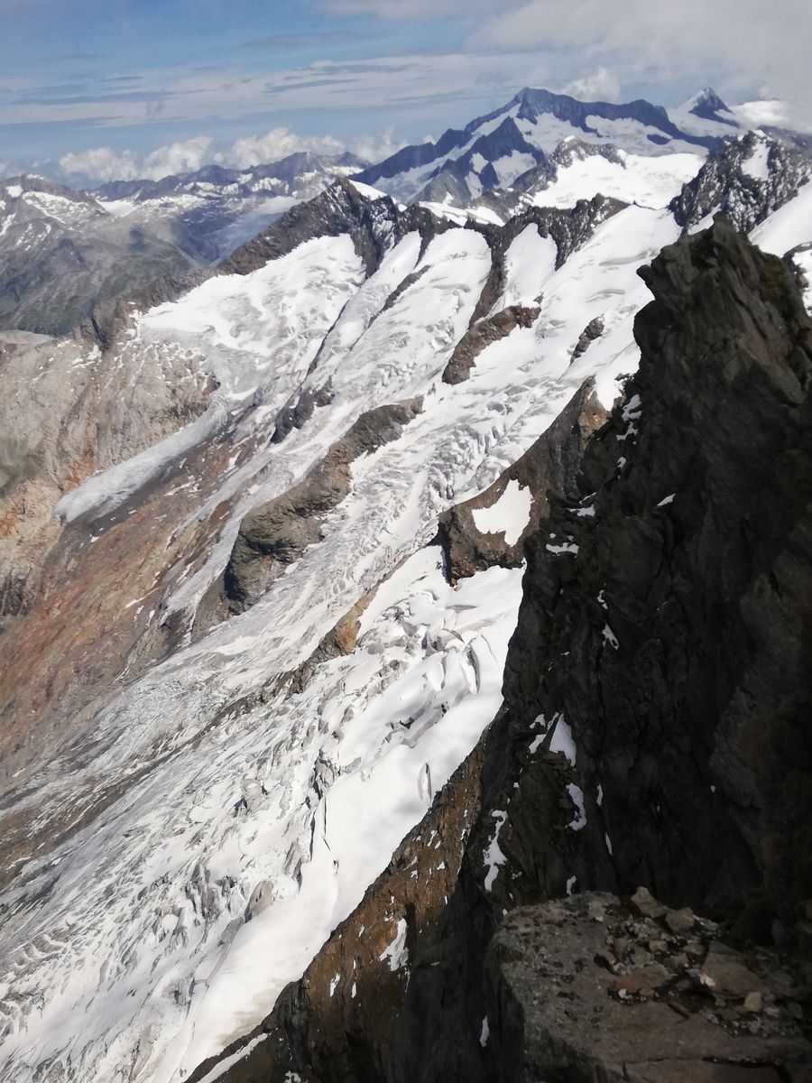 Am rechten Rand der Flanke kann man auch problemlos auf den nachfolgenden Schneegrat aussteigen (weiter links überwechtet; in der Flane besteht Gefahr, von einem Wechtenbruch erwischt zu werden). Anschließend entlang des Felsgrates (Südgrat) direkt Richtung Gipfel, teilweise über Schnee mit einer wenige Meter hohen Steilstufe von gut 40 Grad, teils über Felsen, oder - wie wir - flacher, aber etwas weiter und überwiegend durch Schnee in großem Bogen nach links Richtung P. 3418 der AV-Karte und dann nach Rechtskurve entlang des Nordwestgrates zum Gipfel. Die letzten paar Meter einfache Blockkletterei (I).