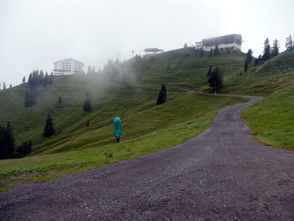 Direkt vom Parkplatz weg geht es zunächst auf einer aspahltierten Straße schon recht steil hinauf zur Fleckalm. Bis hierher ist die Straße für Gäste der Fleckalm mit dem PKW befahrbar. Heut war aber keiner unterwegs. Ab der Fleckalm geht's auf einer geschotterten Forststraße hinauf zum Megahotel auf der Ehrenbachhöhe (Bild 1). Im Winter das Mekka des Kitzbühler Skiraums. heute neblig, leer und auch ziemlich frisch. Wenn man die Ehrenbchhöhe hat liegt der steilste Teil bereits hinter einem. Der hat's aber durchaus in sich und ist Teil des alljährlichen Kitz-Alp-Bike-Spektakels.