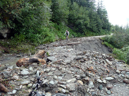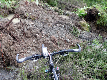 Auf halber Höhe bin ich dann aber links abgebogen, um den Auracher Höhenweg zu fahren. Gute Entscheidung, denn dadurch gab es auch ein bißchen Abenteuer-Charakter in de Tour. Durch die Starkregenfälle der letzten Nacht gab es hier nämlich praktisch an jedem Bach eine größere oder kleinere Mure, d.h. immer wieder muss man absteigen und das Bike durch den Schlamm tragen oder über Bäume heben.
