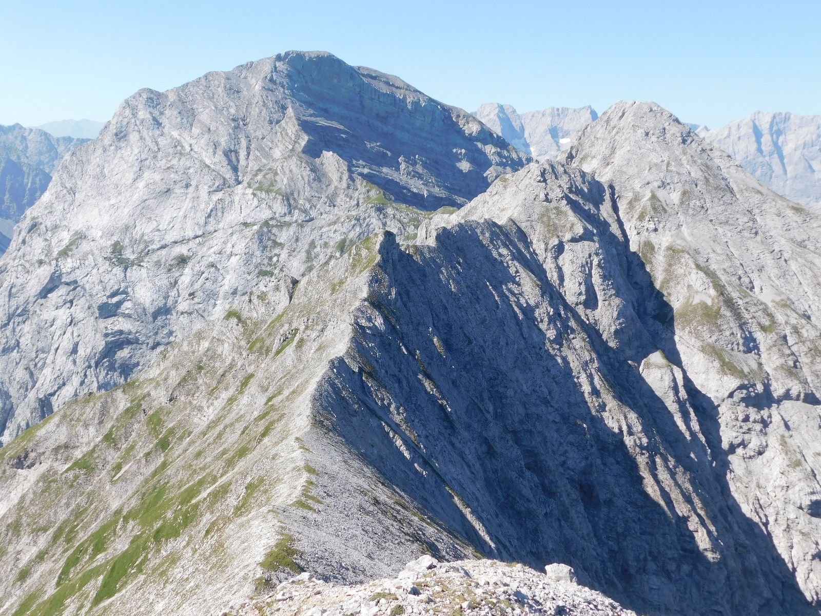 Blick vom südlichen Vorgipfel der Bettlerkarspitze auf den weiteren Gratverlauf. Die Schaufelspitze ist rechts - der Weiterweg zum Sonnjoch (links hinten) wäre schwieriger:
