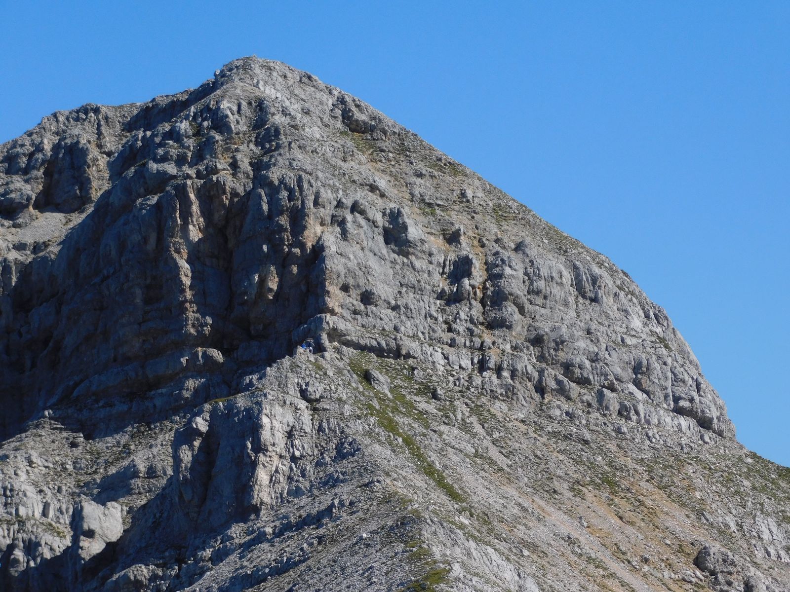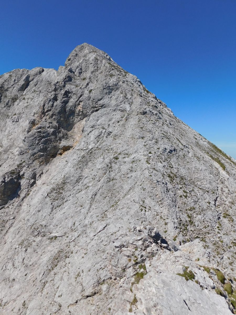 Blick von der letzten Scharte auf den Gipfelaufbau der Schaufelspitze. Beim direkten Anstieg fand ich alles zu wacklig und sandig, ich bin hier rechts aussenrum gequert: