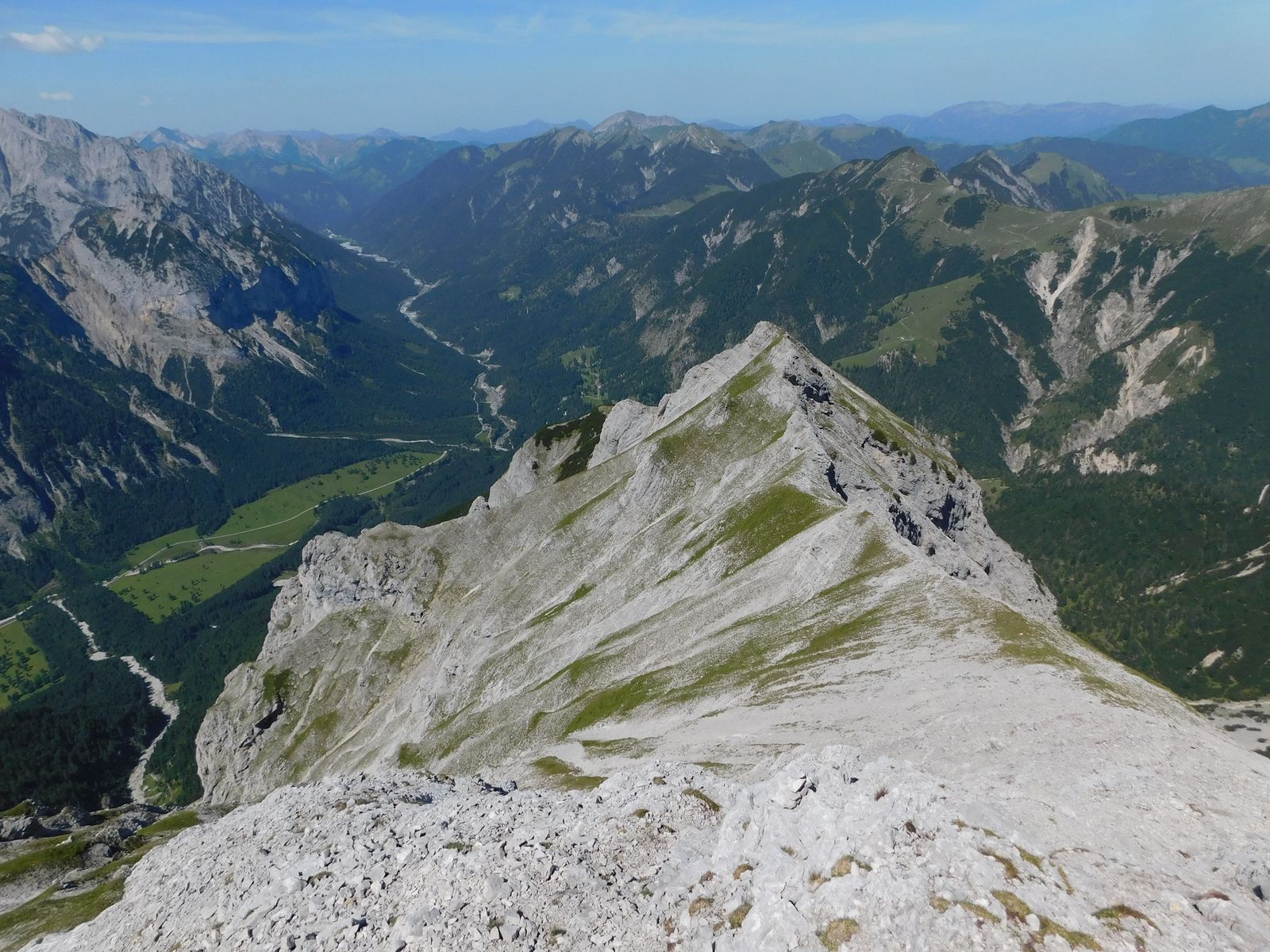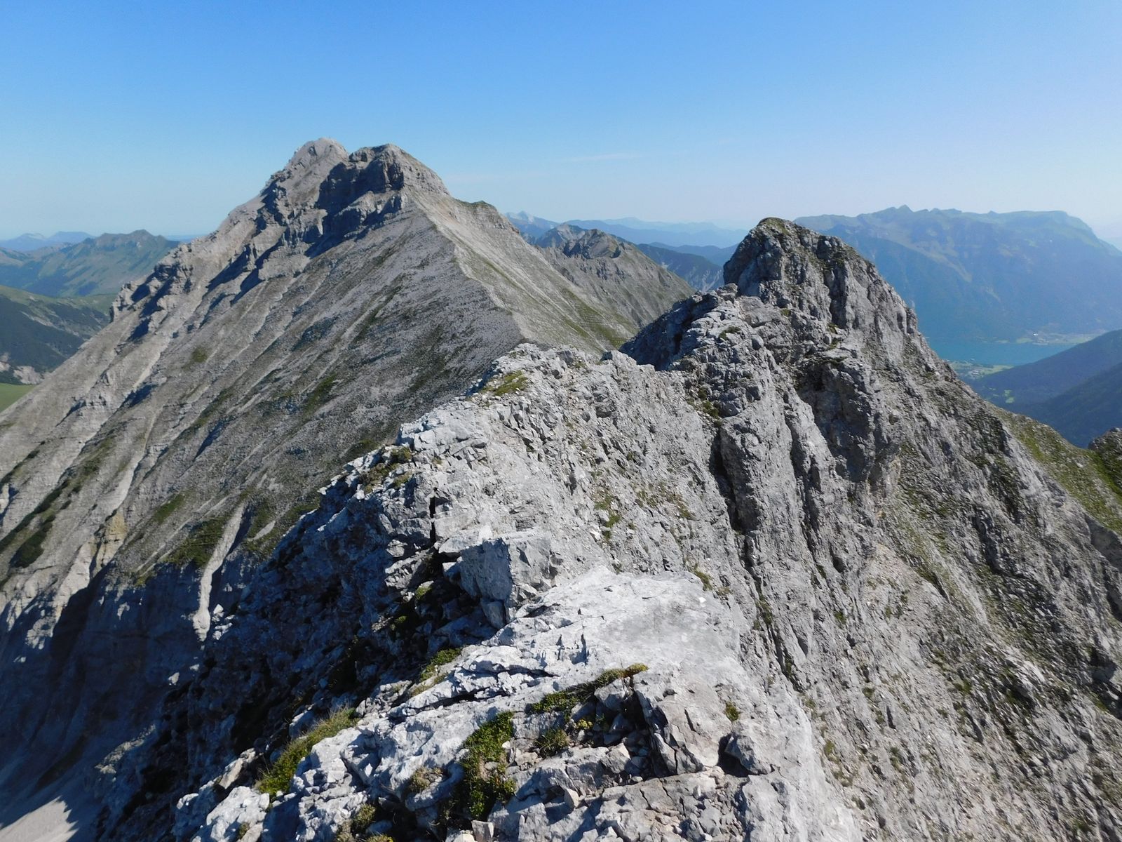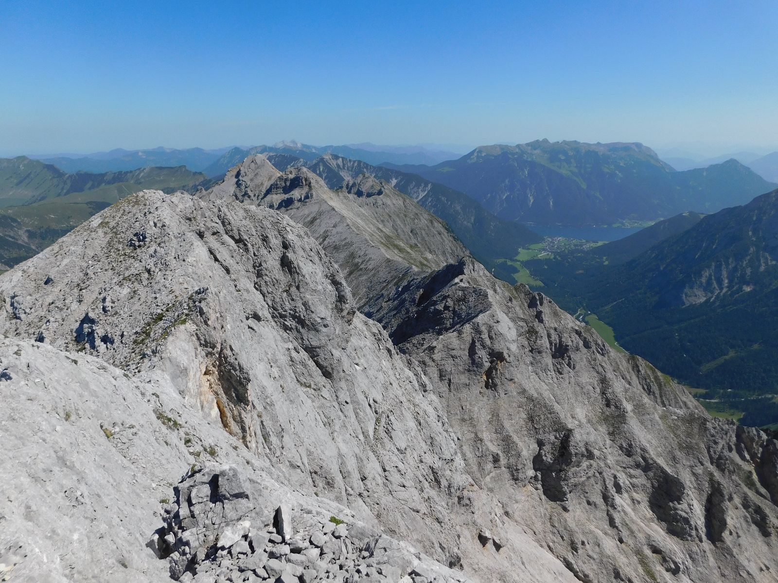 Blick vom Gipfel zurück auf den ganzen Gratverlauf (am Anfang sieht man die 2 Bettlerkarspitze-Gipfel). Hinten rechts sieht man den Achensee: