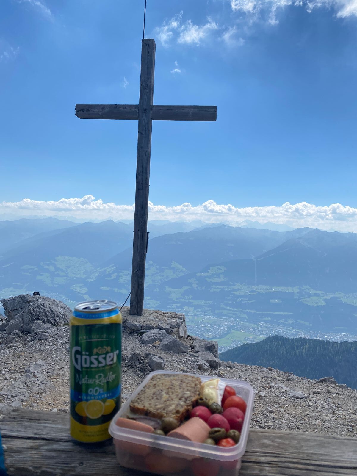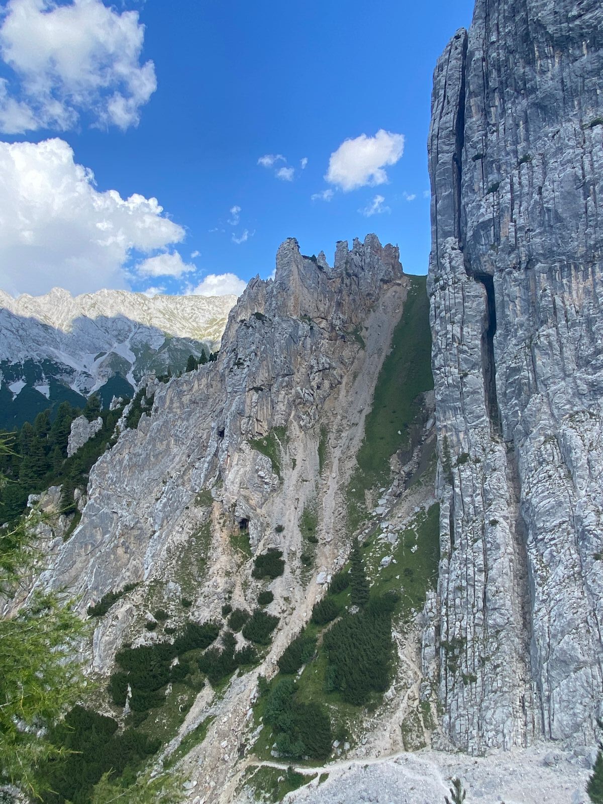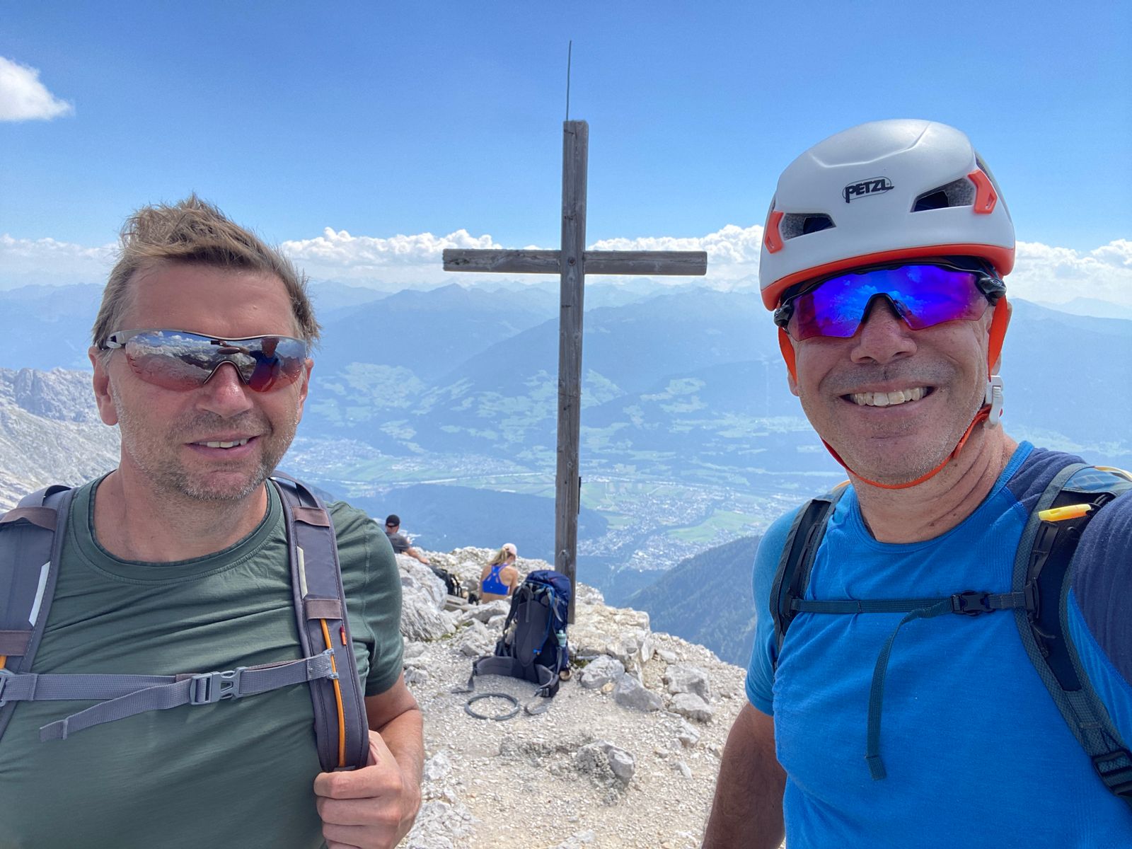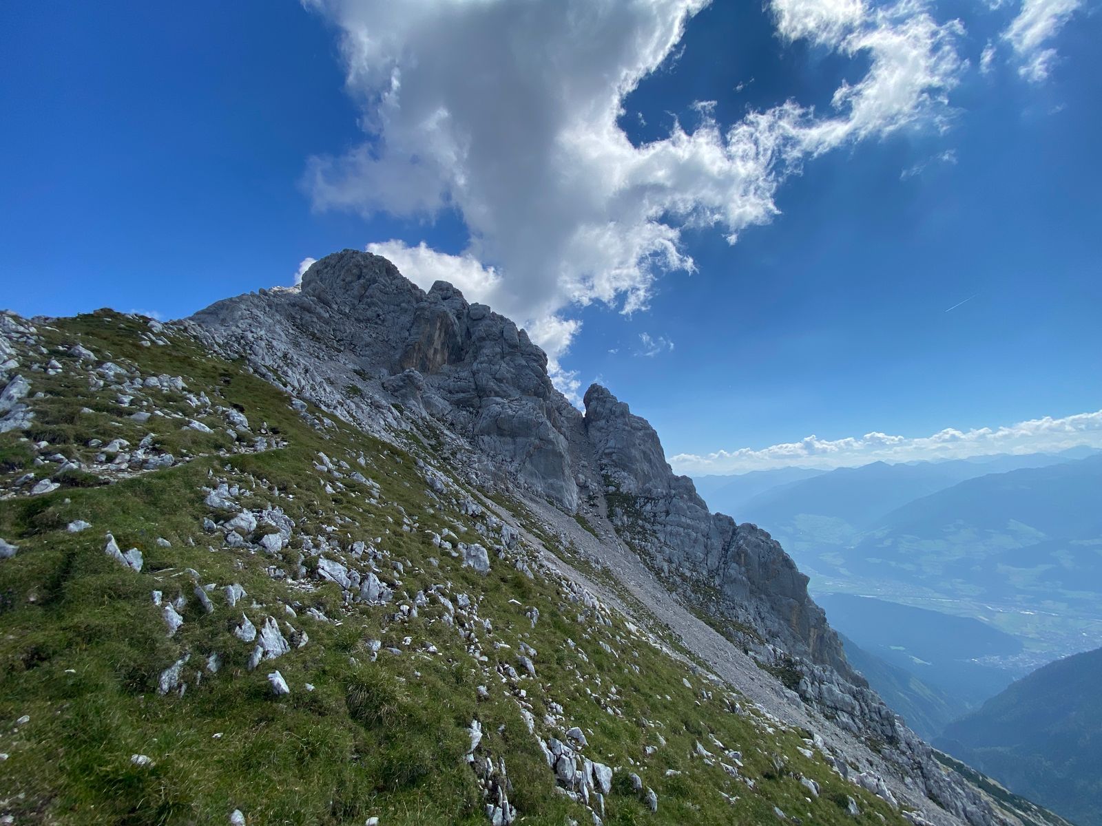 Nach dem Radldepot am Hallerangerhaus sind wir zunächst hinauf zum Lafatscher Joch gewandert, von dort den Südwestgrat hinauf (am Schluss kurze Kletterstellen, I bis II UIAA), nach der Mittagspause den teils mit Drahtseilen bestückten Nordwest-Normalanstieg runter.