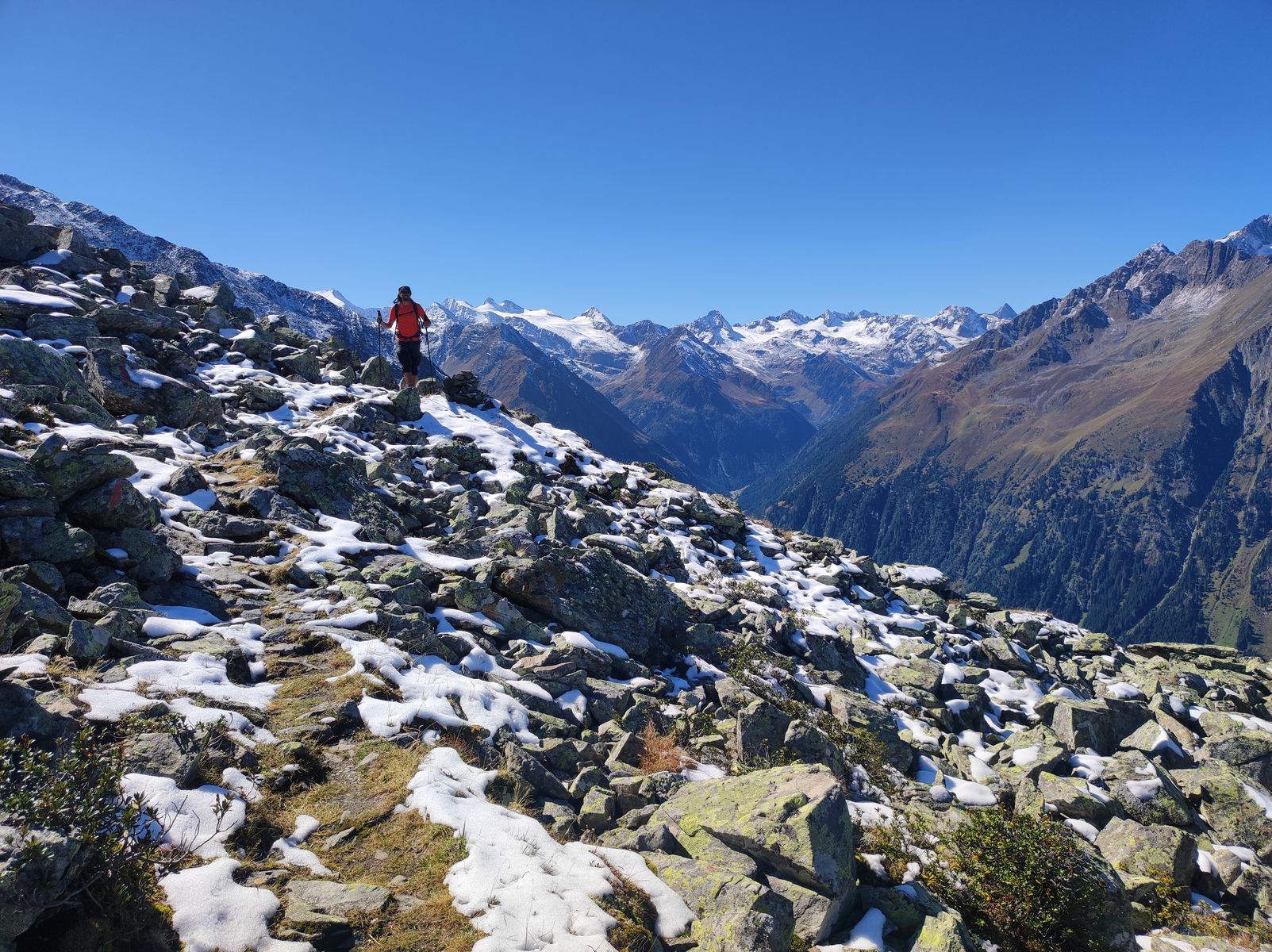 Schneelage: Es hatte zwar bis 2000 Meter heruntergeschneit, aber nur geringe Mengen. Heute Mittag waren ostseitige Hänge schon bis 3000 wieder schneefrei und ich würde von perfekten Tourenbedingungen bis zum nächsten Schneefall ausgehen.