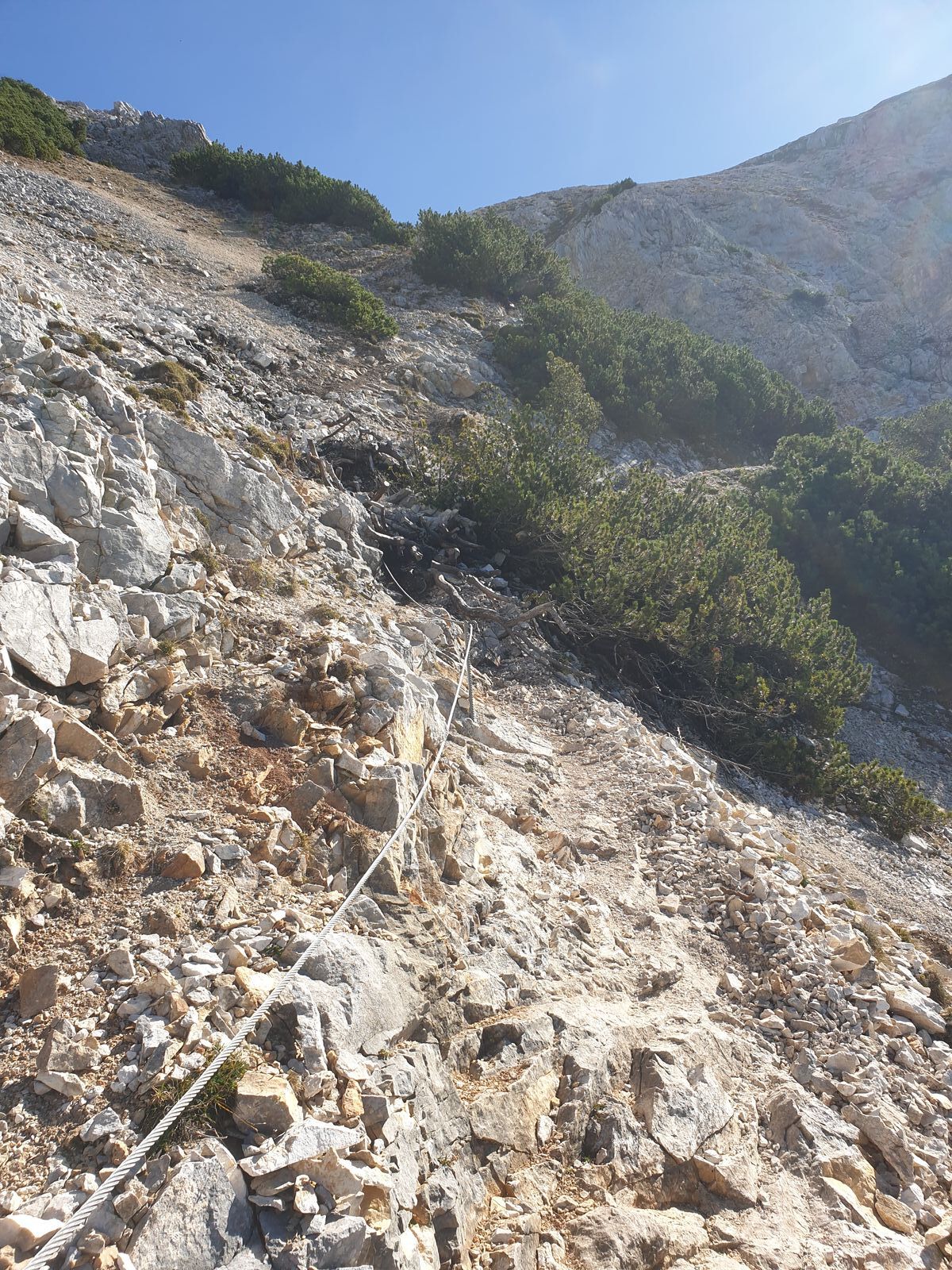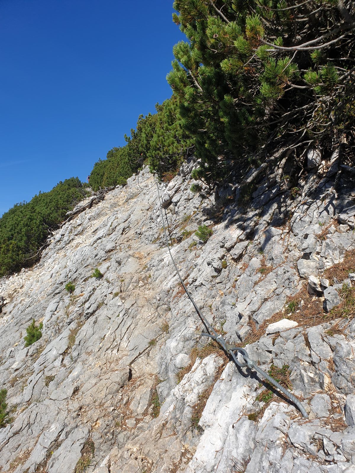 Übrigens: Es heißt ja in der Beschreibung: "über eine 3 Meter lange schmale Stelle im Kar hilft luxuriöser Weise sogar ein Drahtseil hinweg". Hier möchte ich anmerken, dass es neben ein paar sehr kurzen, aber unangenehmen sandigen, leicht abschüssigen Stellen insgesamt ca. 5 Seilversicherungen gibt (wobei man an den meisten Stellen besser an den Fels greif als ans Seil...) Auch davor muss man öfter über Schrofen klettern. Ich würde es ähnlich wie den Kramer einstufen, der jedoch Schwierigkeit "3" hat. Allerdings haben die Touren mit Schwierigkeit "2" generell eine recht große Bandbreite an Schwierigkeitsgrad.
