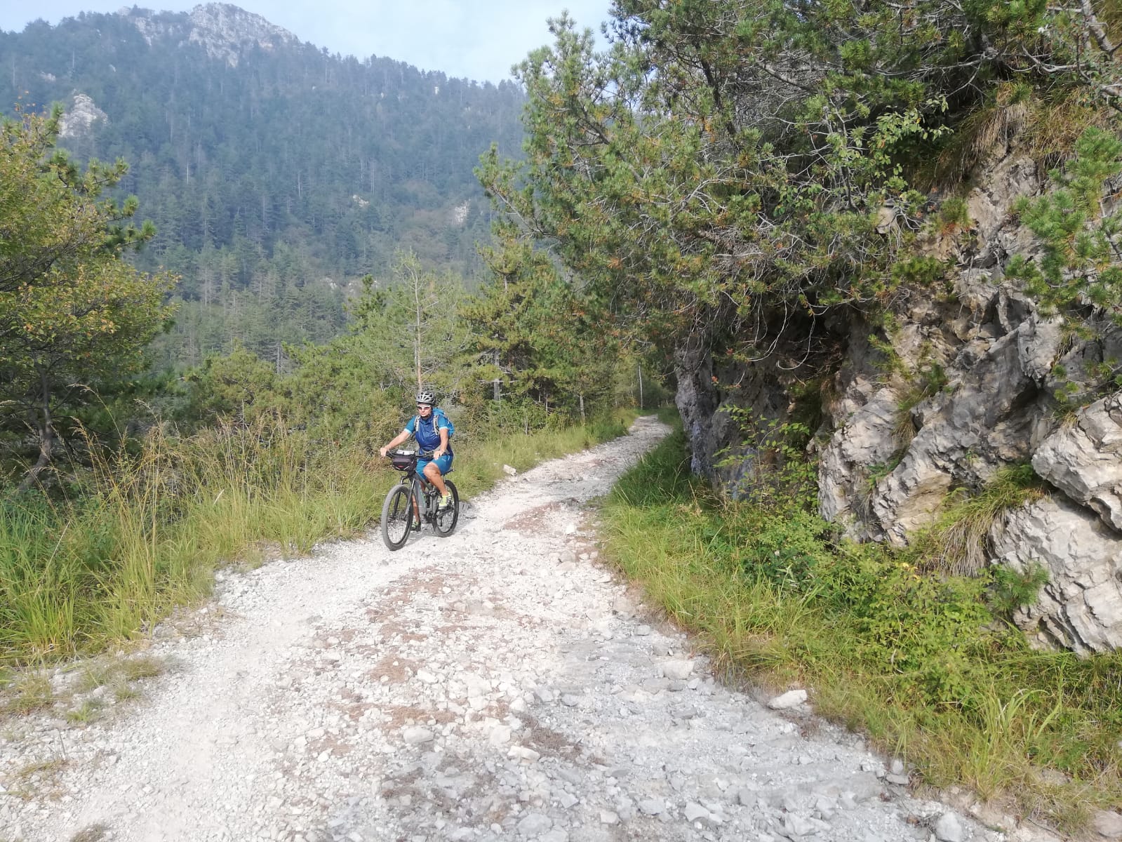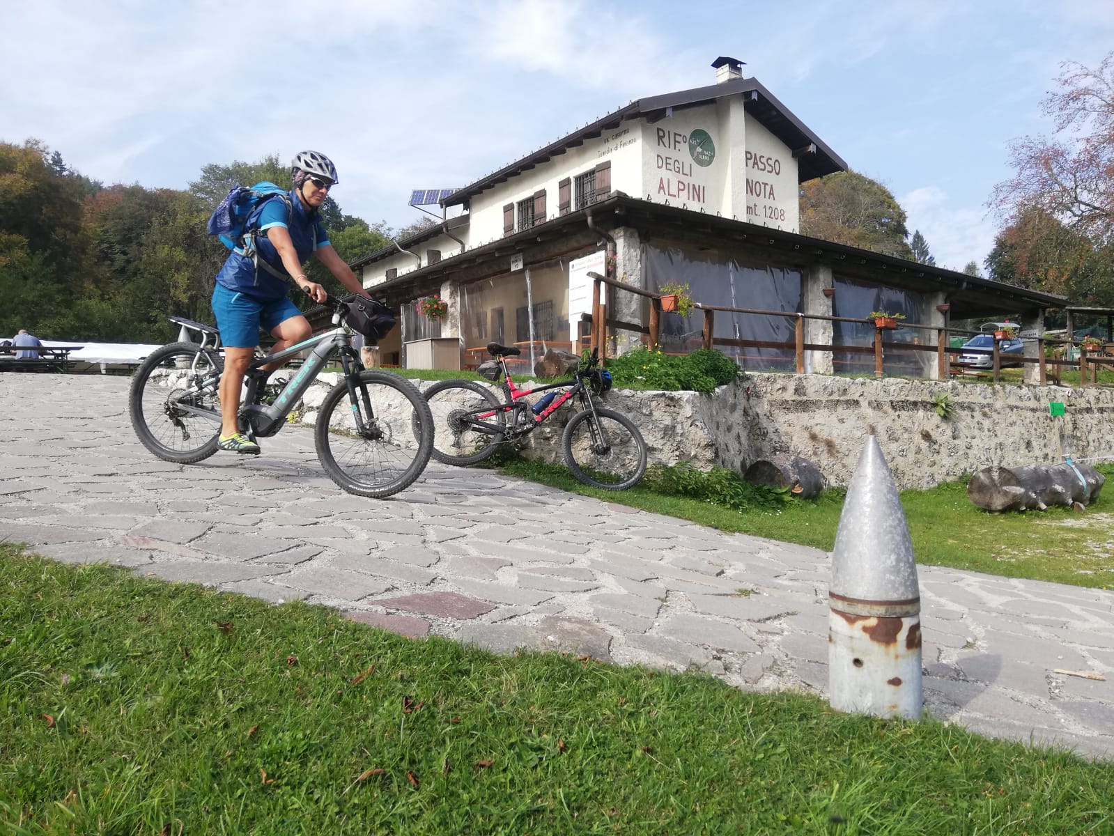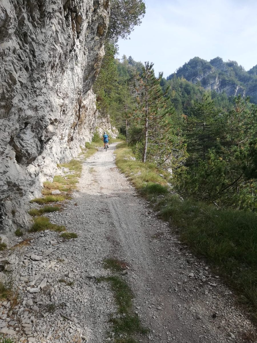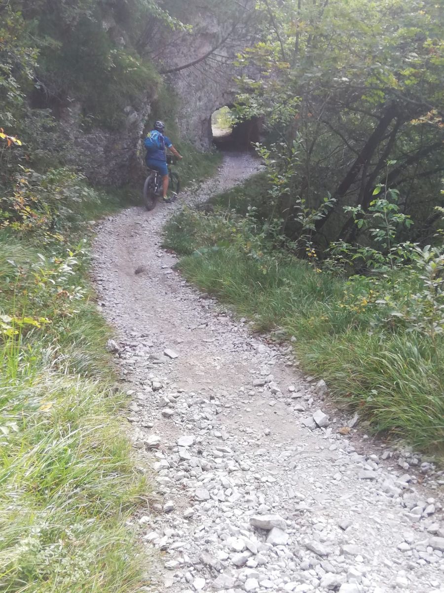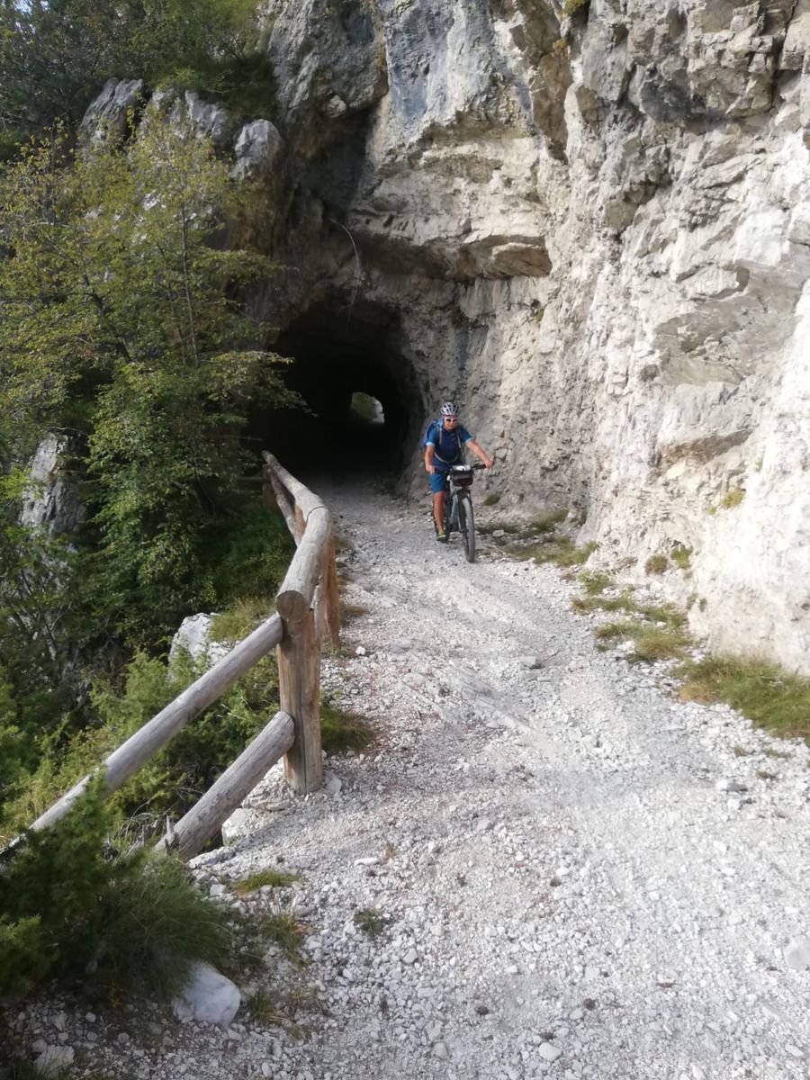 Vom Parkplatz am Beginn des Val di Bondo oberhalb von Vesio, wo man sich nun seit Juni an einer nagelneuen Bar stärken und Räder mieten kann, auf der Teerstraße durch das Tal bis zum Passo Nota (auch Autoverkehr erlaubt, heute aber nichts los) . Das Rifugio hat im Oktober noch täglich von 10-17 Uhr geöffnet. Abfahrt auf der alten Militärstraße entlang der Corna Vecchia. Landschaftlich immer wieder sehr schön mit ihren sechs oder sieben kurzen Tunneln. Der Eindruck über die letzten Jahre ist, dass die Straße langsam, aber sicher immer rauer, ausgewaschener, trailiger wird, was kein Nachteil sein muss, die Tour aber für "Gelegenheits(e)biker", von denen es hier einige gibt und die sich durch die leichte Auffahrt zu dieser Runde verleiten lassen, zu einer Herausforderung machen kann. Die Abfahrtsstrecke endet direkt am Parkplatz am Taleingang.