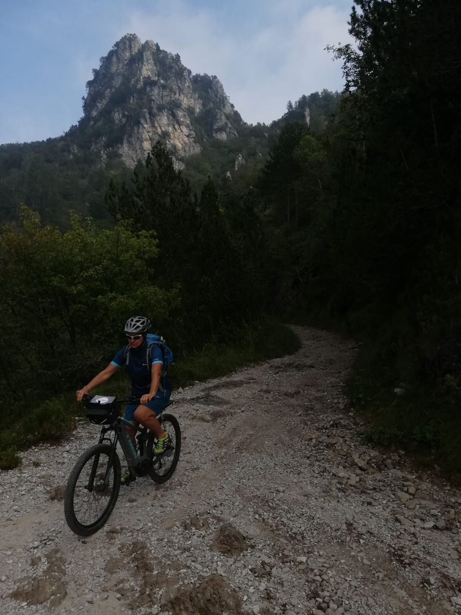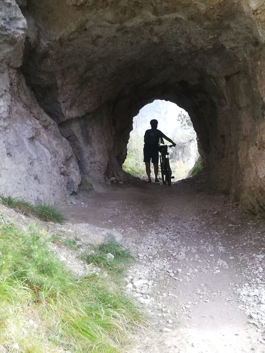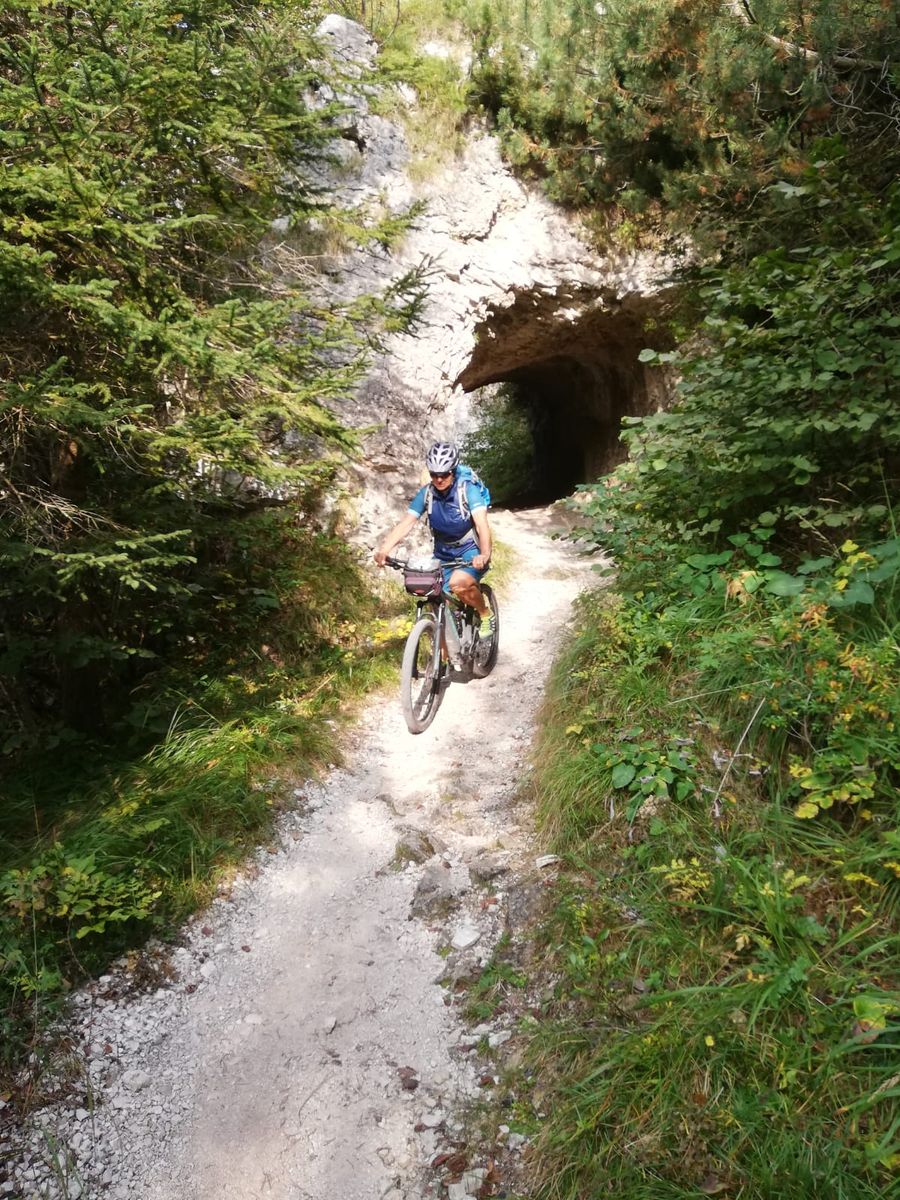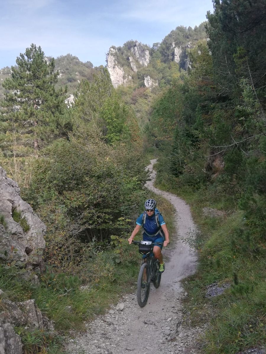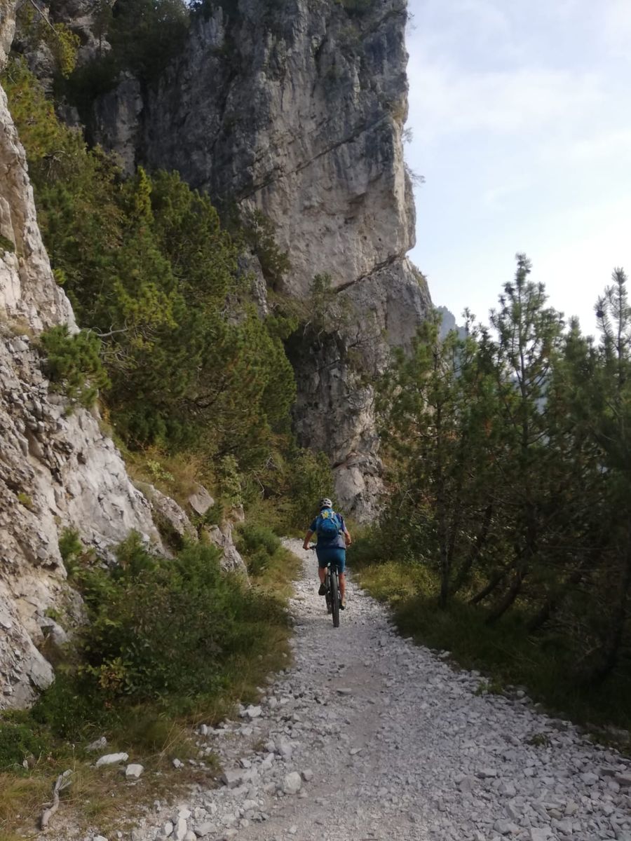 Vom Parkplatz am Beginn des Val di Bondo oberhalb von Vesio, wo man sich nun seit Juni an einer nagelneuen Bar stärken und Räder mieten kann, auf der Teerstraße durch das Tal bis zum Passo Nota (auch Autoverkehr erlaubt, heute aber nichts los) . Das Rifugio hat im Oktober noch täglich von 10-17 Uhr geöffnet. Abfahrt auf der alten Militärstraße entlang der Corna Vecchia. Landschaftlich immer wieder sehr schön mit ihren sechs oder sieben kurzen Tunneln. Der Eindruck über die letzten Jahre ist, dass die Straße langsam, aber sicher immer rauer, ausgewaschener, trailiger wird, was kein Nachteil sein muss, die Tour aber für "Gelegenheits(e)biker", von denen es hier einige gibt und die sich durch die leichte Auffahrt zu dieser Runde verleiten lassen, zu einer Herausforderung machen kann. Die Abfahrtsstrecke endet direkt am Parkplatz am Taleingang.