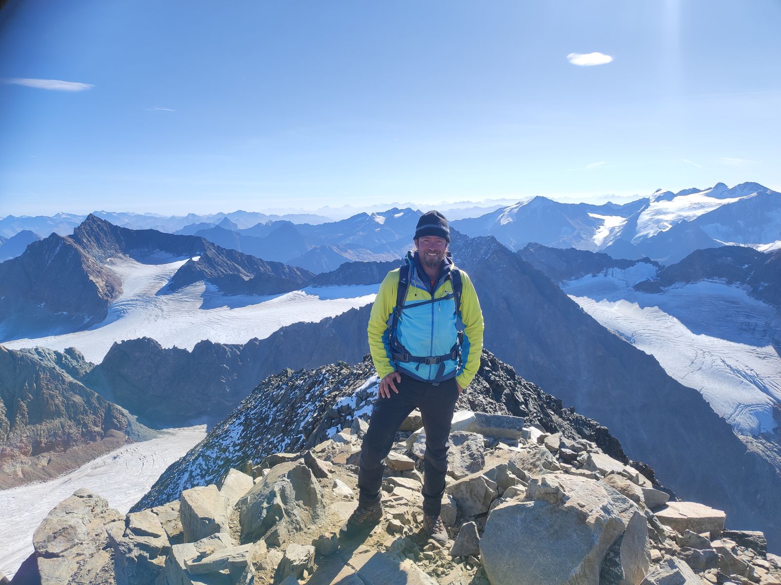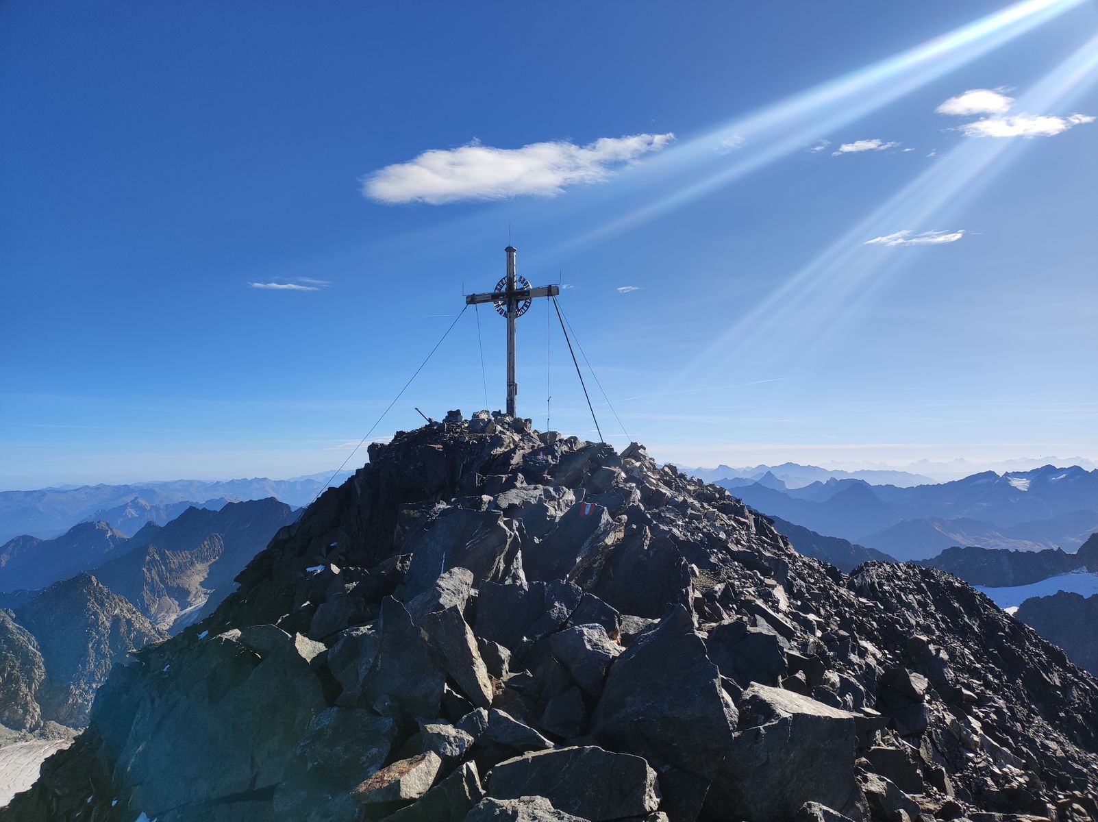 Heute Morgen bin ich schließlich über den Westgrat auf den Schrankogel gestiegen. Eine vor allem vom Panorama her überwältigend schöne Tour und dabei für einen Berg dieser Höhe ziemlich einfach; nur die letzten 300 Höhenmeter sind mit T4 (leichte Kletterei, I) zu bewerten, sonst ist es deutlich einfacher. Als Tagestour vom Tal (2000 Hm) aus läge die Begehungszeit bei 8-11 Stunden (ohne Radl bis zur Amberger).