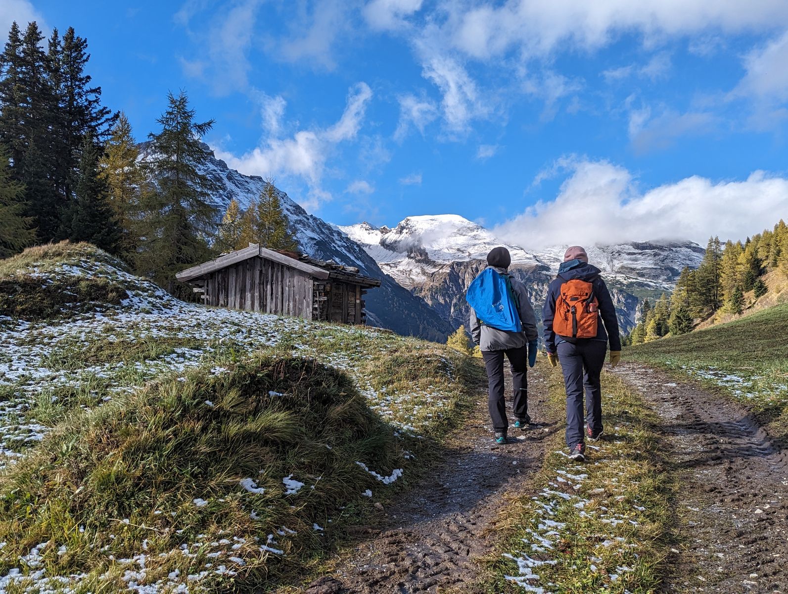 Bis Portjoch war eine Spur vorhanden, danach haben wir selber gespurt. Schneeschuhe sind noch nicht notwendig. Ab Dienstag könnte oberhalb von 2000 m weiterer Schnee hinzukommen.